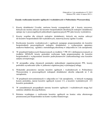 Załącznik nr 1 do zarządzenia nr 22 /2012 Rektora PW z dnia 14 marca 2012 r. Zasady rozliczania kosztów ogólnych i wydziałowych w Politechnice Warszawskiej 1. Koszty działalności Uczelni, zarówno koszty wynagrodzeń, jak i koszty rzeczowe, których nie można zaliczyć do kosztów bezpośrednich określonych rodzajów działalności ujmuje się w poszczególnych jednostkach organizacyjnych PW jako koszty wydziałowe. 2. Koszty wspólne dla różnych rodzajów działalności, których nie można zaliczyć do kosztów bezpośrednich lub wydziałowych, stanowią koszty ogólne Uczelni. 3. Rozliczenie kosztów wydziałowych i ogólnych następuje proporcjonalnie do kosztów bezpośrednich poszczególnych rodzajów działalności, z wyłączeniem aparatury naukowo-badawczej, zgodnie z metodologią określoną w załączniku nr 2 do zarządzenia. 4. W projektach badawczych finansowanych ze środków 7 PR UE i dofinansowywanych ze środków MNiSzW koszty pośrednie rozliczane będą proporcjonalnie do kosztów bezpośrednich z wyłączeniem kosztów podwykonawców (subcontracting) oraz kosztów audytu zewnętrznego. 5. W przypadku usług zlecanych pomiędzy jednostkami organizacyjnymi PW, koszty pośrednie są naliczane tylko w jednostce organizacyjnej wykonującej usługę. 6. Wskaźniki procentowe narzutu kosztów ogólnych i wydziałowych w Politechnice Warszawskiej w poszczególnych rodzajach działalności określa załącznik nr 3 do zarządzenia. 7. W projektach niewymienionych w załączniku nr 3 do zarządzenia, w których występują koszty pośrednie, narzut kosztów ogólnych wynosi 1/3, a kosztów wydziałowych 2/3 kosztów pośrednich. 8. W uzasadnionych przypadkach narzuty kosztów ogólnych i wydziałowych mogą być ustalone odrębnie decyzją Rektora. 9. Różnica wynikająca z rozliczenia kosztów ogólnych na koniec roku obrotowego przenoszona jest bezpośrednio na konto wyniku finansowego. Załącznik nr 2 do zarządzenia nr 22 /2012 Rektora PW z dnia 14 marca 2012 r. Metodologia wyliczania średniego wskaźnika kosztów pośrednich dla podstawowej jednostki organizacyjnej Politechniki Warszawskiej (wydziału). Kosztami pośrednimi na uczelni są koszty ogólne i koszty wydziałowe. Koszty działalności uczelni, zarówno koszty wynagrodzeń, jak i koszty rzeczowe, których nie można zaliczyć do kosztów bezpośrednich określonych rodzajów działalności ujmuje się w poszczególnych jednostkach organizacyjnych uczelni jako koszty wydziałowe. Koszty wspólne dla wszystkich rodzajów działalności, których nie można zaliczyć do kosztów bezpośrednich lub wydziałowych, stanowią koszty ogólne Uczelni. Rozliczenie kosztów wydziałowych i ogólnych następuje proporcjonalnie do sumy kosztów bezpośrednich poszczególnych rodzajów działalności, z wyłączeniem aparatury naukowobadawczej. Koszty pośrednie rozliczane są w sposób ryczałtowy. Sposób wyliczenia rocznego wskaźnika narzutu kosztów pośrednich dla poszczególnych wydziałów: wskaźnik kosztów ogólnych dla uczelni = wskaźnik kosztów wydziałowych danego wydziału = wskaźnik kosztów pośrednich dla danego wydziału = suma kosztów ogólnych suma kosztów bezpośrednich wszystkich rodzajów działalności aparatura naukowo-badawcza suma kosztów wydziałowych danego wydziału suma kosztów bezpośrednich wszystkich rodzajów działalności wydziału aparatura naukowobadawcza wskaźnik kosztów ogólnych dla Uczelni + wskaźnik kosztów wydziałowych danego wydziału Załącznik nr 3 do zarządzenia nr 22 /2012 Rektora PW z dnia 14 marca 2012 r. Wskaźniki kosztów ogólnych i wydziałowych w Politechnice Warszawskiej Rodzaj działalności Lp. 1. Koszty wydziałowe [%] Dydaktyka: 1) finansowana z dotacji MNiSzW 2. 3. Koszty ogólne [%] 2) pozostała dydaktyka Działalność statutowa Dofinansowanie współpracy naukowej z zagranicą Odpis kwotowy 12 20 10 Wynikowo Wynikowo 20 20 4. Dofinansowanie 7PR UE w ramach współpracy naukowej z zagranicą1) 20 40 5. Projekty badawcze finansowane przez MNiSzW, NCN i NCBR 10 20 6. Projekty promotorskie 0 10 7. Projekty celowe 10 8. Działalność badawcza umowna 8 20 Zgodnie z decyzją kierownika jednostki organizacyjnej 9. Projekty badawcze finansowane ze środków 7 PR UE1) 20 40 10. 11. 12. 13. Współpraca w formie sieci naukowej Działalność pomocnicza Działalność domów studenckich Programy dydaktyczne finansowane ze środków UE 0 6 6 0 14. Konferencje i seminaria naukowe 6 15. 16. Projekty finansowane z funduszy strukturalnych 2) Granty rektorskie dla kół naukowych Środki na przygotowanie wniosku projektowego do programu badawczego UE Projekty w ramach funduszu szwajcarskiego Projekty Norweskiego Mechanizmu Finansowego 0 0 0 0 0 0 Zgodnie z decyzją kierownika jednostki organizacyjnej 0 0 0 0 5 0 5 0 17. 18. 19. l) 2) W projektach, w których suma kosztów pośrednich jest mniejsza od 60 %, narzut kosztów ogólnych wynosi 1/3, a kosztów wydziałowych 2/3 kosztów pośrednich. W projektach strukturalnych, w których są dopuszczone ryczałtowe koszty pośrednie 1/3 stanowią koszty ogólne, 2/3 koszty wydziałowe.
