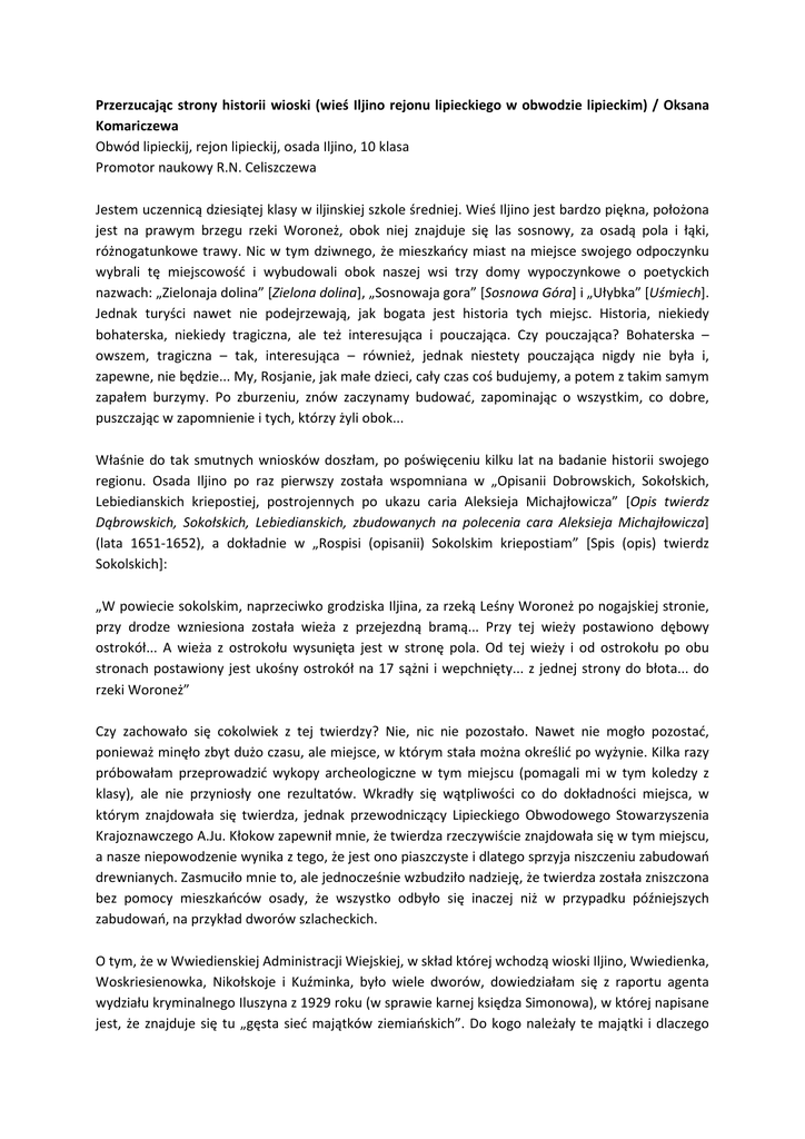 Przerzucając strony historii wioski (wieś Iljino rejonu lipieckiego w obwodzie lipieckim) / Oksana Komariczewa Obwód lipieckij, rejon lipieckij, osada Iljino, 10 klasa Promotor naukowy R.N. Celiszczewa Jestem uczennicą dziesiątej klasy w iljinskiej szkole średniej. Wieś Iljino jest bardzo piękna, położona jest na prawym brzegu rzeki Woroneż, obok niej znajduje się las sosnowy, za osadą pola i łąki, różnogatunkowe trawy. Nic w tym dziwnego, że mieszkańcy miast na miejsce swojego odpoczynku wybrali tę miejscowość i wybudowali obok naszej wsi trzy domy wypoczynkowe o poetyckich nazwach: „Zielonaja dolina” [Zielona dolina], „Sosnowaja gora” [Sosnowa Góra] i „Ułybka” [Uśmiech]. Jednak turyści nawet nie podejrzewają, jak bogata jest historia tych miejsc. Historia, niekiedy bohaterska, niekiedy tragiczna, ale też interesująca i pouczająca. Czy pouczająca? Bohaterska – owszem, tragiczna – tak, interesująca – również, jednak niestety pouczająca nigdy nie była i, zapewne, nie będzie... My, Rosjanie, jak małe dzieci, cały czas coś budujemy, a potem z takim samym zapałem burzymy. Po zburzeniu, znów zaczynamy budować, zapominając o wszystkim, co dobre, puszczając w zapomnienie i tych, którzy żyli obok... Właśnie do tak smutnych wniosków doszłam, po poświęceniu kilku lat na badanie historii swojego regionu. Osada Iljino po raz pierwszy została wspomniana w „Opisanii Dobrowskich, Sokołskich, Lebiedianskich kriepostiej, postrojennych po ukazu caria Aleksieja Michajłowicza” [Opis twierdz Dąbrowskich, Sokołskich, Lebiedianskich, zbudowanych na polecenia cara Aleksieja Michajłowicza] (lata 1651-1652), a dokładnie w „Rospisi (opisanii) Sokolskim kriepostiam” [Spis (opis) twierdz Sokolskich]: „W powiecie sokolskim, naprzeciwko grodziska Iljina, za rzeką Leśny Woroneż po nogajskiej stronie, przy drodze wzniesiona została wieża z przejezdną bramą... Przy tej wieży postawiono dębowy ostrokół... A wieża z ostrokołu wysunięta jest w stronę pola. Od tej wieży i od ostrokołu po obu stronach postawiony jest ukośny ostrokół na 17 sążni i wepchnięty... z jednej strony do błota... do rzeki Woroneż” Czy zachowało się cokolwiek z tej twierdzy? Nie, nic nie pozostało. Nawet nie mogło pozostać, ponieważ minęło zbyt dużo czasu, ale miejsce, w którym stała można określić po wyżynie. Kilka razy próbowałam przeprowadzić wykopy archeologiczne w tym miejscu (pomagali mi w tym koledzy z klasy), ale nie przyniosły one rezultatów. Wkradły się wątpliwości co do dokładności miejsca, w którym znajdowała się twierdza, jednak przewodniczący Lipieckiego Obwodowego Stowarzyszenia Krajoznawczego A.Ju. Kłokow zapewnił mnie, że twierdza rzeczywiście znajdowała się w tym miejscu, a nasze niepowodzenie wynika z tego, że jest ono piaszczyste i dlatego sprzyja niszczeniu zabudowań drewnianych. Zasmuciło mnie to, ale jednocześnie wzbudziło nadzieję, że twierdza została zniszczona bez pomocy mieszkańców osady, że wszystko odbyło się inaczej niż w przypadku późniejszych zabudowań, na przykład dworów szlacheckich. O tym, że w Wwiedienskiej Administracji Wiejskiej, w skład której wchodzą wioski Iljino, Wwiedienka, Woskriesienowka, Nikołskoje i Kuźminka, było wiele dworów, dowiedziałam się z raportu agenta wydziału kryminalnego Iluszyna z 1929 roku (w sprawie karnej księdza Simonowa), w której napisane jest, że znajduje się tu „gęsta sieć majątków ziemiańskich”. Do kogo należały te majątki i dlaczego zostały zniszczone? Na mapie powiatu lipieckiego guberni tambowskiej, sporządzonej w 1911 roku przez Lipeckie Ziemstwo Gminne, ukazane zostały następujące dwory: Dwór Tatarnikowej we wsi Woskriesienowka (dwór nie zachował się, pozostały tylko nazwy „Tatarnikowa łoszczyna” [Tatarnikowski parów] i „Tatarnikow chutor” [Tatarnikowski chutor] i część ogrodu). Dwór Fiodorowa we wsi Wwiedienka (w miejscu dworu mieści się Wwiedienskij Ośrodek Gerontologiczny, zachował się wyschnięty staw, kilka drzew z sadu owocowego). Dwór Romanowskiego we wsi Iljino (zachował się dom, szopa, część parku, w budynku obecnie mieści się szpital dzielnicowy). Dwór Kochlewskiego we wsi Bolszaja Kuźminka (zachował się staw, piwnica i szopa przebudowana przez potomków Kochlewskich w dom mieszkalny). Dwór Natarowej we wsi Bolszaja Kuźminka (dwór został zniszczony, nic się nie zachowało). Ze wszystkich wymienionych dworów, zachował się tylko dwór Romanowskiego we wsi Iljino. We wsi jest on znany pod inną nazwą, jako dwór Golenowskiego. Ulicę biegnącą od domu powszechnie nazywa się Golenowką. Dom rzeczywiście należał do porucznika Dmitrija Iwanowicza Golenowskiego, mieszkającego tutaj ze swoją żoną Aleksandrą Piotrowną Golenowską (nazwisko rodowe: Plechanowa, ciocia Gieorgija Walentinowicza Plechanowa) i dziećmi na początku XIX wieku. Po śmierci żony w 1839 roku, Golenowskij jeszcze długo zamieszkiwał we dworze, ale gdy dzieci dorosły i opuściły Iljino w 1851 roku, sprzedał dom księdzu Michaiłowi Grigorjewiczowi Romanowskiemu, który władał majątkiem do 1912 roku, do przeprowadzki do wsi Sokołskoje. Dom był dzierżawiony pod centrum agronomiczne i wypożyczalnię, a od 1919 roku znajdował się tam wydział sanitarnomedyczny. Obecnie w budynku znajduje się wwiedienski szpital dzielnicowy. Dwór nie został zniszczony tylko dlatego, że już przed rewolucją nie był własnością prywatną. Pozostałe nie zachowały się, ponieważ w czasie rewolucji należały do osób prywatnych. I, o ile dobrze zrozumiałam, wszystko, co jest pozostawione bez prawdziwego gospodarza szybko jest rozkradane przez mieszkańców. Nie wiem, czy to kwestia złych intencji czy zwykłego bałaganiarstwa naszego narodu, ale fakt pozostaje faktem: prawie wszystkie z najbogatszych dworów szlacheckich zostały doszczętnie zniszczone