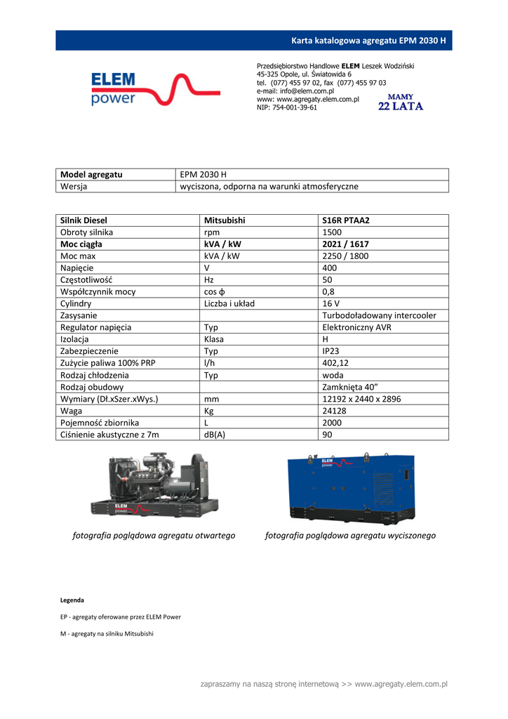 Karta katalogowa agregatu EPM 2030 H Silnik Diesel Mitsubishi
