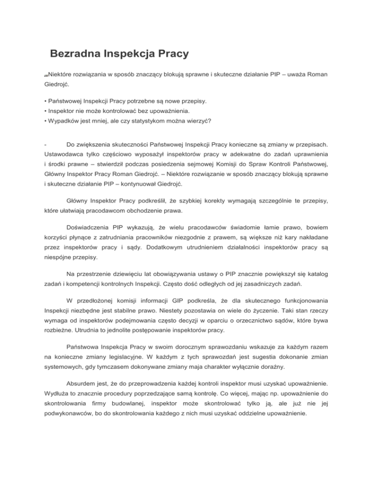 Bezradna Inspekcja Pracy Niektóre rozwiązania w sposób znaczący blokują sprawne i skuteczne działanie PIP – uważa Roman Giedrojć. • Państwowej Inspekcji Pracy potrzebne są nowe przepisy. • Inspektor nie może kontrolować bez upoważnienia. • Wypadków jest mniej, ale czy statystykom można wierzyć? - Do zwiększenia skuteczności Państwowej Inspekcji Pracy konieczne są zmiany w przepisach. Ustawodawca tylko częściowo wyposażył inspektorów pracy w adekwatne do zadań uprawnienia i środki prawne – stwierdził podczas posiedzenia sejmowej Komisji do Spraw Kontroli Państwowej, Główny Inspektor Pracy Roman Giedrojć. – Niektóre rozwiązanie w sposób znaczący blokują sprawne i skuteczne działanie PIP – kontynuował Giedrojć. Główny Inspektor Pracy podkreślił, że szybkiej korekty wymagają szczególnie te przepisy, które ułatwiają pracodawcom obchodzenie prawa. Doświadczenia PIP wykazują, że wielu pracodawców świadomie łamie prawo, bowiem korzyści płynące z zatrudniania pracowników niezgodnie z prawem, są większe niż kary nakładane przez inspektorów pracy i sądy. Dodatkowym utrudnieniem działalności inspektorów pracy są niespójne przepisy. Na przestrzenie dziewięciu lat obowiązywania ustawy o PIP znacznie powiększył się katalog zadań i kompetencji kontrolnych Inspekcji. Często dość odległych od jej zasadniczych zadań. W przedłożonej komisji informacji GIP podkreśla, że dla skutecznego funkcjonowania Inspekcji niezbędne jest stabilne prawo. Niestety pozostawia on wiele do życzenie. Taki stan rzeczy wymaga od inspektorów podejmowania często decyzji w oparciu o orzecznictwo sądów, które bywa rozbieżne. Utrudnia to jednolite postępowanie inspektorów pracy. Państwowa Inspekcja Pracy w swoim dorocznym sprawozdaniu wskazuje za każdym razem na konieczne zmiany legislacyjne. W każdym z tych sprawozdań jest sugestia dokonanie zmian systemowych, gdy tymczasem dokonywane zmiany maja charakter wyłącznie doraźny. Absurdem jest, że do przeprowadzenia każdej kontroli inspektor musi uzyskać upoważnienie. Wydłuża to znacznie procedury poprzedzające samą kontrolę. Co więcej, mając np. upoważnienie do skontrolowania firmy budowlanej, inspektor może skontrolować tylko ją, ale już nie jej podwykonawców, bo do skontrolowania każdego z nich musi uzyskać oddzielne upoważnienie. Dość częstym sposobem unikania przez pracodawców kontroli jest rezygnacja członków zarządu i niepowoływanie nowych, co praktycznie uniemożliwia rozpoczęcie kontroli. Inspektorzy pracy skarżą się też na niewystarczające uprawnienia w zakresie kontroli nielegalnego zatrudnienia. Nie maja np. możliwości dokonania wstępnych czynności rozpoznawczych poprzedzających zasadnicza kontrole i wykorzystania zdobytych w ten sposób informacji. Nie mają też uprawnień do zasięgania informacji od osób postronnych, co ma bardzo duże znaczenie w badaniu przyczyn wypadków przy pracy oraz nielegalnego zatrudnienia.