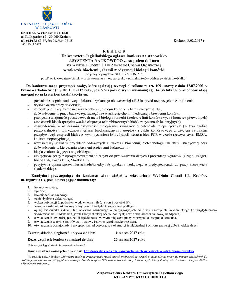 DZIEKAN WYDZIAŁU CHEMII ul. R. Ingardena 3, 30-060 Kraków tel. 012/633-63-77, fax 012/634-05-15 Kraków, 8.02.2017 r. 405.1101.1.2017 REKTOR Uniwersytetu Jagiellońskiego ogłasza konkurs na stanowisko ASYSTENTA NAUKOWEGO ze stopniem doktora na Wydziale Chemii UJ w Zakładzie Chemii Organicznej w zakresie biochemii, chemii medycznej i biologii komórki do pracy w projekcie NCN SYMFONIA 2 pt. „Przejściowe stany białek w projektowaniu niskocząsteczkowych inhibitorów oddziaływań białko-białko” Do konkursu mogą przystąpić osoby, które spełniają wymogi określone w art. 109 ustawy z dnia 27.07.2005 r. Prawo o szkolnictwie (t. j. Dz. U. z 2012 roku, poz. 572 z późniejszymi zmianami) i § 164 Statutu UJ oraz odpowiadają następującym kryteriom kwalifikacyjnym: - - posiadanie stopnia naukowego doktora uzyskanego nie wcześniej niż 5 lat przed rozpoczęciem zatrudnienia, wysoka ocena pracy doktorskiej, dorobek publikacyjny z dziedziny biochemii, biologii komórki, chemii medycznej itp., doświadczenie w pracy badawczej, szczególnie w zakresie chemii medycznej i biochemii komórki, praktyczna znajomość podstawowych metod biologii komórki (hodowle linii komórkowych i komórek pierwotnych) oraz chemii białek (projektowanie i ekspresja rekombinowanych białek w systemach bakteryjnych), doświadczenie w oznaczaniu aktywności biologicznej związków o potencjale terapeutycznym (w tym analiza przeżywalności i toksyczności testami biochemicznymi, apoptozy i cyklu komórkowego z użyciem cytometrii przepływowej, ekspresji białek z wykorzystaniem hybrydyzacji western blot, PCR w czasie rzeczywistym, EMSA, ko-immunoprecypitacja), wcześniejszy udział w projektach badawczych z zakresu: biochemii, biotechnologii lub chemii medycznej oraz doświadczenie w kierowaniu własnymi projektami badawczymi, biegła znajomość języka angielskiego, umiejętność pracy z oprogramowaniem służącym do przetwarzania danych i prezentacji wyników (Origin, ImageJ, Image Lab, FACS Diva, ModFit LT), pozytywna opinia kierownika zakładu/katedry lub opiekuna naukowego o predyspozycjach do pracy nauczyciela akademickiego. Kandydaci przystępujący do konkursu winni złożyć w sekretariacie Wydziału Chemii UJ, Kraków, ul. Ingardena 3, pok. 2 następujące dokumenty: 1. 2. 3. 4. 5. 6. 7. list motywacyjny, życiorys, kwestionariusz osobowy, odpis dyplomu doktorskiego, wykaz publikacji (z podaniem wydawnictwa i ilości stron i wartości IF), formularz ostatniej okresowej oceny, jeżeli kandydat takiej ocenie podlegał, opinię kierownika zakładu lub opiekuna naukowego o predyspozycjach do pracy nauczyciela akademickiego (z uwzględnieniem wyników ankiet studenckich, jeżeli kandydat takiej ocenie podlegał) oraz o działalności naukowej kandydata, 8. oświadczenie stwierdzające, że UJ będzie podstawowym miejscem pracy w przypadku wygrania konkursu, 9. oświadczenie w trybie art. 109 ust. 1 ustawy Prawo o szkolnictwie wyższym, 10. oświadczenie o znajomości i akceptacji zasad dotyczących własności intelektualnej i ochrony prawnej dóbr intelektualnych. Termin składania zgłoszeń upływa z dniem 10 marca 2017 roku Rozstrzygnięcie konkursu nastąpi do dnia 23 marca 2017 roku Uniwersytet Jagielloński nie zapewnia mieszkań. Druki oświadczeń można pobrać na stronie: http://www.dso.uj.edu.pl/druki-do-pobrania/dokumenty-dla-kandydatow-pracownikow Na podaniu należy dopisać: „Wyrażam zgodę na przetwarzanie moich danych osobowych zawartych w mojej ofercie pracy dla potrzeb niezbędnych do realizacji procesu rekrutacji” (zgodnie z ustawą z dnia 29 sierpnia 1997 roku o ochronie danych osobowych, tekst jednolity: Dz.U. z 2015 roku, poz. 2135 z późniejszymi zmianami). Z upoważnienia Rektora Uniwersytetu Jagiellońskiego DZIEKAN WYDZIAŁU CHEMII UJ