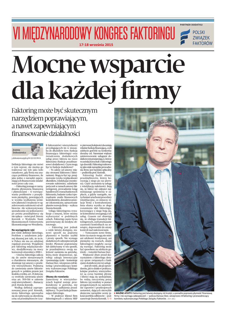 PARTNER DODATKU VI MIĘDZYNARODOWY KONGRES FAKTORINGU 17-18 września 2015 Mocne wsparcie dla każdej firmy Faktoring może być skutecznym narzędziem poprawiającym, a nawet zapewniającym finansowanie działalności Joanna Dobosiewicz [email protected] 22-333-99-31 Definicja faktoringu nie mówi o tym wprost, ale można go traktować nie tyle jako koło ratunkowe, gdy firma ma znaczące problemy finansowe, ile jako jedno z narzędzi zapewniających finansowanie działalności przez cały czas. — Faktoring pomaga w zarządzaniu płynnością finansową i płatnościami — w rozwiązywaniu problemów z przepływem pieniędzy, powstających w wyniku wydłużenia terminów płatności i trudności w egzekwowaniu należności od odbiorców. Ale wykorzystywany sporadycznie czy jednorazowo po prostu przedsiębiorcy się nie opłaca — mówi prof. Dorota Korenik z Wydziału Nauk Ekonomicznych Uniwersytetu Ekonomicznego we Wrocławiu. Na wyciągnięcie ręki Jest wiele definicji faktoringu. Problem z ustaleniem jedynej słusznej jest taki, że m.in. w Polsce nie ma on odrębnej regulacji prawnej. Wyjątkiem jest faktoring międzynarodowy, skodyfikowany na mocy konwencji ottawskiej z 1988 r. — Umowę faktoringu zalicza się do umów nienazwanych o charakterze mieszanym, ale dominuje typ umowy o przelewie wierzytelności. Podstawą do zawierania umów faktoringowych w polskim prawie jest Kodeks cywilny, art. 35 dotyczący swobody zawierania umów oraz art. 509-516 w zakresie cesji wierzytelności — tłumaczy prof. Dorota Korenik. Według definicji zaproponowanej przez prof. Korenik, istota faktoringu sprowadza się do nabywania za określoną cenę od przedsiębiorców (czy- li faktorantów) wierzytelności przysługujących im w stosunku do dłużników (tzw. funkcja finansująca faktoringu) oraz świadczenia dodatkowych usług przez faktora na rzecz faktoranta (funkcje pozafinansowe i dodatkowe). Czym mogą być te funkcje dodatkowe? — To zależy od umowy między stronami (faktorem i faktorantem). Mogą to być np. przejmowanie ryzyka wypłacalności dłużników, windykacja i monitorowanie należności, udzielanie pożyczek w ramach umowy faktoringowej, prowadzenie ksiąg handlowych i rozrachunkowych faktoranta, badanie rynku i sporządzanie analiz finansowych kontrahentów, doradztwo prawne i ekonomiczne, opracowanie planów rozwoju firmy — wylicza Dorota Korenik. Usługa faktoringowa rywalizuje z innymi, które można wykorzystać w podobnych celach. Faktoring często bywa porównywany do kredytu obrotowego. — Faktoring jest jednak o wiele łatwiej dostępny, stanowi sposób na poprawę płynności w bardzo szybki i prosty sposób. Nie wymaga dodatkowych zabezpieczeń jak kredyt. Płynność poprawiamy lub zdobywamy w ten sposób, że przedsiębiorca swoją należność zamienia na gotówkę, którą może dysponować, np. robiąc zakupy inwestycyjne i pomnażając zyski — komentuje Dariusz Steć, wiceprezes mFaktoring i przewodniczący komitetu wykonawczego Polskiego Związku Faktorów. Obawy do rozwiania Zamrożony w wierzytelnościach kapitał zostaje przekształcony w gotówkę, nie powodując zadłużenia przedsiębiorcy. To jest funkcja finansująca faktoringu. — W praktyce klienci firm faktoringowych z sektora MSP w pierwszej kolejności doceniają właśnie funkcję finansującą, czyli zdobycie gotówki na konkretny doraźny cel. Natomiast większe zainteresowanie usługami dodatkowymi przejawiają ci, którzy wcześniej korzystali z faktoringu i go docenili. Faktoring traktowany jako stałe narzędzie prowadzenia firmy jest bardziej opłacalny — podkreśla prof. Korenik. Faktoring budzi obawy przedsiębiorców, którzy korzystają z niego po raz pierwszy. Część utożsamia tę usługę z windykacją należności. Boją się, że faktor nie odpuści najmniejszego spóźnienia w zapłacie, a gdyby nastąpiło, natychmiast uruchomi procedury windykacyjne, co zniszczy relacje firmy z kontrahentami. Inna obawa wynika ze złego rozumienia idei faktoringu: korzystający z niego boją się, że kontrahenci zrezygnują z ich usług. Czasem zaś obawiają się, że obsługa transakcji faktoringowych, czyli przekazanie czynności kontrolnych na zewnątrz, doprowadzi do utraty kontroli nad należnościami. — Tymczasem nowe firmy, które na starcie mogą nie mieć ani zdolności kredytowej, ani pieniędzy na rozruch, dzięki faktoringowi mogłyby zacząć się rozwijać. Faktoring może być sposobem na zdobycie gotówki — twierdzi Dariusz Steć. Większość obaw przed skorzystaniem z faktoringu dotyczy spraw związanych z funkcjami dodatkowymi tej usługi. — Jest ich wiele, ale po sprawdzeniu, jak to działa w praktyce, kolejne przelewy wierzytelności są coraz bardziej płynne i klienci stają się spokojniejsi, bo widzą rzeczywistą pracę faktora i jej rezultaty w postaci przygotowanych na zamówienie raportów i przekrojowych zestawień, dających niezwykle skuteczne narzędzie oceny jakości portfela odbiorców — podsumowuje Dorota Korenik. © Ⓟ WAŻNE ATUTY: Faktoring jest łatwiej dostępny niż kredyt, a ponadto poprawia płynność finansową firmy i nie wymaga zabezpieczeń — wylicza Dariusz Steć, wiceprezes mFaktoring i przewodniczący komitetu wykonawczego Polskiego Związku Faktorów. [FOT. ARC] II PULS BIZNESU, 17 WRZEŚNIA 2015 VI MIĘDZYNARODOWY KONGRES FAKTORINGU 17-18 września 2015 Finansowanie za granicą Popularność faktoringu wśród eksporterów rośnie szybciej niż eksport Według Factors Chain International (FCI), w 2014 r. największe obroty w faktoringu eksportowym osiągnęły spółki i banki we Francji, Niemczech i we Włoszech. W małych gospodarkach, np. duńskiej czy litewskiej, obroty w faktoringu międzynarodowym przewyższają nawet obroty w faktoringu krajowym. Polska na tym tle wypada całkiem nieźle. Co więcej, według przedstawicieli KUKE Finance, polski rynek faktoringowy jest jednym z najszybciej rozwijający