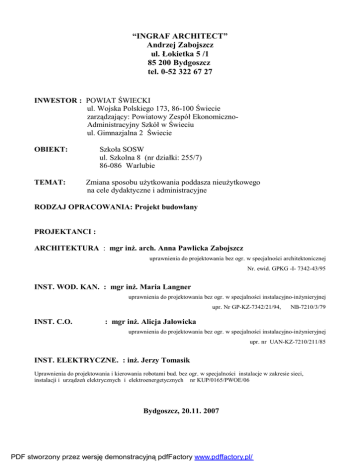 “INGRAF ARCHITECT” Andrzej Zabojszcz ul. Łokietka 5 /1 85 200 Bydgoszcz tel. 0-52 322 67 27 INWESTOR : POWIAT ŚWIECKI ul. Wojska Polskiego 173, 86-100 Świecie zarządzający: Powiatowy Zespół EkonomicznoAdministracyjny Szkół w Świeciu ul. Gimnazjalna 2 Świecie OBIEKT: TEMAT: Szkoła SOSW ul. Szkolna 8 (nr działki: 255/7) 86-086 Warlubie Zmiana sposobu użytkowania poddasza nieużytkowego na cele dydaktyczne i administracyjne RODZAJ OPRACOWANIA: Projekt budowlany PROJEKTANCI : ARCHITEKTURA : mgr inż. arch. Anna Pawlicka Zabojszcz uprawnienia do projektowania bez ogr. w specjalności architektonicznej Nr. ewid. GPKG -I- 7342-43/95 INST. WOD. KAN. : mgr inż. Maria Langner uprawnienia do projektowania bez ogr. w specjalności instalacyjno-inżynieryjnej upr. Nr GP-KZ-7342/21/94, INST. C.O. NB-7210/3/79 : mgr inż. Alicja Jałowicka uprawnienia do projektowania bez ogr. w specjalności instalacyjno-inżynieryjnej upr. nr UAN-KZ-7210/211/85 INST. ELEKTRYCZNE. : inż. Jerzy Tomasik Uprawnienia do projektowania i kierowania robotami bud. bez ogr. w specjalności instalacje w zakresie sieci, instalacji i urządzeń elektrycznych i elektroenergetycznych nr KUP/0165/PWOE/06 Bydgoszcz, 20.11. 2007 PDF stworzony przez wersję demonstracyjną pdfFactory www.pdffactory.pl/ OPIS TECHNICZNY DO PROJEKTU ARCHITEKTONICZNO- BUDOWLANEGO ZMIANY SPOSOBU UŻYTKOWANIAPODDASZA NIEUŻYTKOWEGO NA CELE DYDAKTYCZNE I ADMINISTRACYJNE W BUDYNKU SZKOŁY SOSW W WARLUBIU. 1. Podstawa opracowania 1.1 1.2 1.3 1.4 1.5 Umowa zawarta z Inwestorem Inwentaryzacja dla celów budowlanych Wizja lokalna i dokumentacja fotograficzna Decyzja Nr52/2007 o ustaleniu lokalizacji inwestycji celu publicznego Wytyczne rzeczoznawcy ds p-poż. 2. Przedmiot opracowania Przedmiotem opracowania jest projekt przebudowy części pomieszczeń poddasza w celu zmiany sposobu użytkowania.Jednakże nowa funkcja pomieszczenia jest zgodna z funkcją całego obiektu.Obecne, nieużytkowe pomieszczenie zostanie zmodernizowane i docelowo będzie wykorzystywane jako salka komputerowa dla 10 dzieci i pomieszczenia biurowe dla ok. 6-7 pracowników. W całej szkole uczy się ok. 108 dzieci upośledzonych umysłowo w stopniu lekkim i umiarkowanym. Zatrudnionych jest ok.20 nauczycieli. 3. Opis stanu istniejącego Budynek, w którym znajduje się pomieszczenie będące przedmiotem opracowania jest obiektem dwukondygnacyjnym ,podpiwniczonym, ze stromym dachem mansardowym krytym dachówką karpiówką *w koronkę*. Budynek wybudowany na początku XX w. zalicza się do obiektów dóbr kultury. Ściany murowane z cegły , stropy drewniane na podciągach stalowych, klatka schodowa murowana, biegi schodowe żelbetowe. Więżba dachu mansardowego drewniana ; krokwie, słupki i murłaty o przekroju 14 x 14 cm. W pomieszczeniu znajdują się dwa małe okna tzw. * wole oko* i 4 okna połaciowe. Podłoga z desek drewnianych. 4. Demontaż i rozbiórki - demontaż drzwi istniejących (tj. wejściowych i łazienkowych oraz drzwi prowadzących do pozostałych pomieszczeń poddasza) – demontaż przyborów WC i umywalki w łazience – rozbiórka ścianek działowych murowanych w łazience - demontaż desek podłogowych istniejących (bez naruszenia elementów konstrukcji dachu !) - usunięcie polepy ze ślepej podłogi stropu - rozbiórka fragmentów połaci dachowej z dachówki karpiówki i wycięcie fragmentów łat drewnianych ( w miejscach przyszłych okien połaciowych) - demontaż boazerii w korytarzyku istn. - skucie części tynków (pod tzw. packi) – demontaż sufitu podwieszanego w pom. istniejącej łazienki. PDF stworzony przez wersję demonstracyjną pdfFactory www.pdffactory.pl/ 5. Opis rozwiązań konstrukcyjno materiałowych. 5.1 Stropodach Przed podjęciem prac dociepleniowych należy zaimpregnować więżbę preparatem grzybobójczo-ogniochronnym do stanu niepalności np.FOBOS-M-2L (zużycie 500-700g/m2) lub OGNIOCHRONEM (zużycie 200g/m2). w części stromej dachu należy zamontować 2 dodatkowe okna połaciowe (np. Velux lub Fakro) . Na wysokości 330 cm powyżej nowej rzędnej posadzki należy zamontować sufit z podwójnej płyty gkf na ruszcie stalowym podwieszonym na wieszakach stalowych do konstrukcji drewnianej. Na suficie ułożyć paroizolację z folii PE , następnie wełnę mineralną 18 cm i przykryć to folią paroprzepuszczalną. Uwaga: sufit w pomieszczeniu korytarza zamocować na wysokości 250 cm. od nowej rzędnej posadzki Część stromą dachu (*ścianę pomieszczenia*) należy ocieplić układając od zewnątrz: - folię paroprzepuszczalną (np. Tyvec) - wełnę mineralną gr. 18 cm. - paroizolację (np. folię PE) - płytę gkf podwójnie na ruszcie stalowym, na wysokości poniżej 80 cm. Powyżej podłogi płytę gkf mocować pionowo jak ściankę działową. W ten sposób uzyska się przestrzeń do prowadzenia przewodów instalacji c.o. Na dachu zamocować kominki wentylacyjne dobrane kolorystycznie do dachówki.Kominki połączyć giętkimi przewodami do kratek wentylacyjnych. Na kratkach wentylacyjnych będą zamocowane wentylatory. 5.2 Ściany wewnętrzne Istniejące ściany wewnętrzne murowane z cegły gr. 25 i 12 cm. oddzielające nowoprojektowane pomieszczenia od reszty poddasza należy podwyższyć na pełną wysokość do góry dachu montując ścianę z podwójnej płyty gkf na ruszcie stalowym podwójnym z ustawionymi mijankowo stalowymi słupkami ( patrz rysunek szczegółu). Przednia warstwa płyty gkf powinna schodzić do posadzki tworząc w ten sposób jednolitą powierzchnię górnej i dolnej części. Dolną płytę mocować do ściany murowanej na tzw. *packi* po skuciu fragmentów tynku (w miejscach pacek). Pionowe i skośne elementy więźby takie jak : słupki , miecze oraz poziome kleszcze obić płytą gkf w sposób, aby nie stanowiły zagrożenia uderzenia się na wys. poniżej 190 cm. Ścianki działowe wykonać z płyty gkf na ruszcie stalowym wypełnionym wełną mineralną gr. 6 cm. 5.3 Podł