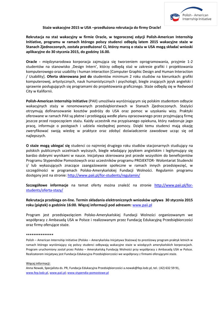 Staże wakacyjne 2015 w USA –przedłużona rekrutacja do firmy Oracle! Rekrutacja na staż wakacyjny w firmie Oracle, w tegorocznej edycji Polish-American Internship Initiative, programu w ramach którego polscy studenci odbędą latem 2015 wakacyjne staże w Stanach Zjednoczonych, została przedłużona! Ci, którzy marzą o stażu w USA mogą składać wnioski aplikacyjne do 30 stycznia 2015, do godziny 16.00. Oracle - międzynarodowa korporacja zajmująca się tworzeniem oprogramowania, przyjmie 1-2 studentów na stanowisko ‚Design Intern’, którzy odbędą staż w zakresie grafiki i projektowania komputerowego oraz usability i human interaction [Computer Graphic Design and Human Interaction / Usability]. Oferta skierowana jest do studentów minimum 2 roku studiów na kierunkach: grafiki komputerowej, artystycznych, nauk humanistycznych i psychologii, biegle znających język angielski i sprawnie posługujących się programami do projektowania graficznego. Staże odbędą się w Redwood City w Kalifornii. Polish-American Internship Initiative (PAII) umożliwia wyróżniającym się polskim studentom odbycie wakacyjnych staży w renomowanych przedsiębiorstwach w Stanach Zjednoczonych. Stażyści otrzymują dofinansowanie kosztów podróży do USA oraz pomoc w uzyskaniu wizy. Praktyki oferowane w ramach PAII są płatne i przebiegają wedle planu opracowanego przez przyjmującą firmę jeszcze przed rozpoczęciem stażu. Każdy uczestnik ma przypisanego opiekuna, który nadzoruje jego pracę, informuje o postępach i udziela niezbędnej pomocy. Dzięki temu studenci mają okazję zweryfikować swoją wiedzę w praktyce oraz zdobyć doświadczenie zawodowe ucząc się od najlepszych. O staże mogą ubiegać się studenci co najmniej drugiego roku studiów stacjonarnych studiujący na polskich publicznych uczelniach wyższych, biegle władający językiem angielskim i legitymujący się bardzo dobrymi wynikami w nauce. Inicjatywa skierowana jest przede wszystkim do beneficjentów Programu Stypendiów Pomostowych oraz uczestników programu PROJEKTOR- Wolontariat Studencki i/ lub wykazujących znaczące zaangażowanie społeczne w ramach innych przedsięwzięć, w szczególności w programach Polsko-Amerykańskiej Fundacji Wolności. Regulamin programu dostępny jest na stronie: http://www.paii.pl/for-students/regulamin/ Szczegółowe informacje na temat oferty można znaleźć na stronie http://www.paii.pl/forstudents/oferta-stazy/ Rekrutacja przebiega on-line. Termin składania elektronicznych wniosków upływa 30 stycznia 2015 roku (piątek) o godzinie 16:00. Więcej informacji pod adresem: www.paii.pl Program jest przedsięwzięciem Polsko-Amerykańskiej Fundacji Wolności organizowanym we współpracy z Ambasadą USA w Polsce i realizowanym przez Fundację Edukacyjną Przedsiębiorczości oraz firmy oferujące staże. *************** Polish – American Internship Initiative (Polsko – Amerykańska Inicjatywa Stażowa) to prestiżowy program praktyk letnich w ramach którego wyróżniający się polscy studenci odbywają wakacyjne staże w wiodących amerykańskich korporacjach. Program uruchomiony został przez Polsko – Amerykańską Fundację Wolności przy współpracy z Ambasadą USA w Polsce. Realizatorem inicjatywy jest Fundacja Edukacyjna Przedsiębiorczości we współpracy z firmami oferującymi staże. Więcej informacji: Anna Nowak, Specjalista ds. PR, Fundacja Edukacyjna Przedsiębiorczości [email protected], tel.: (42) 632 59 91, www.fep.lodz.pl, www.paii.pl; www.stypendia-pomostowe.pl