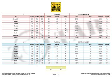 1 TRAFIENIA ZUŻYTA AMUNICJA ID zginał trafił bilans brzuch ramię plecy UZI D-D efekt.(%) wynik Grzybek 14 71 58 53 53 18 3870 0 1.835 71.0 Rozan 27 61 34 46 47 15 30 180 29.048 61.0 Bronto 35 31 -4 25 11 4 990 92 2.865 31.0 Maciek 16 25 9 17 6 4 3930 0 0.636 25.0 TicTac 32 25 -6 16 0 9 3720 0 0.672 25.0 Bienio 27 24 -3 15 6 4 5670 0 0.423 24.0 Emil 26 23 -3 14 9 7 900 96 2.309 23.0 Gubanus 32 17 -15 15 5 1 30 40 24.286 17.0 Suma 209 277 70 201 137 62 19140 408 1.417 277 2 TRAFIENIA ZUŻYTA AMUNICJA ID zginał trafił bilans brzuch ramię plecy UZI D-D efekt.(%) wynik Fladra 55 43 -12 32 13 5 3300 18 1.296 43.0 Snax 40 39 -1 30 17 7 1770 13 2.187 39.0 Sceram 35 33 -2 31 3 1 2760 4 1.194 33.0 Shraut 30 28 -2 22 7 4 3000 4 0.932 28.0 Czolg 31 28 -3 25 13 3 0 69 40.580 28.0 Flusha 44 18 -26 13 4 3 1800 11 0.994 18.0 jerry 42 18 -24 12 2 4 3240 1 0.555 18.0 Suma 277 207 -70 165 59 27 15870 120 1.295 207 Laserowy Poligon Zoltar - ul.Aleja Pokoju 81, 31-564 Kraków Tel.:792-111-091, e-mail:[email protected] 1 2 277 207 Strona 1 z 5 Data: 2017-02-19; Godzina: 19:54; Czas gry: 15minut Prowadzący: Gamemaster ZOLTAR Drużyny Miejsce Nazwa Laserowy Poligon Zoltar - ul.Aleja Pokoju 81, 31-564 Kraków Tel.:792-111-091, e-mail:[email protected] Rozgrywki 1 Suma 1 277 277 2 207 207 Strona 2 z 5 Data: 2017-02-19 Prowadzący: Gamemaster ZOLTAR Zestawienie wg wyniku Miejsce TRAFIENIA ZUŻYTA AMUNICJA ID zginał trafił bilans brzuch ramię plecy UZI D-D efekt.(%) wynik Grzybek 56.00 284.00 228.00 212.00 212.00 72.00 15480.00 0.00 1.835 284.00 Rozan 108.00 244.00 136.00 184.00 188.00 60.00 120.00 720.00 29.048 244.00 Fladra 220.00 172.00 -48.00 128.00 52.00 20.00 13200.00 72.00 1.296 172.00 4 Snax 160.00 156.00 -4.00 120.00 68.00 28.00 7080.00 52.00 2.187 156.00 5 Sceram 140.00 132.00 -8.00 124.00 12.00 4.00 11040.00 16.00 1.194 132.00 6 Bronto 140.00 124.00 -16.00 100.00 44.00 16.00 3960.00 368.00 2.865 124.00 Shraut 120.00 112.00 -8.00 88.00 28.00 16.00 12000.00 16.00 0.932 Czolg 124.00 112.00 -12.00 100.00 52.00 12.00 0.00 276.00 40.580 Maciek 64.00 100.00 36.00 68.00 24.00 16.00 15720.00 0.00 0.636 TicTac 128.00 100.00 -28.00 64.00 0.00 36.00 14880.00 0.00 0.672 9 Bienio 108.00 96.00 -12.00 60.00 24.00 16.00 22680.00 0.00 0.423 96.00 10 Emil 104.00 92.00 -12.00 56.00 36.00 28.00 3600.00 384.00 2.309 92.00 jerry 168.00 72.00 -96.00 48.00 8.00 16.00 12960.00 4.00 0.555 Flusha 176.00 72.00 -104.00 52.00 16.00 12.00 7200.00 44.00 0.994 Gubanus 128.00 68.00 -60.00 60.00 20.00 4.00 120.00 160.00 24.286 7 8 11 12 Laserowy Poligon Zoltar - ul.Aleja Pokoju 81, 31-564 Kraków Tel.:792-111-091, e-mail:[email protected] Strona 3 z 5 112.00 100.00 72.00 68.00 Data: 2017-02-19 Prowadzący: Gamemaster ZOLTAR Zestawienie wg bilansu Miejsce TRAFIENIA ZUŻYTA AMUNICJA ID zginał trafił bilans brzuch ramię plecy UZI D-D efekt.(%) wynik Grzybek 56.00 284.00 228.00 212.00 212.00 72.00 15480.00 0.00 1.835 284.00 Rozan 108.00 244.00 136.00 184.00 188.00 60.00 120.00 720.00 29.048 244.00 Maciek 64.00 100.00 36.00 68.00 24.00 16.00 15720.00 0.00 0.636 100.00 Snax 160.00 156.00 -4.00 120.00 68.00 28.00 7080.00 52.00 2.187 156.00 Shraut 120.00 112.00 88.00 28.00 16.00 12000.00 16.00 0.932 112.00 Sceram 140.00 132.00 124.00 12.00 4.00 11040.00 16.00 1.194 132.00 Emil 104.00 92.00 56.00 36.00 28.00 3600.00 384.00 2.309 92.00 Bienio 108.00 96.00 60.00 24.00 16.00 22680.00 0.00 0.423 96.00 Czolg 124.00 112.00 100.00 52.00 12.00 0.00 276.00 40.580 112.00 7 Bronto 140.00 124.00 -16.00 100.00 44.00 16.00 3960.00 368.00 2.865 124.00 8 TicTac 128.00 100.00 -28.00 64.00 0.00 36.00 14880.00 0.00 0.672 100.00 9 Fladra 220.00 172.00 -48.00 128.00 52.00 20.00 13200.00 72.00 1.296 172.00 10 Gubanus 128.00 68.00 -60.00 60.00 20.00 4.00 120.00 160.00 24.286 68.00 11 jerry 168.00 72.00 -96.00 48.00 8.00 16.00 12960.00 4.00 0.555 72.00 12 Flusha 176.00 72.00 -104.00 52.00 16.00 12.00 7200.00 44.00 0.994 72.00 4 5 6 Laserowy Poligon Zoltar - ul.Aleja Pokoju 81, 31-564 Kraków Tel.:792-111-091, e-mail:[email protected] -8.00 -12.00 Strona 4 z 5 Data: 2017-02-19 Prowadzący: Gamemaster ZOLTAR Zestawienie wg efektywności Miejsce TRAFIENIA ZUŻYTA AMUNICJA ID zginał trafił bilans brzuch ramię plecy UZI D-D efekt.(%) wynik Czolg 124.00 112.00 -12.00 100.00 52.00 12.00 0.00 276.00 40.580 112.00 Rozan 108.00 244.00 136.00 184.00 188.00 60.00 120.00 720.00 29.048 244.00 Gubanus 128.00 68.00 -60.00 60.00 20.00 4.00 120.00 160.00 24.286 68.00 4 Bronto 140.00 124.00 -16.00 100.00 44.00 16.00 3960.00 368.00 2.865 124.00 5 Emil 104.00 92.00 -12.00 56.00 36.00 28.00 3600.00 384.00 2.309 92.00 6 Snax 160.00 156.00 -4.00 120.00 68.00 28.00 7080.00 52.00 2.187 156.00 7 Grzybek 56.00 284.00 228.00 212.00 212.00 72.00 15480.00 0.00 1.835 284.00 8 Fladra 220.00 172.00 -48.00 128.00 52.00 20.00 13200.00 72.00 1.296 172.00 9 Sceram 140.00 132.00 -8.00 124.00 12.00 4.00 11040.00 16.00 1.194 132.00 10 Flusha 176.00 72.00 -104.00 52.00 16.00 12.00 7200.00 44.00 0.994 72.00 11 Shraut 120.00 112.00 -8.00 88.00 28.00 16.00 12000.00 16.00 0.932 112.00 12 TicTac 128.00 100.00 -28.00 64.00 0.00 36.00 14880.00 0.00 0.672 100.00 13 Maciek 64.00 100.00 36.00 68.00 24.00 16.00 15720.00 0.00 0.636 100.00 14 jerry 168.00 72.00 -96.00 48.00 8.00 16.00 12960.00 4.00 0.555 72.00 15 Bienio 108.00 96.00 -12.00 60.00 24.00 16.00 22680.00 0.00 0.423 96.00 Laserowy Poligon Zoltar - ul.Aleja Pokoju 81, 31-564 Kraków Tel.:792-111-091, e-mail:[email protected] Strona 5 z 5 Data: 2017-02-19 Prowadzący: Gamemaster ZOLTAR