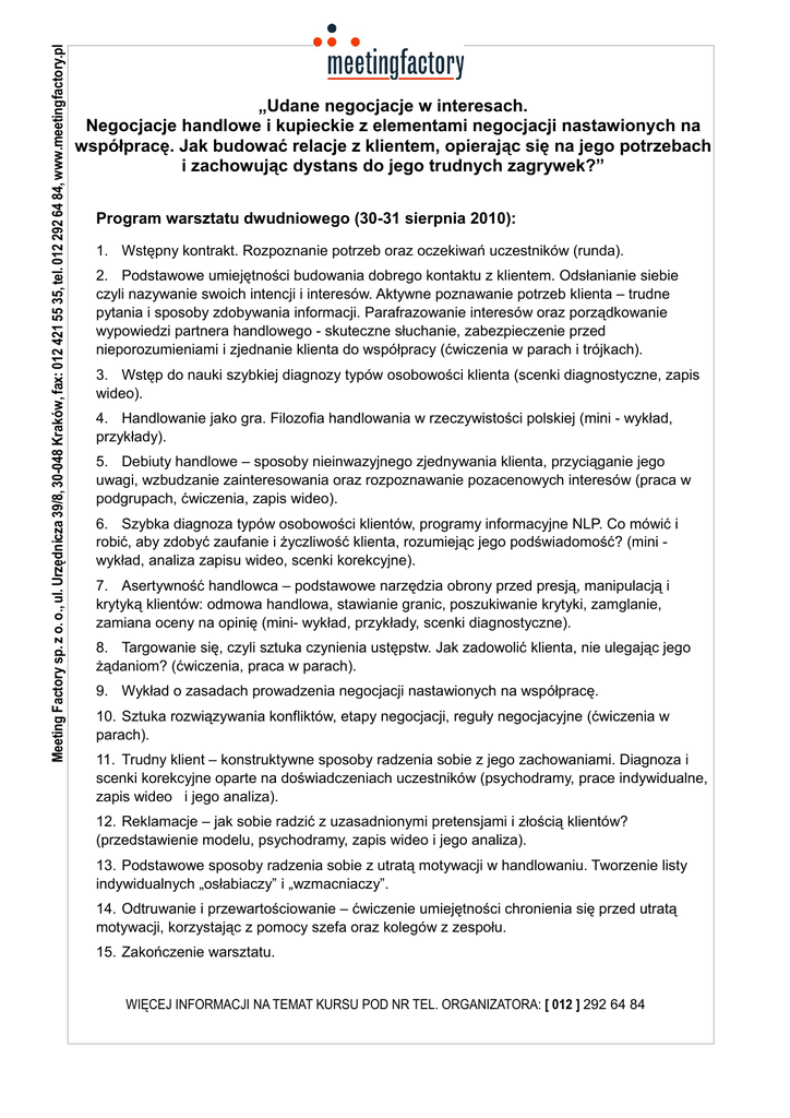 Meeting Factory sp. z o. o., ul. Urzędnicza 39/8, 30-048 Kraków, fax: 012 421 55 35, tel. 012 292 64 84, www.meetingfactory.pl „Udane negocjacje w interesach. Negocjacje handlowe i kupieckie z elementami negocjacji nastawionych na współpracę. Jak budować relacje z klientem, opierając się na jego potrzebach i zachowując dystans do jego trudnych zagrywek?” Program warsztatu dwudniowego (30-31 sierpnia 2010): 1. Wstępny kontrakt. Rozpoznanie potrzeb oraz oczekiwań uczestników (runda). 2. Podstawowe umiejętności budowania dobrego kontaktu z klientem. Odsłanianie siebie czyli nazywanie swoich intencji i interesów. Aktywne poznawanie potrzeb klienta – trudne pytania i sposoby zdobywania informacji. Parafrazowanie interesów oraz porządkowanie wypowiedzi partnera handlowego - skuteczne słuchanie, zabezpieczenie przed nieporozumieniami i zjednanie klienta do współpracy (ćwiczenia w parach i trójkach). 3. Wstęp do nauki szybkiej diagnozy typów osobowości klienta (scenki diagnostyczne, zapis wideo). 4. Handlowanie jako gra. Filozofia handlowania w rzeczywistości polskiej (mini - wykład, przykłady). 5. Debiuty handlowe – sposoby nieinwazyjnego zjednywania klienta, przyciąganie jego uwagi, wzbudzanie zainteresowania oraz rozpoznawanie pozacenowych interesów (praca w podgrupach, ćwiczenia, zapis wideo). 6. Szybka diagnoza typów osobowości klientów, programy informacyjne NLP. Co mówić i robić, aby zdobyć zaufanie i życzliwość klienta, rozumiejąc jego podświadomość? (mini wykład, analiza zapisu wideo, scenki korekcyjne). 7. Asertywność handlowca – podstawowe narzędzia obrony przed presją, manipulacją i krytyką klientów: odmowa handlowa, stawianie granic, poszukiwanie krytyki, zamglanie, zamiana oceny na opinię (mini- wykład, przykłady, scenki diagnostyczne). 8. Targowanie się, czyli sztuka czynienia ustępstw. Jak zadowolić klienta, nie ulegając jego żądaniom? (ćwiczenia, praca w parach). 9. Wykład o zasadach prowadzenia negocjacji nastawionych na współpracę. 10. Sztuka rozwiązywania konfliktów, etapy negocjacji, reguły negocjacyjne (ćwiczenia w parach). 11. Trudny klient – konstruktywne sposoby radzenia sobie z jego zachowaniami. Diagnoza i scenki korekcyjne oparte na doświadczeniach uczestników (psychodramy, prace indywidualne, zapis wideo i jego analiza). 12. Reklamacje – jak sobie radzić z uzasadnionymi pretensjami i złością klientów? (przedstawienie modelu, psychodramy, zapis wideo i jego analiza). 13. Podstawowe sposoby radzenia sobie z utratą motywacji w handlowaniu. Tworzenie listy indywidualnych „osłabiaczy” i „wzmacniaczy”. 14. Odtruwanie i przewartościowanie – ćwiczenie umiejętności chronienia się przed utratą motywacji, korzystając z pomocy szefa oraz kolegów z zespołu. 15. Zakończenie warsztatu. WIĘCEJ INFORMACJI NA TEMAT KURSU POD NR TEL. ORGANIZATORA: [ 012 ] 292 64 84