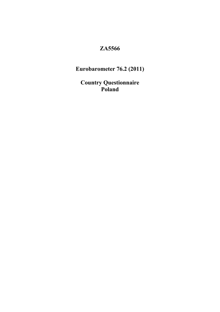 ZA5566 Eurobarometer 76.2 (2011) Country Questionnaire Poland A numer projektu TNS OBOP (101-105) EB76.1 A B kod państwa (106-107) EB76.1 B C centralny numer projektu (108-110) EB76.1 C D numer wywiadu (111-116) EB76.1 D EB0762PLXTRA 1/48 23/09/2011 Q1 Jakiej jest Pan(i) narodowości? Proszę wskazać kraj(e), który(e) jej odpowiada(ją). (MOŻLIWE KILKA ODPOWIEDZI) Belgia Dania Niemcy Grecja Hiszpania Francja Irlandia Włochy Luksemburg Holandia Portugalia Zjednoczone Królestwo (Wielka Brytania, Irlandia Północna) Austria Szwecja Finlandia Cypr (południowy) Czechy Estonia Węgry Łotwa Litwa Malta Polska Słowacja Słowenia Bułgaria Rumunia Turcja Chorwacja Była Jugosłowiańska Republika Macedonii Islandia Norwegia Inne kraje Trudno powiedzieć (137-170) 1, 2, 3, 4, 5, 6, 7, 8, 9, 10, 11, 12, 13, 14, 15, 16, 17, 18, 19, 20, 21, 22, 23, 24, 25, 26, 27, 28, 29, 30, 31, 32, 33, 34, EB76.1 Q1 EB0762PLXTRA 2/48 23/09/2011 JEŚLI "INNE" LUB "TRUDNO POWIEDZIEĆ" W Q1, ZAKOŃCZ WYWIAD ZADAĆ D15B TYLKO JEŚLI OBECNIE NIE PRACUJE - ODPOWIEDZI 1 DO 4 W D15A. D15a Jaką pracę Pan(i) obecnie wykonuje? D15b Czy w przeszłości kiedykolwiek pracował(a) Pan(i) zarobkowo? Jaką Pan(i) pracę ostatnio wykonywał(a)? (171-172) (173-174) D15a D15b OBECNA OSTATNIA PRACA PRACA NIE PRACUJĄCY(A) Osoba zajmująca się domem, zakupami, aktualnie nigdzie 1 1 niepracująca. Student(ka), Uczeń (uczennica) 2 2 Bezrobotny(a) lub czasowo niepracujący(a) 3 3 Emeryt lub niezdolny(a) do pracy z powodu choroby 4 4 PRACUJĄCY NA WŁASNY RACHUNEK Rolnik 5 5 Rybak 6 6 Specjalista wolnego zawodu (prawnik, prywatna praktyka 7 7 lekarska, księgowy, architekt itd.) 8 8 Właściciel sklepu, rzemieślnik, inna osoba pracująca na własny rachunek Właściciele, udziałowcy (całkowici lub częściowi) 9 9 przedsiębiorstw PRACA NA ETACIE Zatrudnieni na etacie specjaliści (zatrudnieni lekarze, 10 10 prawnicy, architekci, księgowi) Zarząd, główni dyrektorzy, wyższa kadra kierownicza 11 11 (Dyrektor Naczelny, Dyrektor Generalny, inny dyrektor) Średnia kadra kierownicza (kierownicy działów, zastępcy, młodszy kierownik, nauczyciele, inżynierowie) 12 12 Pracownicy niższego szczebla, pracujący głównie przy biurku Pracownicy niższego szczebla, praca związana z podróżami (sprzedawcy, kierowcy, …) Pracownicy niższego szczebla, zatrudnieni w sektorze usługowym (w szpitalu, restauracji, policji, straży...) 13 13 14 14 15 15 Nadzór Robotnik wykwalifikowany Inni robotnicy niewykwalifikowani, pomoc domowa 16 17 18 16 17 18 NIGDY NIE PRACOWAŁ(A) ZAROBKOWO 19 19 EB76.1 D15a D15b EB0762PLXTRA 3/48 23/09/2011 ZADAĆ QA TYLKO W UE27 - POZOSTALI PRZEJŚĆ DO QB1 EB0762PLXTRA 4/48 23/09/2011 QA. ZATRUDNIENIE I POLITYKA SPOŁECZNA QA1 Proszę pomyśleć o obecnym kryzysie gospodarczym i jego możliwym wpływie na rynek pracy. Czy, a jeśli tak, to w jakim stopniu martwi się Pan(i) następującymi sprawami? Proszę posłużyć się skalą od 1 do 5, gdzie "1" oznacza, że w ogóle się Pan(i) nie martwi daną sprawą, a "5" oznacza, że bardzo się Pan(i) nią martwi. (WRĘCZ KARTĘ ZE SKALĄ - JEDNA ODPOWIEDŹ W WIERSZU) (ODCZYTAJ) 1 (195) 2 (196) (197) 3 (TYLKO JEŚLI "OBECNIE PRACUJE" KOD 5 DO 18 W D15a) Utrata pracy przez Pana(ią) osobiście Utrata pracy przez Pana(i) partnera/partnerkę, żonę/męża itp. Utrata pracy przez Pana(i) dzieci Nie Trud doty no czy powi (SP edzi ONT eć ANI CZN IE) 1 W ogól e się nie mart wię 2 3 4 5 Bard zo się mart wię 1 2 3 4 5 6 7 1 2 3 4 5 6 7 1 2 3 4 5 6 7 EB71.2 QB2 TREND SLIGHTLY MODIFIED QA2 Proszę powiedzieć, w jakim stopniu zgadza się Pan(i) lub nie zgadza z następującym stwierdzeniem: Za dwa lata kryzys się skończy i sytuacja w zakresie zatrudnienia w Polsce będzie lepsza niż obecnie. (ODCZYTAJ - TYLKO JEDNA ODPOWIEDŹ) (198) 1 2 3 4 5 Zdecydowanie się zgadzam Raczej się zgadzam Raczej się nie zgadzam Zdecydowanie się nie zgadzam Trudno powiedzieć NEW EB0762PLXTRA 5/48 23/09/2011 QA3 Czy kiedykolwiek słyszał(a) lub czytał(a) Pan(i) o…? (WRĘCZ KARTĘ ZE SKALĄ - JEDNA ODPOWIEDŹ W WIERSZU) (ODCZYTAJ) Tak i wiem, co to jest Tak, ale Nie, nigdy Trudno nie wiem, o tym nie powiedzie co to jest słyszałem( ć am) ani nie czytałem(a m) 1 Europejskim Funduszu Dostosowania do Globalizacji (EFG), którego celem jest pomaganie ofiarom globalizacji 1 2 3 4 2 Europejskim Funduszu Społecznym (EFS) 1 2 3 4 (199) (200) EB73.5 QB4 TREND MODIFIED QA4 Ile razy zmieniał(a) Pan(i) pracodawcę w swoim dotychczasowym życiu zawodowym? (NIE WLICZAĆ DORYWCZYCH PRAC WAKACYJNYCH PODEJMOWANYCH PODCZAS NAUKI W SYSTEMIE DZIENNYM) (JEŻELI "TRUDNO POWIEDZIEĆ" WPISAĆ "99"; JEŻELI "NIGDY NIE PRACOWAŁ(A)" WPISAĆ "98") (201-202) razy EB71.2 QD4 QA5 Jak długo pracuje Pan(i) u obecnego pracodawcy, ewentualnie - jeśli obecnie Pan(i) nie pracuje - jak długo pracował(a) Pan(i) u ostatniego pracodawcy? (JEŻELI "TRUDNO POWIEDZIEĆ" WPISAĆ "99"; JEŻELI "NIGDY NIE PRACOWAŁ(A)" WPISAĆ "98" - JEŚLI "MNIEJ NIŻ 1 ROK" WPOSAĆ "00") (203-204) lat EB71.2 QD5 EB0762PLXTRA 6/48 23/09/2011 QA6 Na które dwa elementy należy Pana(i) zdaniem kłaść nacisk, aby łatwo znaleźć pracę w dzisiejszych czasach? (WRĘCZ KARTĘ - ODCZYTAJ - MAKSYMALNIE DWIE ODPOWIEDZI) Poziom własnych kwalifikacji Doświadczenie zawodowe Znajomość języków obcych Umiejętność obsługi komputera Zdolność dostosowania się do warunków, otoczenia Gotowość do podjęcia pracy zagranicą Inne (SPONTANICZNIE) Żaden z powyższych (SPONTANICZNIE) Trudno powiedzieć (205-213) 1, 2, 3, 4, 5, 6, 7, 8, 9, EB71.2 QD6 ZADAĆ QA7 JEŚLI "OBECNIE PRACUJE", KOD OD 5 DO 18 W D15a - POZOSTALI PRZEJŚĆ DO QA8 QA7 W jakim stopniu jest Pan(i) pewny(a), że utrzyma Pan(i) swoją pracę w najbliższych miesiącach? Czy jest Pan(i) ...? (ODCZYTAJ - TYLKO JEDNA ODPOWIEDŹ) (214) 1 2 3 4 5 zdecydowanie pewny(a) raczej pewny(a) niezbyt pewny(a) w ogóle niepewny(a) trudno powiedzieć EB74.1 QA40 DLA WSZYSTKICH