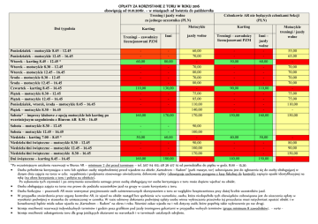 OPŁATY ZA KORZYSTANIE Z TORU W ROKU 2016 obowiązują od 01.01.2016r. – w miesiącach od kwietnia do października Członkowie AR nie będących członkami Sekcji (PLN) Trening i jazdy wolne za jednego uczestnika (PLN) Dni tygodnia Poniedziałek – motocykle 8.45 – 12.45 Poniedziałek – motocykle 12.45 – 16.45 Wtorek – karting 8.45 – 12.45 * Wtorek – motocykle 8.30 – 12.45 Wtorek – motocykle 12.45 – 16.45 Środa – motocykle 8.30 – 12.45 Środa – motocykle 12.45 – 16.45 Czwartek – karting 8.45 – 16.45 Piątek – motocykle 8.30 – 12.45 Piątek – motocykle 12.45 – 16.45 Poniedziałek, wtorek, środa – motocykle 8.45 – 16.45 Piątek – motocykle 8.30 – 16.45 Sobota* – imprezy klubowe z opcją motocykle lub karting po wcześniejszym uzgodnieniu z Biurem AR 8.30 – 16.45 Sobota – motocykle 8.30 – 12.45 Sobota – motocykle 12.45 – 16.45 Niedziela – karting 7.00 – 8.45 * Niedziela/dni świąteczne – motocykle 8.30 – 12.45 Niedziela/dni świąteczne – motocykle 12.45 – 16.45 Niedziela/dni świąteczne – motocykle 8.30 – 16.45 Dni świąteczne – karting 8.45 – 16.45 Motocykle Karting Karting Treningi – zawodnicy licencjonowani PZM Inni jazdy wolne Treningi – zawodnicy licencjonowani PZM 60,00 110,00 - 80,00 130,00 - 160,00 170,00 60,00 70,00 70,00 80,00 70,00 80,00 75,00 85,00 110,00 140,00 170,00 50,00 90,00 150,00 Inni – jazdy wolne 60,00 110,00 160,00 - - 90,00 50,00 160,00 60,00 180,00 100,00 90,00 100,00 170,00 - 40,00 140,00 50,00 150,00 Motocykle treningi / jazdy wolne 55,00 65,00 70,00 70,00 70,00 70,00 75,00 75,00 110,00 150,00 80,00 90,00 150,00 - *Po wcześniejszym ustaleniu rezerwacji w Biurze AR – minimum 7 dni przed terminem – tel. 507 114 102; 48 36 417 14 od poniedziałku do piątku w godz. 8.00 – 15.30. Osoba pełnoletnia korzystająca z toru lub opiekun osoby niepełnoletniej przed wjazdem na obiekt „Kartodrom – Radom” (park maszyn, tor) zobowiązana jest do zgłoszenia się do osoby obsługującej w danym dniu zajęcia na torze w celu: wypełnienia i podpisania stosownego oświadczenia; dokonania opłaty (obowiązuje zachowanie paragonu z kasy fiskalnej do kontroli); zapięcia opaski identyfikacyjnej na rękę (na okres korzystania z toru i pobytu na obiekcie). Po wykonaniu tych czynności i po otrzymaniu zezwolenia ustnego przez osobę obsługującą tor osoba korzystająca z toru może dopiero wjechać na obiekt. Osoba obsługująca zajęcia na torze ma prawo do podziału uczestników jazd na grupy w czasie korzystania z toru. Osoba funkcyjna – pracownik AR może wstrzymać przyjmowanie osób zainteresowanych skorzystaniem z toru ze względów bezpieczeństwa przy dużej liczbie uczestników jazd. W przypadku stwierdzenia przez organy kontrolne AR, że wjazd na obiekt nastąpił bez spełnienia w/w warunków, osoba, która niedopełniła tych obowiązków zobowiązana jest do uiszczenia opłaty w wysokości podwójnej w stosunku do umieszczonej w cenniku. W razie odmowy dokonania podwójnej opłaty osoba winna wykroczenia przeciwko tej procedurze musi natychmiast opuścić obiekt i w konsekwencji będzie miała zakaz wjazdu na „Kartodrom – Radom” na okres 1 roku. Również zakaz wjazdu na 1 rok dotyczy osób, które popełnią takie wykroczenie po raz drugi. Istnieje możliwość rezerwacji indywidualnych terminów i godzin poza grafikiem pod jazdy treningowe gokartami w przypadku wolnych terminów /grupa minimum 8 zawodników/. - verte Istnieje możliwość udostępnienia toru dla grup jeżdżących skuterami na warunkach i w terminach ustalanych odrębnie. Dla widzów i osób towarzyszących wstęp na obiekt „Kartodrom-Radom” wolny. Zawodnicy Sekcji Kartingowej Automobilklubu Radomskiego – treningi bezpłatne. Zniżkowa odpłatność dla członków AR niebędących zawodnikami Sekcji stosowana jest po okazaniu legitymacji członkowskiej z aktualną opłatą składki za rok 2016. Od godz. 17.00 do zmroku zapraszamy do korzystania z jazd wolnych na gokartach AR /dokładna godzina zakończenia jazd i opłaty – patrz „Gokarty – jazdy wolne”/. UWAGA: Za wyjątkiem oficjalnego odwołania jazd przed lub w trakcie zajęć nie przewidujemy możliwości zwrotu opłat np. z powodu awarii pojazdu lub niesprzyjajacych warunków pogodowych. Opłaty za korzystanie z toru zatwierdzono na posiedzeniu Zarządu Automobilklubu Radomskiego w dniu 16.12.2015 r.
