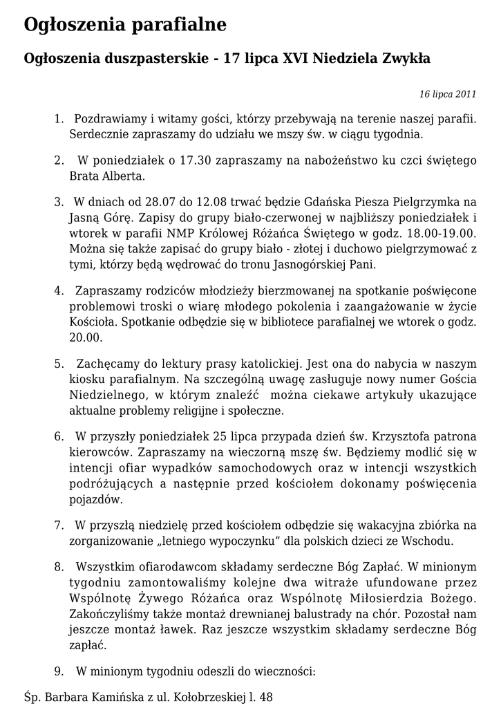 Ogłoszenia parafialne Ogłoszenia duszpasterskie - 17 lipca XVI Niedziela Zwykła 16 lipca 2011 1. Pozdrawiamy i witamy gości, którzy przebywają na terenie naszej parafii. Serdecznie zapraszamy do udziału we mszy św. w ciągu tygodnia. 2. W poniedziałek o 17.30 zapraszamy na nabożeństwo ku czci świętego Brata Alberta. 3. W dniach od 28.07 do 12.08 trwać będzie Gdańska Piesza Pielgrzymka na Jasną Górę. Zapisy do grupy biało-czerwonej w najbliższy poniedziałek i wtorek w parafii NMP Królowej Różańca Świętego w godz. 18.00-19.00. Można się także zapisać do grupy biało - złotej i duchowo pielgrzymować z tymi, którzy będą wędrować do tronu Jasnogórskiej Pani. 4. Zapraszamy rodziców młodzieży bierzmowanej na spotkanie poświęcone problemowi troski o wiarę młodego pokolenia i zaangażowanie w życie Kościoła. Spotkanie odbędzie się w bibliotece parafialnej we wtorek o godz. 20.00. 5. Zachęcamy do lektury prasy katolickiej. Jest ona do nabycia w naszym kiosku parafialnym. Na szczególną uwagę zasługuje nowy numer Gościa Niedzielnego, w którym znaleźć można ciekawe artykuły ukazujące aktualne problemy religijne i społeczne. 6. W przyszły poniedziałek 25 lipca przypada dzień św. Krzysztofa patrona kierowców. Zapraszamy na wieczorną mszę św. Będziemy modlić się w intencji ofiar wypadków samochodowych oraz w intencji wszystkich podróżujących a następnie przed kościołem dokonamy poświęcenia pojazdów. 7. W przyszłą niedzielę przed kościołem odbędzie się wakacyjna zbiórka na zorganizowanie „letniego wypoczynku” dla polskich dzieci ze Wschodu. 8. Wszystkim ofiarodawcom składamy serdeczne Bóg Zapłać. W minionym tygodniu zamontowaliśmy kolejne dwa witraże ufundowane przez Wspólnotę Żywego Różańca oraz Wspólnotę Miłosierdzia Bożego. Zakończyliśmy także montaż drewnianej balustrady na chór. Pozostał nam jeszcze montaż ławek. Raz jeszcze wszystkim składamy serdeczne Bóg zapłać. 9. W minionym tygodniu odeszli do wieczności: Śp. Barbara Kamińska z ul. Kołobrzeskiej l. 48 Śp. Helena Czarnul z ul. Dąbrowszczaków l. 87 Śp. Eustachiusz Chojecki z ul. Kołobrzeskiej l.84 Pomódlmy się także za wszystkich zmarłych z naszych rodzin oraz zmarłych dobroczyńców i dobrodziejów naszego kościoła.