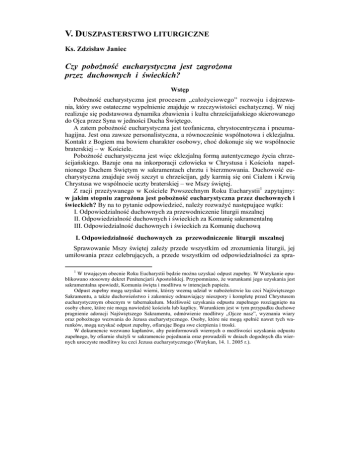 V. DUSZPASTERSTWO LITURGICZNE Ks. Zdzisław Janiec Czy pobożność eucharystyczna jest zagrożona przez duchownych i świeckich? Wstęp Pobożność eucharystyczna jest procesem „całożyciowego” rozwoju i dojrzewania, który swe ostateczne wypełnienie znajduje w rzeczywistości eschatycznej. W niej realizuje się podstawowa dynamika zbawienia i kultu chrześcijańskiego skierowanego do Ojca przez Syna w jedności Ducha Świętego. A zatem pobożność eucharystyczna jest teofaniczna, chrystocentryczna i pneumahagijna. Jest ona zawsze personalistyczna, a równocześnie wspólnotowa i eklezjalna. Kontakt z Bogiem ma bowiem charakter osobowy, choć dokonuje się we wspólnocie braterskiej – w Kościele. Pobożność eucharystyczna jest więc eklezjalną formą autentycznego życia chrześcijańskiego. Bazuje ona na inkorporacji człowieka w Chrystusa i Kościoła napełnionego Duchem Świętym w sakramentach chrztu i bierzmowania. Duchowość eucharystyczna znajduje swój szczyt u chrześcijan, gdy karmią się oni Ciałem i Krwią Chrystusa we wspólnocie uczty braterskiej – we Mszy świętej. Z racji przeżywanego w Kościele Powszechnym Roku Eucharystii1 zapytajmy: w jakim stopniu zagrożona jest pobożność eucharystyczna przez duchownych i świeckich? By na to pytanie odpowiedzieć, należy rozważyć następujące wątki: I. Odpowiedzialność duchownych za przewodniczenie liturgii mszalnej II. Odpowiedzialność duchownych i świeckich za Komunię sakramentalną III. Odpowiedzialność duchownych i świeckich za Komunię duchową I. Odpowiedzialność duchownych za przewodniczenie liturgii mszalnej Sprawowanie Mszy świętej zależy przede wszystkim od zrozumienia liturgii, jej umiłowania przez celebrujących, a przede wszystkim od odpowiedzialności za spra1 W trwającym obecnie Roku Eucharystii będzie można uzyskać odpust zupełny. W Watykanie opublikowano stosowny dekret Penitencjarii Apostolskiej. Przypomniano, że warunkami jego uzyskania jest sakramentalna spowiedź, Komunia święta i modlitwa w intencjach papieża. Odpust zupełny mogą uzyskać wierni, którzy wezmą udział w nabożeństwie ku czci Najświętszego Sakramentu, a także duchowieństwo i zakonnicy odmawiający nieszpory i kompletę przed Chrystusem eucharystycznym obecnym w tabernakulum. Możliwość uzyskania odpustu zupełnego rozciągnięto na osoby chore, które nie mogą nawiedzić kościoła lub kaplicy. Warunkiem jest w tym przypadku duchowe pragnienie adoracji Najświętszego Sakramentu, odmówienie modlitwy „Ojcze nasz”, wyznania wiary oraz pobożnego wezwania do Jezusa eucharystycznego. Osoby, które nie mogą spełnić nawet tych warunków, mogą uzyskać odpust zupełny, ofiarując Bogu swe cierpienia i troski. W dokumencie wezwano kapłanów, aby poinformowali wiernych o możliwości uzyskania odpustu zupełnego, by ofiarnie służyli w sakramencie pojednania oraz prowadzili w dniach dogodnych dla wiernych uroczyste modlitwy ku czci Jezusa eucharystycznego (Watykan, 14. 1. 2005 r.). Ks. Zdzisław Janiec 90 wowane misterium. W niniejszym tekście wskażę tylko na wybrane wątki, na które winien zwrócić uwagę każdy przewodniczący liturgii mszalnej. Oto one: 1. Przewodniczący działa „in persona Christi” Przewodniczący zgromadzenia liturgicznego musi pamiętać, że jest „ikoną” obecnego w nim Chrystusa (działa in persona Christi), znakiem rzeczywistej Jego obecności. Obrzędy liturgiczne domagają się zawsze pewnej solenności, a od celebransa wdzięku osobowego itp. Brak tych cech jest zubożeniem, a nawet swego rodzaju lekceważeniem celebracji liturgicznej2. Przewodniczący, to ktoś wyróżniający się od reszty zgromadzenia, ktoś wyniesiony i „zdystansowany”, ale z nieodzowną postawą służebną. Reprezentuje ChrystusaGłowę, ale głowa jest zawsze w łączności z całym organizmem, przewodniczy zgromadzeniu i równocześnie jest cząstką zgromadzenia3. 2. Troska o gesty liturgiczne Pogłębiona pod względem teologicznym refleksja mszalna, powinna zobowiązująco wpływać na celebransa, aby ze szczególną starannością troszczył się o umiejętne przewodniczenie liturgii. Nie tylko musi on poprawnie „wykonać” swoje czynności, ale powinien jeszcze umiejętnie je „zakomunikować”, czyli przekazać wiernym sens tego, co czyni. Nie wystarczą same tylko wypowiadane słowa, ale przewodniczący musi także „przemawiać” samym sobą. W jego postawie wszystko musi świadczyć o tym, że sam uczestniczy w liturgii i ją głęboko przeżywa. Dlatego każdy gest celebransa powinien być poprawny i zgodny z obowiązującymi normami liturgicznymi4. Każda „niespodzianka” obrzędowa lub tekstowa razi i denerwuje uczestników liturgii. Przewodniczący nie powinien wykonywać czynności, które należą do usługujących. Trudno wyobrazić sobie marszałka sejmu, aby w czasie obrad wstawał ze swojego prezydialnego miejsca i włączał oświetlenie, ustawiał krzesła lub rozdawał kartki. Niestety, w naszych kościołach jest wiele takich gestów5. Należy zatem eliminować każdy gest, który wewnętrznie nie jest związany ze sprawowaną liturgią, zwłaszcza każdy gest, który rozprasza, wprowadza zdenerwowanie, pośpiech lub niepokój zgromadzenia. Jest to podstawowy warunek dobrego przewodniczenia zgromadzeniu liturgicznemu6. 3. Harmonia między gestem a czynnością liturgiczną Inną, równie ważną zasadą dobrego przewodniczenia w liturgii jest zgodność między gestem, słowem i sprawowaną czynnością, zgodnie z benedyktyńską zasadą: „zgodność myśli z głosem” (mens concordat vocem). Celebrans nigdy nie może pozwolić sobie na zachowanie, które nie jest konieczne i potrzebne w sprawowaniu liturgii, na przykład nie powinien patrzeć na zegarek podczas sprawowanej czynno2 Por. H. Sobeczko, Zgromadzeni w imię Pana (Teologia znaku liturgicznego), Opole 1999, s. 141. Tamże. 4 Tamże, s. 142. 5 Tamże. 6 Tamże.