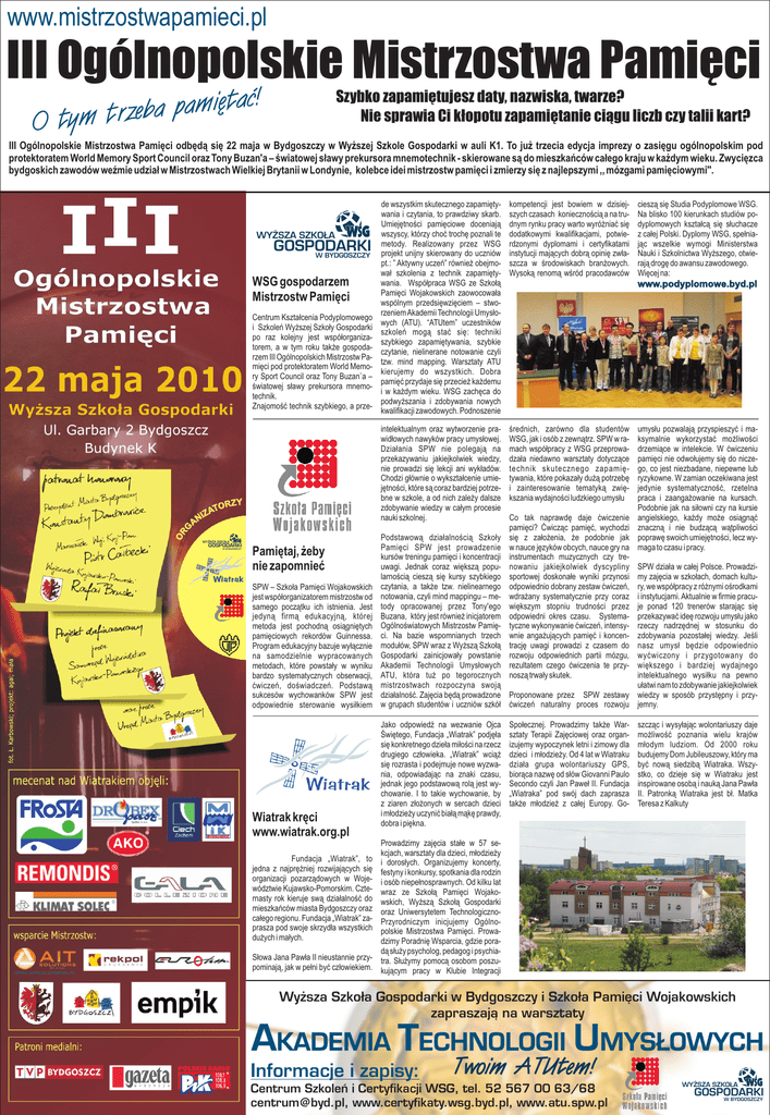 www.mistrzostwapamieci.pl III Ogólnopolskie Mistrzostwa Pamiêci taæ! ê i m a p a b e z r O tym t Szybko zapamiêtujesz daty, nazwiska, twarze? Nie sprawia Ci k³opotu zapamiêtanie ci¹gu liczb czy talii kart? III Ogólnopolskie Mistrzostwa Pamiêci odbêd¹ siê 22 maja w Bydgoszczy w Wy¿szej Szkole Gospodarki w auli K1. To ju¿ trzecia edycja imprezy o zasiêgu ogólnopolskim pod protektoratem World Memory Sport Council oraz Tony Buzan'a – œwiatowej s³awy prekursora mnemotechnik - skierowane s¹ do mieszkañców ca³ego kraju w ka¿dym wieku. Zwyciêzca bydgoskich zawodów weŸmie udzia³ w Mistrzostwach Wielkiej Brytanii w Londynie, kolebce idei mistrzostw pamiêci i zmierzy siê z najlepszymi ,, mózgami pamiêciowymi''. WY¯SZA SZKO£A GOSPODARKI W BYDGOSZCZY WSG gospodarzem Mistrzostw Pamiêci OR G Centrum Kszta³cenia Podyplomowego i Szkoleñ Wy¿szej Szko³y Gospodarki po raz kolejny jest wspó³organizatorem, a w tym roku tak¿e gospodarzem III Ogólnopolskich Mistrzostw Pamiêci pod protektoratem World Memory Sport Council oraz Tony Buzan`a – œwiatowej s³awy prekursora mnemotechnik. Znajomoœæ technik szybkiego, a prze- A Z TOR ZA I N Y WY¯SZA SZKO£A GOSPODARKI W BYDGOSZCZY Pamiêtaj, ¿eby nie zapomnieæ SPW – Szko³a Pamiêci Wojakowskich jest wspó³organizatorem mistrzostw od samego pocz¹tku ich istnienia. Jest jedyn¹ firm¹ edukacyjn¹, której metoda jest pochodn¹ osi¹gniêtych pamiêciowych rekordów Guinnessa. Program edukacyjny bazuje wy³¹cznie na samodzielnie wypracowanych metodach, które powsta³y w wyniku bardzo systematycznych obserwacji, æwiczeñ, doœwiadczeñ. Podstaw¹ sukcesów wychowanków SPW jest odpowiednie sterowanie wysi³kiem Wiatrak krêci www.wiatrak.org.pl Fundacja „Wiatrak”, to jedna z najprê¿niej rozwijaj¹cych siê organizacji pozarz¹dowych w Województwie Kujawsko-Pomorskim. Czternasty rok kieruje sw¹ dzia³alnoœæ do mieszkañców miasta Bydgoszczy oraz ca³ego regionu. Fundacja „Wiatrak” zaprasza pod swoje skrzyd³a wszystkich du¿ych i ma³ych. S³owa Jana Paw³a II nieustannie przypominaj¹, jak w pe³ni byæ cz³owiekiem. de wszystkim skutecznego zapamiêtywania i czytania, to prawdziwy skarb. Umiejêtnoœci pamiêciowe doceniaj¹ wszyscy, którzy choæ trochê poznali te metody. Realizowany przez WSG projekt unijny skierowany do uczniów pt.: ” Aktywny uczeñ” równie¿ obejmowa³ szkolenia z technik zapamiêtywania. Wspó³praca WSG ze Szko³¹ Pamiêci Wojakowskich zaowocowa³a wspólnym przedsiêwziêciem – stworzeniem Akademii Technologii Umys³owych (ATU). “ATUtem” uczestników szkoleñ mog¹ staæ siê: techniki szybkiego zapamiêtywania, szybkie czytanie, nielinerane notowanie czyli tzw. mind mapping. Warsztaty ATU kierujemy do wszystkich. Dobra pamiêæ przydaje siê przecie¿ ka¿demu i w ka¿dym wieku. WSG zachêca do podwy¿szania i zdobywania nowych kwalifikacji zawodowych. Podnoszenie kompetencji jest bowiem w dzisiejszych czasach koniecznoœci¹ a na trudnym rynku pracy warto wyró¿niaæ siê dodatkowymi kwalifikacjami, potwierdzonymi dyplomami i certyfikatami instytucji maj¹cych dobr¹ opiniê zw³aszcza w œrodowiskach bran¿owych. Wysok¹ renom¹ wœród pracodawców intelektualnym oraz wytworzenie prawid³owych nawyków pracy umys³owej. Dzia³ania SPW nie polegaj¹ na przekazywaniu jakiejkolwiek wiedzy, nie prowadzi siê lekcji ani wyk³adów. Chodzi g³ównie o wykszta³cenie umiejêtnoœci, które s¹ coraz bardziej potrzebne w szkole, a od nich zale¿y dalsze zdobywanie wiedzy w ca³ym procesie nauki szkolnej. œrednich, zarówno dla studentów WSG, jak i osób z zewn¹trz. SPW w ramach wspó³pracy z WSG przeprowadza³a niedawno warsztaty dotycz¹ce technik skutecznego zapamiêtywania, które pokaza³y du¿¹ potrzebê i zainteresowanie tematyk¹ zwiêkszania wydajnoœci ludzkiego umys³u ciesz¹ siê Studia Podyplomowe WSG. Na blisko 100 kierunkach studiów podyplomowych kszta³c¹ siê s³uchacze z ca³ej Polski. Dyplomy WSG, spe³niaj¹c wszelkie wymogi Ministerstwa Nauki i Szkolnictwa Wy¿szego, otwieraj¹ drogê do awansu zawodowego. Wiêcej na: www.podyplomowe.byd.pl Co tak naprawdê daje æwiczenie pamiêci? Æwicz¹c pamiêæ, wychodzi siê z za³o¿enia, ¿e podobnie jak w nauce jêzyków obcych, nauce gry na instrumentach muzycznych czy trenowaniu jakiejkolwiek dyscypliny sportowej doskona³e wyniki przynosi odpowiednio dobrany zestaw æwiczeñ, wdra¿any systematycznie przy coraz wiêkszym stopniu trudnoœci przez odpowiedni okres czasu. Systematyczne wykonywanie æwiczeñ, intensywnie anga¿uj¹cych pamiêæ i koncentracjê uwagi prowadzi z czasem do rozwoju odpowiednich partii mózgu, rezultatem czego æwiczenia te przynosz¹ trwa³y skutek. umys³u pozwalaj¹ przyspieszyæ i maksymalnie wykorzystaæ mo¿liwoœci drzemi¹ce w intelekcie. W æwiczeniu pamiêci nie odwo³ujemy siê do niczego, co jest niezbadane, niepewne lub ryzykowne. W zamian oczekiwana jest jedynie systematycznoœæ, rzetelna praca i zaanga¿owanie na kursach. Podobnie jak na si³owni czy na kursie angielskiego, ka¿dy mo¿e osi¹gn¹æ znaczn¹ i nie budz¹c¹ w¹tpliwoœci poprawê swoich umiejêtnoœci, lecz wymaga to czasu i pracy. Podstawow¹ dzia³alnoœci¹ Szko³y Pamiêci SPW jest prowadzenie kursów treningu pamiêci i koncentracji uwagi. Jednak coraz wiêksz¹ popuSPW dzia³a w ca³ej Polsce. Prowadzilarnoœci¹ ciesz¹ siê kursy szybkiego my zajêcia w szko³ach, domach kultuczytania, a tak¿e tzw. nielinearnego ry, we wspó³pracy z ró¿nymi oœrodkami notowania, czyli mind mappingu – mei instytucjami. Aktualnie w firmie pracutody opracowanej przez Tony'ego je ponad 120 trenerów staraj¹c siê Buzana, który jest równie¿ inicjatorem przekazywaæ ideê rozwoju umys³u jako Ogólnoœwiatowych Mistrzostw Pamiêrzeczy nadrzêdnej w stosunku do ci. Na bazie wspomnianych trzech zdobywania pozosta³ej wiedzy. Jeœli modu³ów, SPW wraz z Wy¿sz¹ Szko³¹ nasz umys³ bêdzi