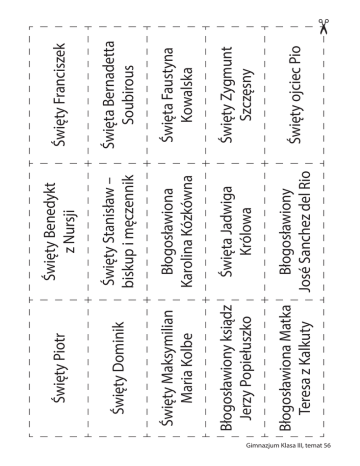 Gimnazjum Klasa III, temat 56 Błogosławiona Karolina Kózkówna Święta Jadwiga Królowa Święty Dominik Święty Maksymilian Maria Kolbe Błogosławiony ksiądz Jerzy Popiełuszko Błogosławiona Matka Błogosławiony Teresa z Kalkuty José Sanchez del Rio Święta Bernadetta Soubirous Święty Stanisław – biskup i męczennik Święty Piotr Święty ojciec Pio Święty Zygmunt Szczęsny Święta Faustyna Kowalska Święty Franciszek Święty Benedykt z Nursji Gimnazjum Klasa III, temat 56 czemu może uzyskać większe zyski. mi czy banerami na stadionie sportowym, dzięki firma patronująca jest reklamowana np. plakata- rzenia kulturalne lub kluby sportowe. W zamian lub kilka firm finansują lub promują osoby, wyda- Patronat to rodzaj sponsoringu, w którym jedna Gimnazjum Klasa III, temat 56 kreśla rangę danego wydarzenia. także finansowym. Przede wszystkim jednak pod- ze wsparciem duchowym, medialnym, a czasem nat np. prezydenta państwa lub miasta łączy się wydarzenia kulturalnego lub społecznego. Patro- wym, które ma podkreślać szczególny charakter Patronat honorowy jest wyróżnieniem honoro- czasze pełne kadzideł oznaczają modlitwę Baranek oznacza Chrystusa Odkupiciela tron Boga oznacza królewską władzę Boga nad światem żar symbol ognia, który sprawi, że modlitwy uniosą się w górę złoty ołtarz symbol Chrystusa dym kadzideł oznacza modlitwę i uwielbienie Boga czasze pełne kadzideł oznaczają modlitwę Baranek oznacza Chrystusa Odkupiciela tron Boga oznacza królewską władzę Boga nad światem żar symbol ognia, który sprawi, że modlitwy uniosą się w górę złoty ołtarz symbol Chrystusa dym kadzideł oznacza modlitwę i uwielbienie Boga czasze pełne kadzideł oznaczają modlitwę Baranek oznacza Chrystusa Odkupiciela tron Boga oznacza królewską władzę Boga nad światem żar symbol ognia, który sprawi, że modlitwy uniosą się w górę złoty ołtarz symbol Chrystusa dym kadzideł oznacza modlitwę i uwielbienie Boga czasze pełne kadzideł oznaczają modlitwę Baranek oznacza Chrystusa Odkupiciela tron Boga oznacza królewską władzę Boga nad światem żar symbol ognia, który sprawi, że modlitwy uniosą się w górę złoty ołtarz symbol Chrystusa dym kadzideł oznacza modlitwę i uwielbienie Boga Gimnazjum Klasa III, temat 56 Korzystając z zapisu na tablicy i treści z podręcznika, wpisz, co według ciebie jest potrzebne do świętości. Osobisty przepis na świętość: Każdego dnia: odrobinę dużo często rzadko nie używać nigdy pamiętać, że… Napisz krótką modlitwę do swojego patrona o pomoc w realizowaniu przepisu. ……………………………………………………………………………………………………………………… ……………………………………………………………………………………………………………………… ……………………………………………………………………………………………………………………… Korzystając z zapisu na tablicy i treści z podręcznika, wpisz, co według ciebie jest potrzebne do świętości. Osobisty przepis na świętość: Każdego dnia: odrobinę dużo często rzadko nie używać nigdy pamiętać, że… Napisz krótką modlitwę do swojego patrona o pomoc w realizowaniu przepisu. ……………………………………………………………………………………………………………………… ……………………………………………………………………………………………………………………… ……………………………………………………………………………………………………………………… Korzystając z zapisu na tablicy i treści z podręcznika, wpisz, co według ciebie jest potrzebne do świętości. Osobisty przepis na świętość: Każdego dnia: odrobinę dużo często rzadko nie używać nigdy pamiętać, że… Napisz krótką modlitwę do swojego patrona o pomoc w realizowaniu przepisu. ……………………………………………………………………………………………………………………… ……………………………………………………………………………………………………………………… ……………………………………………………………………………………………………………………… Gimnazjum Klasa III, temat 56