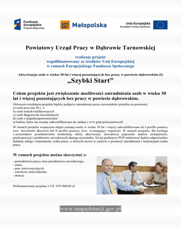 Powiatowy Urząd Pracy w Dąbrowie Tarnowskiej realizuje projekt współfinansowany ze środków Unii Europejskiej w ramach Europejskiego Funduszu Społecznego Aktywizacja osób w wieku 30 lat i więcej pozostających bez pracy w powiecie dąbrowskim (I) „Szybki Start” Celem projektu jest zwiększenie możliwości zatrudnienia osób w wieku 30 lat i więcej pozostających bez pracy w powiecie dąbrowskim. Głównym rezultatem projektu będzie podjęcie zatrudnienia przez uczestników projektu na poziomie: a) osób powyżej 50 r. ż. b) osób niskokwalifikowanych c) osób długotrwale bezrobotnych d) osób z niepełnosprawnościami e) kobiet, które nie zostały zakwalifikowane do żadnej z w/w grup priorytetowych W ramach projektu wsparciem objęte zostaną osoby w wieku 30 lat i więcej zakwalifikowane do I profilu pomocy (tzw. bezrobotni aktywni) lub II profilu pomocy (tzw. wymagający wsparcia). W ramach projektu, dla każdego z uczestników przedstawienie konkretnej oferty aktywizacji zawodowej poprzedzi analiza umiejętności, predyspozycji i problemów zawodowych danego uczestnika. Na tej podstawie PUP realizować będzie odpowiednio dobrane usługi i instrumenty rynku pracy, o których mowa w ustawie o promocji zatrudnienia i instytucjach rynku pracy. W ramach projektu można skorzystać z: - pośrednictwa pracy oraz poradnictwa zawodowego, - stażu, - prac interwencyjnych, - szkolenia indywidualne, - dotacji. Dofinansowanie projektu z UE: 878 000,00 zł www.mapadotacji.gov.pl