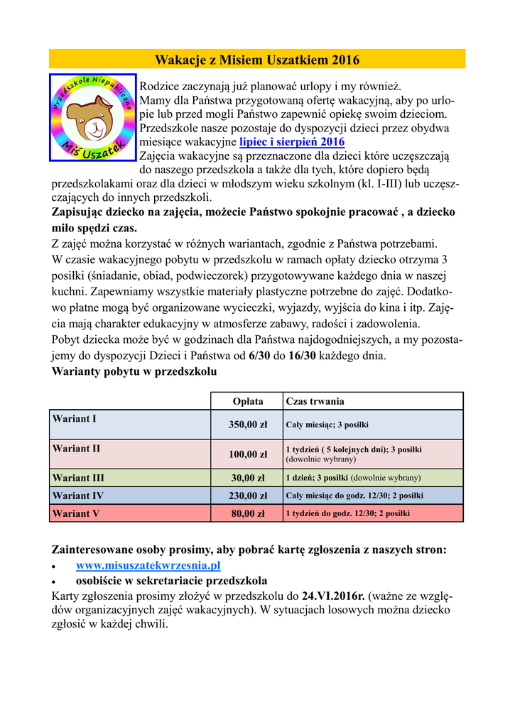 Wakacje z Misiem Uszatkiem 2016 Rodzice zaczynają już planować urlopy i my również. Mamy dla Państwa przygotowaną ofertę wakacyjną, aby po urlopie lub przed mogli Państwo zapewnić opiekę swoim dzieciom. Przedszkole nasze pozostaje do dyspozycji dzieci przez obydwa miesiące wakacyjne lipiec i sierpień 2016 Zajęcia wakacyjne są przeznaczone dla dzieci które uczęszczają do naszego przedszkola a także dla tych, które dopiero będą przedszkolakami oraz dla dzieci w młodszym wieku szkolnym (kl. I-III) lub uczęszczających do innych przedszkoli. Zapisując dziecko na zajęcia, możecie Państwo spokojnie pracować , a dziecko miło spędzi czas. Z zajęć można korzystać w różnych wariantach, zgodnie z Państwa potrzebami. W czasie wakacyjnego pobytu w przedszkolu w ramach opłaty dziecko otrzyma 3 posiłki (śniadanie, obiad, podwieczorek) przygotowywane każdego dnia w naszej kuchni. Zapewniamy wszystkie materiały plastyczne potrzebne do zajęć. Dodatkowo płatne mogą być organizowane wycieczki, wyjazdy, wyjścia do kina i itp. Zajęcia mają charakter edukacyjny w atmosferze zabawy, radości i zadowolenia. Pobyt dziecka może być w godzinach dla Państwa najdogodniejszych, a my pozostajemy do dyspozycji Dzieci i Państwa od 6/30 do 16/30 każdego dnia. Warianty pobytu w przedszkolu Opłata Wariant I Czas trwania 350,00 zł Cały miesiąc; 3 posiłki 100,00 zł 1 tydzień ( 5 kolejnych dni); 3 posiłki (dowolnie wybrany) Wariant III 30,00 zł 1 dzień; 3 posiłki (dowolnie wybrany) Wariant IV 230,00 zł Cały miesiąc do godz. 12/30; 2 posiłki Wariant V 80,00 zł Wariant II 1 tydzień do godz. 12/30; 2 posiłki Zainteresowane osoby prosimy, aby pobrać kartę zgłoszenia z naszych stron: www.misuszatekwrzesnia.pl osobiście w sekretariacie przedszkola Karty zgłoszenia prosimy złożyć w przedszkolu do 24.VI.2016r. (ważne ze względów organizacyjnych zajęć wakacyjnych). W sytuacjach losowych można dziecko zgłosić w każdej chwili.