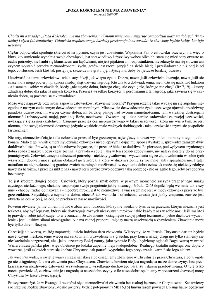 „POZA KOŚCIOŁEM NIE MA ZBAWIENIA” br. Jacek Salij OP Chodzi mi o zasadę: „Poza Kościołem nie ma zbawienia.” W moim mniemaniu sugeruje ona podział ludzi na dobrych (katolików) i złych (niekatolików). Człowieka współczesnego bardziej przekonuje inna zasada: że zbawiony będzie każdy, kto żyje uczciwie. Ciężar odpowiedzi spróbuję skierować na pytanie, czym jest zbawienie. Wspomina Pan o człowieku uczciwym, a więc o kimś, kto sumiennie wypełnia swoje obowiązki, jest sprawiedliwy i życzliwy wobec bliźnich, stara się mieć oczy otwarte na cudze potrzeby, nie hańbi się kłamstwem ani łapówkami, nie jest pijakiem ani rozpustnikiem, nie zdarzyło mu się słowem ani czynem wystąpić przeciw nienarodzonemu życiu, gotów jest raczej przyjąć na siebie biedę i prześladowanie niż odejść od tego, co słuszne. Jeśli ktoś tak postępuje, szczerze mu gratuluję. I życzę mu, żeby był jeszcze bardziej uczciwy. Uczciwość da temu człowiekowi wiele satysfakcji już w tym życiu. Dobro, nawet jeśli człowieka kosztuje, nawet jeśli się czasem dla niego pocierpi, przynosi z sobą jakąś dziwną nagrodę. Kto zna to z doświadczenia, nie może się nadziwić ludziom - a i samemu sobie: w chwilach, kiedy „nie czynię dobra, którego chcę, ale czynię zło, którego nie chcę” (Rz 7,19) - którzy zdradzają dobro dla jakichś innych korzyści. Przecież wszelkie korzyści w porównaniu z tą nagrodą, jaka zawiera się w czynieniu dobra, są pozorne, są tak zwodnicze! Może więc naprawdę uczciwość zapewni człowiekowi zbawienie wieczne? Przypuszczenie takie wydaje mi się zupełnie niezgodne z naszym codziennym doświadczeniem moralnym. Mianowicie doświadczenie życia uczciwego ujawnia przedziwny paradoks uczciwości: im więcej czynię dobra, im bardziej panuję nad swoimi namiętnościami, tym wyraźniej dostrzegam ułomność i robaczywość mojej, pożal się Boże, uczciwości. Owszem, są ludzie bardzo zadowoleni ze swojej uczciwości, uważający się za nieskazitelnych. Czujemy przecież coś nieprawdziwego w takiej uczciwości, która nie wie o tym, że jest ułomna, albo swoją ułomność dostrzega jedynie w jakichś mało ważnych drobiazgach - taką uczciwość nazywa się pospolicie faryzeizmem. Niestety, niemożliwością jest dla człowieka przestać być grzesznym, największym nawet wysiłkiem moralnym tego nie dokonam. Mało tego: wysiłek moralny, czyniąc człowieka nieco lepszym i dając mu sporo satysfakcji, sprowadza zarazem dwie dotkliwe boleści. Prawda, są to bóle zdrowe, bogacące, ale przecież bóle, i to dotkliwe. Po pierwsze, pod wpływem czynionego dobra spada z naszych oczu część bielma, a prawda o sobie, jaką w ten sposób zdobywamy, nie należy niestety do najprzyjemniejszych. Człowiek zaczyna odczuwać potrzebę - niekiedy gwałtowną - wyzwolenia się ze zła, uwolnienia w sobie tych wszystkich dobrych mocy, jakimi obdarzył go Stwórca, a które w dużym stopniu są we mnie jakby sparaliżowane. I tutaj natrafiam na nieprzekraczalną granicę swoich moralnych możliwości: w czynieniu dobra człowiek może się niekiedy zdobyć nawet na heroizm, a przecież nikt z nas - nawet jeśli bardzo żywo odczuwa taką potrzebę - nie osiągnie tego, żeby był dobrym bez reszty. To jest źródłem drugiej boleści. Człowiek, który poznał smak dobra, w pewnym momencie zaczyna pragnąć jego smaku czystego, nieskażonego, chciałby zaspokajać swoje pragnienie jakby z samego źródła. Otóż dopóki będą we mnie takie czy inne - choćby trudne do nazwania - niedobre mroki, jest to niemożliwe. Tymczasem nie jest w mocy człowieka przestać być grzesznikiem. Satysfakcja z czynienia dobra, chociaż tak wzniosła i szlachetna, zawsze jest jakby zmącona, zawsze jest otwarta na coś więcej, na coś, co przekracza nasze możliwości. Powiem otwarcie: ja nie umiem mówić o zbawieniu ludziom, którzy nie wiedzą o tym, że są grzeszni, którym nieznana jest tęsknota, aby być lepszym, którzy nie dostrzegają różnych nieczystych mroków, jakie każdy z nas w sobie nosi. Jeśli zaś ktoś tę prawdę o sobie jakoś czuje, to wie zarazem, że zbawienie - osiągnięcie swojej pełnej tożsamości, pełne duchowe wyzwolenie - jest ludzkimi siłami nieosiągalne. Nie ma żadnej proporcji między naszą uczciwością a zbawieniem. Zbawienie może być tylko darem Bożym. Chrześcijanie wierzą, że Bóg naprawdę udziela ludziom daru zbawienia. Wierzymy, że w Jezusie Chrystusie dar ten będzie nawet czymś nieskończenie więcej niż całkowitym wyzwoleniem z grzechu: przy końcu naszej drogi nie tylko staniemy się nieskazitelnie bezgrzeszni, ale - jako uczestnicy Bożej natury, jako synowie Boży - będziemy oglądali Boga twarzą w twarz! Wiara chrześcijańska głosi więc obietnice po ludzku zupełnie nieprawdopodobne. Realnego kształtu nabierają one dopiero wówczas, jeśli człowiek stara się kochać Chrystusa, jak potrafi, wypełniać Jego przykazania, karmić się Jego ciałem. Jak więc Pan widzi, w świetle wiary chrześcijańskiej albo osiągniemy zbawienie w Chrystusie i przez Chrystusa, albo w ogóle go nie osiągniemy. Nie ma zbawienia poza Chrystusem. Zbawienie bowiem nie jest nagrodą za nasze dobre czyny. Jest przekraczającym możliwości człowieka wyzwoleniem z wszelkiego duchowego paraliżu i darem przebóstwienia. O tyle tylko można powiedzieć, że zbawienie jest nagrodą za nasze dobre czyny, o ile nasze dobro spełniamy w przestrzeni zbawczej mocy Chrystusa (w łasce uświęcającej). Proszę zauważyć, że w Ewangelii raz mówi się o niemożliwości zbawienia bez realnej łączności z Chrystusem: „Kto uwierzy i ochrzci się, będzie zbawiony; kto nie uwierzy, będzie potępiony.” (Mk 16,16) Innym razem powiada Ewangelia, że będziemy sądzeni z naszych czynów i w zależności od tego wejdziemy do chwały wiecznej albo zostaniemy odrzuceni. (Mt 25) Nie ma sprzeczności m