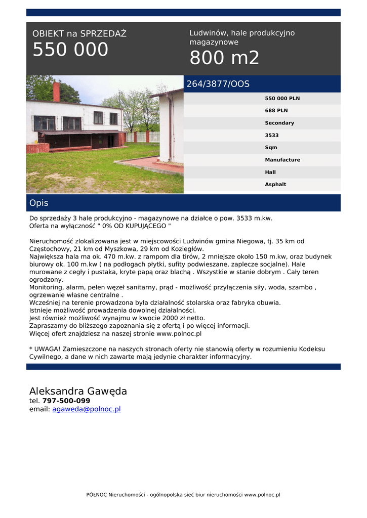 OBIEKT na SPRZEDAŻ 550 000 Ludwinów, hale produkcyjno magazynowe 800 m2 264/3877/OOS 550 000 PLN 688 PLN Secondary 3533 Sqm Manufacture Hall Asphalt Opis Do sprzedaży 3 hale produkcyjno - magazynowe na działce o pow. 3533 m.kw. Oferta na wyłączność " 0% OD KUPUJĄCEGO " Nieruchomość zlokalizowana jest w miejscowości Ludwinów gmina Niegowa, tj. 35 km od Częstochowy, 21 km od Myszkowa, 29 km od Koziegłów. Największa hala ma ok. 470 m.kw. z rampom dla tirów, 2 mniejsze około 150 m.kw, oraz budynek biurowy ok. 100 m.kw ( na podłogach płytki, sufity podwieszane, zaplecze socjalne). Hale murowane z cegły i pustaka, kryte papą oraz blachą . Wszystkie w stanie dobrym . Cały teren ogrodzony. Monitoring, alarm, pełen węzeł sanitarny, prąd - możliwość przyłączenia siły, woda, szambo , ogrzewanie własne centralne . Wcześniej na terenie prowadzona była działalność stolarska oraz fabryka obuwia. Istnieje możliwość prowadzenia dowolnej działalności. Jest również możliwość wynajmu w kwocie 2000 zł netto. Zapraszamy do bliższego zapoznania się z ofertą i po więcej informacji. Więcej ofert znajdziesz na naszej stronie www.polnoc.pl * UWAGA! Zamieszczone na naszych stronach oferty nie stanowią oferty w rozumieniu Kodeksu Cywilnego, a dane w nich zawarte mają jedynie charakter informacyjny. Aleksandra Gawęda tel. 797-500-099 email: [email protected] PÓŁNOC Nieruchomości - ogólnopolska sieć biur nieruchomości www.polnoc.pl Powered by TCPDF (www.tcpdf.org)