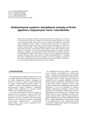dr inż. WŁODZIMIERZ BOROŃ mgr inż. TOMASZ GĄSIOR dr inż. ARTUR KOZŁOWSKI mgr inż. JERZY ZDRZAŁEK Instytut Technik Innowacyjnych EMAG Zastosowanie systemu zarządzania energią w firmie zgodnie z wytycznymi norm i standardów Artykuł dotyczy aktualnej tematyki zwiększania efektywności energetycznej w firmach. We wprowadzeniu omówiono problem coraz większego zapotrzebowania na energię w skali całej gospodarki. Jednocześnie zwrócono uwagę na nieefektywne wykorzystywanie dostępnych zasobów energii i wymieniono główne przyczyny tej sytuacji. Następnie scharakteryzowano oferowane na rynku nowoczesne komputerowe systemy zarządzania energią (EMS – Energy Management System) oraz wskazano zalety stosowania takich systemów. Przedstawiono etapy budowy systemu EMS i działań organizacyjnych wymaganych do wprowadzenia zarządzania energią do struktury organizacyjnej firmy, zgodnie z wytycznymi normy PN-EN ISO 50001 oraz ogólnie stosowanymi standardami ISO 9001 i ISO 14001. W końcowej części artykułu zaprezentowano przykłady systemów EMS zastosowanych w firmie telekomunikacyjnej i w zakładzie górniczym. W podsumowaniu wyrażono nadzieję, że korzyści wynikające z zastosowania systemów EMS mogą stanowić zachętę dla zainteresowanych firm do kształtowania swojej polityki energetycznej przy użyciu takich systemów. 1. WPROWADZENIE W ostatnich latach zauważalne są znaczące wzrosty cen energii elektrycznej. Ma to wpływ na coraz wyższe koszty eksploatacji obiektów. Występują też problemy związane z większym zapotrzebowaniem na energię, uzależnieniem od dostaw energii i jej nośników z państw niestabilnych politycznie oraz podwyższeniem kosztów produkcji i eksploatacji zasobów (ściśle wiążącym się z kwestią ochrony klimatu ziemi i efektem cieplarnianym). W celu przeciwdziałania powyższej sytuacji podejmuje się szereg inicjatyw, których celem podstawowym jest podniesienie efektywności wykorzystania energii we wszystkich sektorach gospodarki (w tym ograniczenie zużycia), zwiększenie wykorzystania alternatywnych i odnawialnych źródeł energii, a także wzrost świadomości użytkowników energii [2]. W działalności biznesowej jednym z najważniejszych czynników wpływających na wypracowanie zysku i utrzymanie konkurencyjności jest redukcja zasobów. Jednak koszty materiałów, nakładów pracy i utrzymania ruchu w firmie mogą być trudne do zredukowania bez zachwiania delikatnej równowagi pomiędzy jakością produkcji i solidnością procesów. Zwykle łatwiej można zredukować koszty energii i poprawić efektywność energetyczną procesów produkcyjnych. W tym celu niezbędne są określone działania organizacyjne spełniające zalecenia międzynarodowych standardów, umożliwiające zarówno optymalizację zużycia energii, jak i racjonalne zarządzanie kosztami energii. Działania te powinny być wsparte wykorzystaniem odpowiedniego narzędzia w postaci komputerowego systemu zarządzania energią (EMS – Energy Management System), który pozwoli na zautomatyzowanie wielu niezbędnych działań i dostarczenie odpowiednich danych do podejmowania racjonalnych decyzji. 14 MECHANIZACJA I AUTOMATYZACJA GÓRNICTWA 2. KOMPUTEROWE SYSTEMY EMS OFEROWANE NA RYNKU Na rynku światowym oferowanych jest wiele różnorodnych komputerowych systemów typu EMS [1020]. W ogólnie dostępnych materiałach informacyjnych można znaleźć opisy co najmniej kilkudziesięciu systemów EMS. Dlatego do analizy wybrano reprezentatywne systemy czołowych firm lub bardziej rozpowszechnione systemy z różnych krajów, na temat których dostępne są informacje przydatne do analizy: PowerLogic ION EEM – Demand (Schneider Electric) – system zarządzania energią przedsiębiorstwa. Do zastosowania w przemyśle, od dyspozytorni do stanowisk na hali fabrycznej. Także w firmach użyteczności publicznej, w budynkach, systemach infrastruktury. System jest odpowiedni dla dowolnie dużych firm o złożonych procesach i wielu lokalizacjach. PowerLogic EPO – Energy Profiler Online (Schneider Electric) – system wizualizacji obciążenia i analizy danych. Głównie do zastosowania przez firmy dostarczające energię. System stanowi głównie interfejs użytkownika i jest specjalnie dostosowany do oferowania w ramach usługi zarządzania energią w firmie z danymi przechowywanymi w centrum danych oferenta. Oferowane środowisko jest odpowiednio zabezpieczone przed utratą danych, jak i wyciekiem informacji. PowerLogic System Manager (Schneider Electric) – system zarządzania energią (software). Do zastosowania głównie w centrach danych i systemach infrastruktury miejskiej. GrinPoint Energy Manager (GrinPoint, USA) – platforma zarządzania energią. Do zastosowań w przedsiębiorstwach, instytucjach, firmach użyteczności publicznej, budynkach, domach, stacjach ładowania samochodów. AVReporter (Kensys, Węgry) – oprogramowanie zarządzania energią. Do szerokiego zakresu zastosowań. GBI/VBI (Johnstone McLamb, USA) – moduły: Visual Business Intelligence, Energy Management Support. Do szerokiego zakresu zastosowań. Graficzne i geograficzne przedstawienie danych zebranych w hurtowni. Analizy i wizualizacyjny business intelligence. EnergyCAP (EnergyCAP, USA) – system zarządzania energią (software). Do szerokiego zakresu zastosowań. Wiele wykonanych aplikacji. SENTRON powermanager (Siemens) – system zarządzania energią (software i urządzenia). Do za- stosowań w małych i średnich obiektach przemysłowych oraz w budynkach. cpmPlus EnergyManager (ABB) – system zarządzania energią. Do zastosowań przemysłowych. Liebert SiteScan Web System (Emerson, USA) – adaptacyjny proaktywny system monitorowania. Do różnych zastosowań o znaczeniu krytycznym. DIALOG lokalny software (Ladys & Gyr) – system monitoringu energii. Do szerokiego zakresu zastosowań. EIServer (EnergyICT) – platforma zarządzania danymi pomiarowymi (softwa