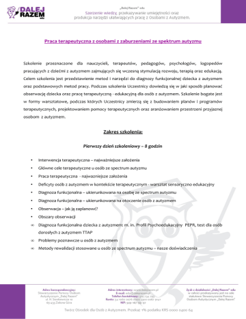 Praca terapeutyczna z osobami z zaburzeniami ze spektrum autyzmu Szkolenie przeznaczone dla nauczycieli, terapeutów, pedagogów, psychologów, logopedów pracujących z dziećmi z autyzmem zajmujących się wczesną stymulacją rozwoju, terapią oraz edukacją. Celem szkolenia jest przedstawienie metod i narzędzi do diagnozy funkcjonalnej dziecka z autyzmem oraz podstawowych metod pracy. Podczas szkolenia Uczestnicy dowiedzą się w jaki sposób planować obserwację dziecka oraz pracę terapeutyczną - edukacyjną dla osób z autyzmem. Szkolenie bogate jest w formy warsztatowe, podczas których Uczestnicy zmierzą się z budowaniem planów i programów terapeutycznych, projektowaniem pomocy terapeutycznych oraz aranżowaniem przestrzeni przyjaznej osobom z autyzmem. Zakres szkolenia: Pierwszy dzień szkoleniowy – 8 godzin • Interwencja terapeutyczna – najważniejsze założenia • Główne cele terapeutyczne u osób ze spectrum autyzmu • Praca terapeutyczna - najwazniejsze założenia • Deficyty osób z autyzmem w kontekście terapeutycznym - warsztat sensoryczno edukacyjny • Diagnoza funkcjonalna – ukierunkowana na osobę ze spectrum autyzmu • Diagnoza funkcjonalna – ukierunkowana na otoczenie osób z autyzmem • Obserwacja – jak ją zaplanowć? • Obszary obserwacji • Diagnoza funkcjonalna dziecka z autyzmem: m. in. Profil Psychoedukacyjny PEPR, test dla osób dorosłych z autyzmem TTAP • Problemy poznawcze u osób z autyzmem • Metody rewalidacji stosowane u osób ze spectrum autyzmu – nasze doświadczenia Drugi dzień szkoleniowy – 8 godzin • Wczesna interwencja terapeutyczna - czyli od czego rozpocząć prace z małym dzieckiem z autyzmem? • Wyznaczanie celów terapeutycznych oraz podstawowych kierunków oddziaływań na podstawie diagnozy funkcjonalnej. • • • Wykorzystanie technik behavioralnych – wzmacniania zachowań pożądanych. Model TEACCH: • struktura czasu i przestrzeni • plany dnia • plany zajęć Sposoby tworzenia planów dnia, zajęć, aktywności oraz zasady wprowadzania ich w środowisku domowym i placówkach edukacyjnych • Zabawa jako podstawowa aktywność dziecka - charakterystyka zabawy dzieci z autyzmem oraz terapia zabawy: • • Zabawa "na niby", a poziom rozwoju Teorii Umysłu • Przykłady zabaw wspierających rozwój Teorii Umysłu • Etapy uczenia zabawy Zaburzenia Teorii Umysłu u osób ze spectrum autyzmu • Rozpoznawanie ekspresji mimicznych • Pięc poziomów rozumienie stanów wiedzy • Pięc poziomów rozumienia stanów umysłu • Jak uczyć dzieci z autyzmem czytania umysłu ? – wg Baron - Cohen'a • Wspieranie kompetencji komunikacyjnych i społecznych • Terapie wspomagające rozwój dziecka z autyzmem – metoda Knill, metoda ruchu rozwijającego Weroniki Sherborne, terapia integracji sensorycznej, terapia taktylna i inne. Szkolenie prowadzi dwóch terapeutów z wieloletnim doświadczeniem w pracy edukacyjnej i terapeutycznej z osobami z zaburzeniami ze spectrum autyzmu. • Forma szkolenia: wykłady, warsztaty, prezentacje wizualne • Czas szkolenia: dwa dni szkoleniowe, 16 godzin • Każdy uczestnik otrzymuje pakiet materiałów szkoleniowych oraz zaświadczenie udziału w szkoleniu.
