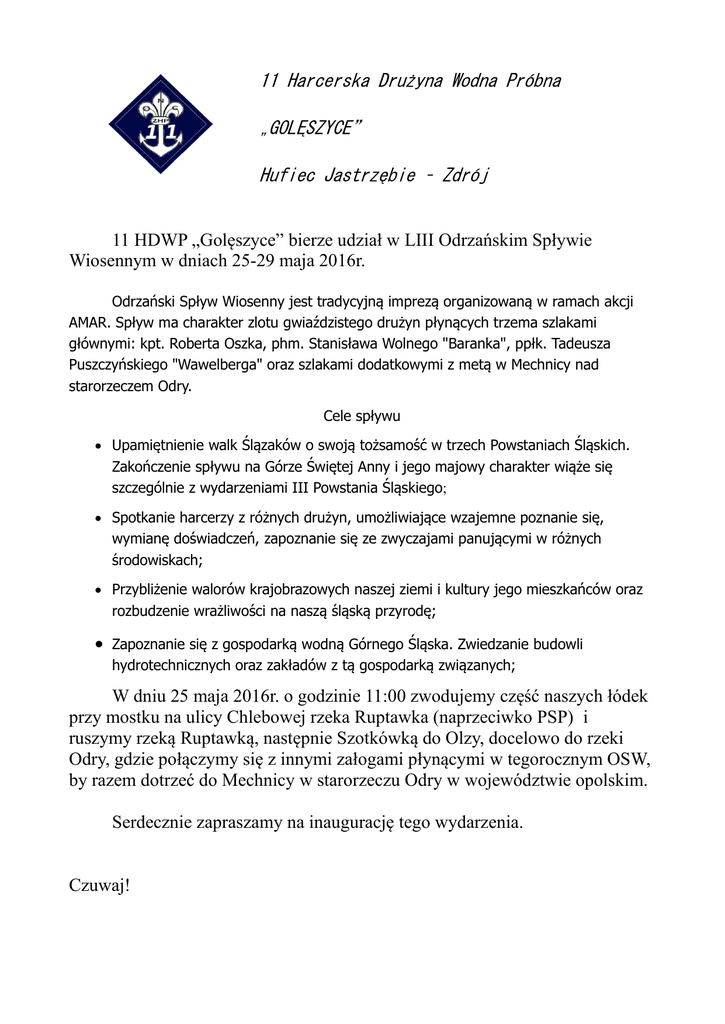 11 Harcerska Drużyna Wodna Próbna „GOLĘSZYCE” Hufiec Jastrzębie – Zdrój 11 HDWP „Golęszyce” bierze udział w LIII Odrzańskim Spływie Wiosennym w dniach 25-29 maja 2016r. Odrzański Spływ Wiosenny jest tradycyjną imprezą organizowaną w ramach akcji AMAR. Spływ ma charakter zlotu gwiaździstego drużyn płynących trzema szlakami głównymi: kpt. Roberta Oszka, phm. Stanisława Wolnego "Baranka", ppłk. Tadeusza Puszczyńskiego "Wawelberga" oraz szlakami dodatkowymi z metą w Mechnicy nad starorzeczem Odry. Cele spływu Upamiętnienie walk Ślązaków o swoją tożsamość w trzech Powstaniach Śląskich. Zakończenie spływu na Górze Świętej Anny i jego majowy charakter wiąże się szczególnie z wydarzeniami III Powstania Śląskiego; Spotkanie harcerzy z różnych drużyn, umożliwiające wzajemne poznanie się, wymianę doświadczeń, zapoznanie się ze zwyczajami panującymi w różnych środowiskach; Przybliżenie walorów krajobrazowych naszej ziemi i kultury jego mieszkańców oraz rozbudzenie wrażliwości na naszą śląską przyrodę; Zapoznanie się z gospodarką wodną Górnego Śląska. Zwiedzanie budowli hydrotechnicznych oraz zakładów z tą gospodarką związanych; W dniu 25 maja 2016r. o godzinie 11:00 zwodujemy część naszych łódek przy mostku na ulicy Chlebowej rzeka Ruptawka (naprzeciwko PSP) i ruszymy rzeką Ruptawką, następnie Szotkówką do Olzy, docelowo do rzeki Odry, gdzie połączymy się z innymi załogami płynącymi w tegorocznym OSW, by razem dotrzeć do Mechnicy w starorzeczu Odry w województwie opolskim. Serdecznie zapraszamy na inaugurację tego wydarzenia. Czuwaj!