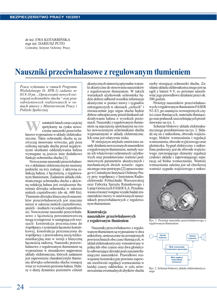 BEZPIECZEÑSTWO PRACY 10/2001 dr in¿. EWA KOTARBIÑSKA mgr in¿. DARIUSZ PUTO Centralny Instytut Ochrony Pracy Nauszniki przeciwha³asowe z regulowanym t³umieniem Praca wykonana w ramach Programu Wieloletniego (b. SPR-1) zadanie nr 03.9.18 pn. Opracowanie nowych rozwi¹zañ ochronników s³uchu oraz prac wdro¿eniowych realizowanych w ramach umowy z Ministerstwem Pracy i Polityki Spo³ecznej ostatnich latach coraz czêciej spotykamy na rynku nowoczesne nauszniki przeciwha³asowe wyposa¿one w uk³ady elektroakustyczne. Takie ochronniki s³uchu s¹ zazwyczaj stosowane wówczas, gdy poza ochron¹ narz¹du s³uchu przed negatywnymi skutkami oddzia³ywania ha³asu wymagane s¹ jeszcze inne dodatkowe funkcje ochronnika s³uchu [1]. Nowoczesne nauszniki przeciwha³asowe z uk³adami elektronicznymi mo¿emy podzieliæ na trzy rodzaje: z aktywn¹ redukcj¹ ha³asu, z ³¹cznoci¹, z regulowanym t³umieniem. Zadaniem uk³adu elektronicznego ochronnika s³uchu z aktywn¹ redukcj¹ ha³asu jest zwiêkszenie t³umienia dwiêku ochronnika w zakresie niskich czêstotliwoci (do ok. 600 Hz). T³umienie dwiêku klasycznych nauszników przeciwha³asowych jest znacznie ni¿sze w zakresie niskich czêstotliwoci, ani¿eli rednich i wysokich czêstotliwoci. Nowoczesne nauszniki przeciwha³asowe z ³¹cznoci¹ porozumiewawcz¹ mog¹ wystêpowaæ w nastêpuj¹cych wersjach: konstrukcja przeznaczona do wspó³pracy z systemami ³¹cznoci komórkowej, konstrukcja przeznaczona do wspó³pracy z przewodow¹ sieci¹ telekomunikacyjn¹ oraz w wersji z klasyczn¹ ³¹cznoci¹ radiow¹. Nauszniki przeciwha³asowe z regulowanym t³umieniem s¹ wyposa¿one w stosunkowo najprostsze uk³ady elektroniczne, których zadaniem jest zapewnienie charakterystyki t³umienia dwiêku ochronnika s³uchu rosn¹cej wraz ze wzrostem poziomu ha³asu. Ha³asy o du¿ej dynamice poziomów cinieñ 24 akustycznych stanowi¹ optymalne warunki akustyczne do stosowania nauszników z regulowanym t³umieniem. W takich warunkach u¿ytkownik ochronnika bêdzie dobrze odbiera³ wszelkie informacje akustyczne w postaci mowy i sygna³ów ostrzegawczych w okresach cichych i równoczenie jego organ s³uchu bêdzie dobrze zabezpieczony przed skutkami oddzia³ywania ha³asu o wysokich poziomach. Nauszniki z regulowanym t³umieniem s¹ najczêciej spotykanymi na rynku nowoczesnymi ochronnikami s³uchu wyposa¿onymi w uk³ady elektroniczne. Ich cena jest relatywnie niska. W niniejszym artykule omówiono zasady dzia³ania nowoczesnych nauszników z regulowanym t³umieniem, metody oceny ich w³aciwoci ochronnych i u¿ytkowych oraz przedstawiono wartoci podstawowych parametrów akustycznych i mechanicznych dwóch wzorów: zagranicznego oraz prototypu [2] opracowanego w Centralnym Instytucie Ochrony Pracy przy wspó³pracy z Instytutem Radioelektroniki Politechniki Warszawskiej oraz Fabryk¹ Sprzêtu Ratunkowego i Lamp Górniczych FASER S.A. Przedstawiono równie¿ wstêpne wyniki badañ zrozumia³oci mowy w omówionych nausznikach przeciwha³asowych z regulowanym t³umieniem. Konstrukcja nauszników przeciwha³asowych z regulowanym t³umieniem Nauszniki przeciwha³asowe z regulowanym t³umieniem s¹ wyposa¿one w dwa mikrofony, umieszczone na zewnêtrznych powierzchniach obu czasz t³umi¹cych, w uk³ad elektroakustyczny wmontowany w jedn¹ lub obie czasze oraz dwa g³oniczki odtwarzaj¹ce dwiêki pod czaszami t³umi¹cymi nauszników. Prawid³owe rozwi¹zanie konstrukcyjne powinno zapewniæ mo¿liwoæ regulacji wzmocnienia w ka¿dej czaszy oddzielnie, w celu zrównowa¿enia ewentualnych ubytków s³uchu osoby stosuj¹cej ochronniki s³uchu. Zasilanie uk³adu elektroakustycznego jest na ogó³ z baterii 9 V, co powinno umo¿liwiaæ jego prawid³owe dzia³anie przez ok. 500 godzin. Prototyp nauszników przeciwha³asowych z regulowanym t³umieniem FASER N1-E3, po usuniêciu wewnêtrznych czêci czasz t³umi¹cych, materia³u t³umi¹cego oraz poduszek uszczelniaj¹cych przedstawiono na rys. 1. Schemat blokowy uk³adu elektroakustycznego przedstawiono na rys. 2. Sk³ada siê on z mikrofonu, obwodu wejciowego, bloków wzmocnienia i regulacji wzmocnienia, obwodu wyjciowego oraz g³oniczka. Sygna³ elektryczny z mikrofonu podawany jest do obwodu wejciowego zawieraj¹cego elementy regulacji czu³oci uk³adu i zapewniaj¹cego separacjê od bloku wzmocnienia. Wartoæ wzmocnienia zale¿na jest od chwilowej wartoci sygna³u wejciowego z mikro- Rys. 1. Prototyp nausznika przeciwha³asowego z regulowanym t³umieniem Rys. 2. Schemat blokowy uk³adu elektroakustycznego BEZPIECZEÑSTWO PRACY 10/2001 fonu i ustalana jest za pomoc¹ bloku regulacji wzmocnienia, dzia³aj¹cego w uk³adzie sprzê¿enia zwrotnego. Wraz ze wzrostem sygna³u elektrycznego z mikrofonu maleje wartoæ wzmocnienia uk³adu. Po korekcji wzmocnienia sygna³ elektryczny przechodzi do uk³adu wyjciowego, a nastêpnie do g³oniczka odtwarzaj¹cego dwiêki otoczenia. W³aciwoci ochronne i u¿ytkowe nauszników z regulowanym t³umieniem W³aciwoci ochronne i u¿ytkowe nauszników przeciwha³asowych z regulowanym t³umieniem, tak jak wszystkich innych ochronników s³uchu, s¹ warunkowane w³aciwociami akustycznymi i mechanicznymi, które s¹ badane i oceniane w procesie certyfikacji na znak bezpieczeñstwa B. Metody badañ w³aciwoci akustycznych i mechanicznych [3] oraz kryteria ich oceny s¹ zgodne z norm¹ europejsk¹ EN 352-4:2001 Hearing protectors Safety requirements and testing Part:4: Level-dependent ear-muffs. Podczas badañ akustycznych nauszników z regulowanym t³umieniem mierzono dwa podstawowe jego parametry: t³umienie dwiêku przy wy³¹czonym uk³adzie elektroakustycznym oraz poziomy krytyczne H, M, L przy w³¹czonym uk³adzie elektroakustycznym i maksymalnym jego wzmocnieniu. Badania t³umienia dwiêku nauszników przeciwha³asowych z regulowanym t³umieniem, tak samo jak w przypadku badañ klasycznych ochronników s³uchu, polegaj¹ na pomiarach poziomu cinienia akustycznego sygna³ów testo