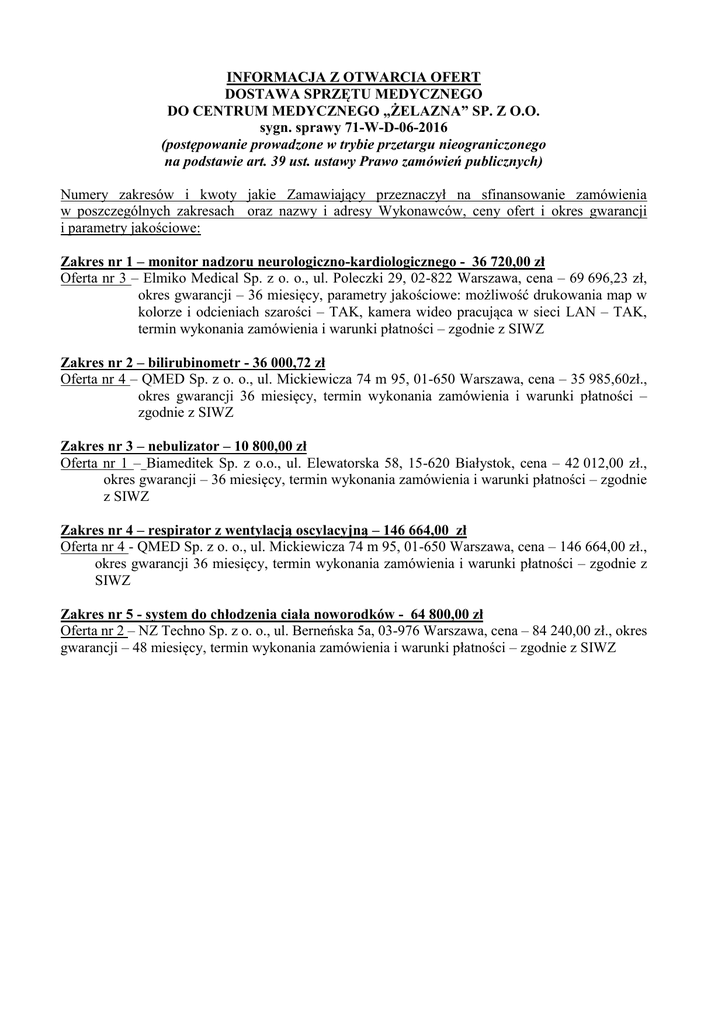 INFORMACJA Z OTWARCIA OFERT DOSTAWA SPRZĘTU MEDYCZNEGO DO CENTRUM MEDYCZNEGO „ŻELAZNA” SP. Z O.O. sygn. sprawy 71-W-D-06-2016 (postępowanie prowadzone w trybie przetargu nieograniczonego na podstawie art. 39 ust. ustawy Prawo zamówień publicznych) Numery zakresów i kwoty jakie Zamawiający przeznaczył na sfinansowanie zamówienia w poszczególnych zakresach oraz nazwy i adresy Wykonawców, ceny ofert i okres gwarancji i parametry jakościowe: Zakres nr 1 – monitor nadzoru neurologiczno-kardiologicznego - 36 720,00 zł Oferta nr 3 – Elmiko Medical Sp. z o. o., ul. Poleczki 29, 02-822 Warszawa, cena – 69 696,23 zł, okres gwarancji – 36 miesięcy, parametry jakościowe: możliwość drukowania map w kolorze i odcieniach szarości – TAK, kamera wideo pracująca w sieci LAN – TAK, termin wykonania zamówienia i warunki płatności – zgodnie z SIWZ Zakres nr 2 – bilirubinometr - 36 000,72 zł Oferta nr 4 – QMED Sp. z o. o., ul. Mickiewicza 74 m 95, 01-650 Warszawa, cena – 35 985,60zł., okres gwarancji 36 miesięcy, termin wykonania zamówienia i warunki płatności – zgodnie z SIWZ Zakres nr 3 – nebulizator – 10 800,00 zł Oferta nr 1 – Biameditek Sp. z o.o., ul. Elewatorska 58, 15-620 Białystok, cena – 42 012,00 zł., okres gwarancji – 36 miesięcy, termin wykonania zamówienia i warunki płatności – zgodnie z SIWZ Zakres nr 4 – respirator z wentylacją oscylacyjną – 146 664,00 zł Oferta nr 4 - QMED Sp. z o. o., ul. Mickiewicza 74 m 95, 01-650 Warszawa, cena – 146 664,00 zł., okres gwarancji 36 miesięcy, termin wykonania zamówienia i warunki płatności – zgodnie z SIWZ Zakres nr 5 - system do chłodzenia ciała noworodków - 64 800,00 zł Oferta nr 2 – NZ Techno Sp. z o. o., ul. Berneńska 5a, 03-976 Warszawa, cena – 84 240,00 zł., okres gwarancji – 48 miesięcy, termin wykonania zamówienia i warunki płatności – zgodnie z SIWZ