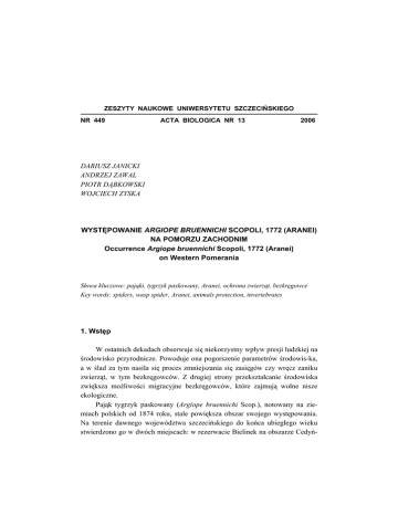 ZESZYTY NAUKOWE UNIWERSYTETU SZCZECIŃSKIEGO NR 449 ACTA BIOLOGICA NR 13 2006 DARIUSZ JANICKI ANDRZEJ ZAWAL PIOTR DĄBKOWSKI WOJCIECH ZYSKA WYSTĘPOWANIE ARGIOPE BRUENNICHI SCOPOLI, 1772 (ARANEI) NA POMORZU ZACHODNIM Occurrence Argiope bruennichi Scopoli, 1772 (Aranei) on Western Pomerania Słowa kluczowe: pająki, tygrzyk paskowany, Aranei, ochrona zwierząt, bezkręgowce Key words: spiders, wasp spider, Aranei, animals protection, invertebrates 1. Wstęp W ostatnich dekadach obserwuje się niekorzystny wpływ presji ludzkiej na środowisko przyrodnicze. Powoduje ona pogorszenie parametrów środowis-ka, a w ślad za tym nasila się proces zmniejszania się zasięgów czy wręcz zaniku zwierząt, w tym bezkręgowców. Z drugiej strony przekształcanie środowiska zwiększa możliwości migracyjne bezkręgowców, które zajmują wolne nisze ekologiczne. Pająk tygrzyk paskowany (Argiope bruennichi Scop.), notowany na ziemiach polskich od 1874 roku, stale powiększa obszar swojego występowania. Na terenie dawnego województwa szczecińskiego do końca ubiegłego wieku stwierdzono go w dwóch miejscach: w rezerwacie Bielinek na obszarze Cedyń- 116 Dariusz Janicki, Andrzej Zawal, Piotr Dąbkowski, Wojciech Zyska skiego Parku Krajobrazowego (Hesse 1939) oraz na wyspie Wolin (Urbański 1948; Rafalski 1953; Dziabaszewski 1965). Prowadzone badania wykazały nowe miejsca jego występowania. Celem pracy jest prezentacja nowych stanowisk tygrzyka na obszarze byłego województwa szczecińskiego. 2. Metodyka badań W niniejszej pracy przedstawiono nowe stanowiska tygrzyka, stwierdzone przez autorów w czasie prac terenowych nad innymi grupami bezkręgowców, a także na podstawie informacji od osób postronnych. Większość danych pochodzi z lat 1997–2000. Każdorazowo notowano liczbę sieci, płeć i dokładne umiejscowienie geograficzne. Stwierdzone stanowiska zostały przypisane do kwadratów w międzynarodowym systemie UTM. Wyniki przedstawiono graficznie na rysunku 1. 3. Wyniki badań W trakcie prac terenowych wykazano 27 nowych stanowisk tygrzyka paskowanego. 1. Teren Szczecina, na obszarze lasu komunalnego przy jeziorze Głębokie. Stanowisko znajduje się na grobli przy stawie Ustronie. Znaleziono 3 samice w lipcu 1996. Teren podmokły, pokryty wysoką roślinnością. UTM VV62. 2. Teren Szczecina, na obszarze użytku ekologicznego „Stawek na Gumieńcach”. Znaleziono 3 samice na sieciach w sierpniu 1998. Teren silnie podmokły, częściowo zalany przez strumień Bukowa. Pokryty trzciną. UTM VV61. 3. Teren Szczecina, przy ul. Struga i Iwaszkiewicza. Tygrzyka znaleziono po obu stronach ul. Struga. Obszar porośnięty roślinnością ruderalną, częściowo przekształcony przez człowieka. Dane z lata 1996. Stanowisko archiwalne, ponieważ wybudowano tu hipermarket „Real” (stanowisko uległo zniszczeniu). UTM VV71. Występowanie Argiope bruennichi Scopoli... Rys. 1. Stare i nowe stanowiska tygrzyka paskowanego Fig. 1. Old and new station wesp spider 117 118 Dariusz Janicki, Andrzej Zawal, Piotr Dąbkowski, Wojciech Zyska 4. Teren Szczecina, przy ul. Szosa Stargardzka, na wysokości ul. Karola Balińskiego. Stanowisko położone przy lesie, porośnięte roślinnością trawiastą, obserwacje z lata 1997. Stwierdzono co najmniej 20 osobników na poboczu drogi. UTM VV81. 5. Teren gminy Pyrzyce, 1 km na pn. od wsi Lipki. Stanowisko na suchym wzniesieniu od strony południowej. Znaleziono 1 okaz samicy na sieci w sierpniu 1998. Teren porośnięty niską roślinnością kserotermiczną. Dzikie wyrobisko piasku. UTM VU89. 6. Teren gminy Pyrzyce, przy drodze bocznej do wsi Lipki na trasie Szczecin –Żabów. Stanowisko porośnięte trawami, między polami uprawnymi. Znaleziono 54 osobniki, głównie samice, wzdłuż polnej drogi w lipcu 1998. UTM VU89. 7. Teren Parku Krajobrazowego „Dolina Dolnej Odry”. Stanowisko pokryte roślinnością trawiastą, na grobli przy moście łączącym Odrę Zachodnią i kanał Mała Regalica. Tygrzyk występował po obu stronach grobli. Znaleziono 274 osobniki po stronie południowej i 36 po stronie północno-zachodniej. W odległości ok. 50 m w kierunku Gryfina na grobli znaleziono następne 12 osobników i dalej, po ok. 100 m, 1 osobnika. Wszystkie stanowiska zaobserwowano w końcu lipca 1998. UTM VU69. 8. Teren Parku Krajobrazowego „Dolina Dolnej Odry”. Stanowisko na wspomnianej wyżej grobli na wysokości niemieckiego miasta Gartz, przy „Starej pompie”. Znaleziono 63 osobniki po południowej stronie grobli i 23 osobniki po stronie północnej. Obserwacje z końca lipca 1998. Teren porośnięty trawami na skraju zadrzewień. UTM VU69. 9. Teren Parku Krajobrazowego „Dolina Dolnej Odry”. Stanowisko wzdłuż drogi na grobli, między drzewami. Tygrzyki znajdowano na odcinku długości ok. 100 m (11 osobników). Dane z końca lipca 1998. UTM VU59. 10. Teren gminy Pyrzyce, glinianki przy wysypisku śmieci, 1 km za Żabowem na trasie do Pyrzyc. Stanowisko pokryte trawami przy polnej drodze i wzdłuż strumienia. Znaleziono 60 osobników w końcu sierpnia 1998. UTM VU99. 11. Teren gminy Banie. Stanowisko przy brzegu jeziora Dłużyna, niedaleko miasta Banie. Dane z 1997. UTM VU88. 12. Teren gminy Suchań, 1 km na południe od miasta Suchań. Nieznana liczba osobników. Dane z 1997. UTM WV20. Występowanie Argiope bruennichi Scopoli... 119 13. Teren gminy Nowe Warpno. Łąki przy wsi Myślibórz Mały. Kilkaset osobników, dane z 1997. UTM VV54. 14. Teren rezerwatu „Świdwie”, gmina Police. Stwierdzono dwa odrębne stanowiska, dane z 1998. UTM VV53. 15. Teren gminy Police. Stanowisko we wsi Węgornik. Znaleziono kilka osobników. UTM VV63. 16. Teren gminy Kamień Pomorski. Stanowisko przy wsi Chomino, ok. 12 km od Kamienia Pomorskiego. Dane z 1997. UTM VV97. 17. Teren gminy Pyrzyce, wzgórze na obszarze rezerwatu „Brodogóry I”. Stanowisko u podnóża wzniesienia, od strony południowej pokryte roślinnością trawiastą. Znaleziono 