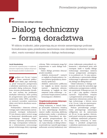Prowadzenie postępowania Zamówienia na usługi ochrony Dialog techniczny – formą doradztwa W obliczu trudności, jakie pojawiają się po stronie zamawiającego podczas formułowania opisu przedmiotu zamówienia oraz określania kryteriów oceny ofert, warto rozważyć skorzystanie z dialogu technicznego. Jacek Szmalenberg szef komórki organizacyjnej w wojskowej jednostce logistycznej, będącej dysponentem III stopnia środków budżetowych Z godnie z art. 31a ust. 1 ustawy – Prawo zamówień publicz nych (dalej: pzp) zamawiają cy, przed wszczęciem postępowania o udzielenie zamówienia, może prze prowadzić dialog techniczny. Dzięki temu otrzyma profesjonalne doradz two oraz zostaną mu przekazane niezbędne informacje, które posłużą do przygotowania opisu przedmiotu zamówienia (dalej: OPZ), specyfika cji istotnych warunków zamówienia (dalej: siwz) lub do określenia warun ków umowy. Profesjonalna i skuteczna ochrona wymaga często wykorzystania zaawan sowanych rozwiązań technicznych. W tym obszarze należy zwrócić uwagę na konieczność ukształtowania przez zamawiającego koncepcji bezpie czeństwa wspieranej przeznaczonymi dla niego rozwiązaniami techniczny mi z wykorzystaniem nowoczesnego sprzętu technicznego, który wspomaga www.przetargipubliczne.pl ochronę. Takie rozwiązania mogą być proponowane w czasie dialogu tech nicznego. Zakres dialogu powinien dotyczyć przede wszystkim: –obiektów „krytycznych” – ważnych ze względu na bezpieczeństwo i in teres państwa (gospodarczy, ekono miczny, społeczny); – obiektów użyteczności publicznej (ze względu na mienie znacznej wartości – zagrożenie zaborem, dewastacją, ze względu na duże natężenie ruchu osobowego – za pewnienie bezpieczeństwa osobom korzystającym z obiektów). Uregulowania prawne dotyczące dialogu technicznego Dialog techniczny, w ramach które go potencjalni wykonawcy świadczą na rzecz zamawiającego doradztwo, stanowi rzadko stosowaną platformę przekazywania wiedzy o przedmiocie zamówienia. Ustawodawca nie okre ślił sposobu przeprowadzania dia logu technicznego. Jedynie art. 31a ust. 2 pzp wskazuje, że dialog technicz ny prowadzi się w sposób zapewniający zachowanie uczciwej konkurencji oraz równe traktowanie potencjalnych wy konawców i oferowanych przez nich rozwiązań. Jeżeli w wyniku dialogu technicznego zamawiający zamierza wszcząć postępowanie przetargowe, to na podstawie art. 31c pzp zamiesz cza informację o zastosowaniu dialogu technicznego w ogłoszeniu o zamówie niu, którego ten dialog dotyczył. Udział wykonawcy w dialogu tech nicznym nie może być powodem jego wykluczenia z postępowania o udziele nie zamówienia. Wskazuje na to art. 24 ust. 2 pkt 1 pzp, zgodnie z którym czynności bezpośrednio związane z przygotowaniem prowadzonego po stępowania wykonywane podczas dia logu technicznego, o którym mowa w art. 31a ust. 1 pzp, nie stanowią prze słanki do wykluczenia wykonawcy. Podczas prowadzonego postępo wania przetargowego zamawiający zobligowany jest do zastosowania art. 96 ust. 2a pzp, zgodnie z którym, jeżeli przed wszczęciem postępowania o udzielenie zamówienia przeprowa dzono dialog techniczny, to zama wiający w protokole postępowania o udzielenie zamówienia musi zawrzeć informacje m.in. o: Przetargi Publiczne | Luty 2015 33 Prowadzenie postępowania –przeprowadzeniu dialogu technicz nego; – podmiotach, które uczestniczyły w dialogu technicznym; – wpływie dialogu technicznego na OPZ, siwz lub warunki umowy. Sposób organizacji dialogu technicznego Zgodnie z art. 31b pzp zamawiają cy zamieszcza informację o zamiarze przeprowadzenia dialogu technicznego na swojej stronie internetowej. Informa cja ta powinna zawierać co najmniej: – określenie przedmiotu dialogu technicznego; –cel przeprowadzenia dialogu tech nicznego; –termin i miejsce przeprowadzenia dialogu technicznego; –warunki i zasady udziału w dialogu technicznym; –dodatkowe ustalenia. Nic nie stoi na przeszkodzie, aby zamawiający sprecyzował procedury prowadzenia dialogu technicznego w regulaminie wewnętrznym. W regu laminie można wskazać, że czynności w imieniu zamawiającego będzie wy konywała wyznaczona komisja. Wykonawcy zgłaszają swój akces do udziału w dialogu w odpowiedzi na ogłoszenie lub indywidualne za proszenie. W ramach prowadzenia dialogu technicznego zamawiający powinien zagwarantować poufność w zakresie informacji, które stanowią tajemnicę przedsiębiorstwa bądź są chronione prawem autorskim. Przykład Zamawiający może przyjąć następujący harmonogram prac komisji: 1. etap – weryfikacja wykonawców. Wyznaczone przez zamawiającego osoby oraz eksperci zewnętrzni (według potrzeb) spotykają się z poszczególnymi wykonawcami. Wykonawcy podczas tych spotkań przedstawiają: 34 Przetargi Publiczne | Luty 2015 plany, próbki, pokazy, prezentacje, certyfikaty, atesty, rozwiązania innowacyjne i techniczne. Każde spotkanie zapewnia poufność wymiany informacji. W przypadku konieczności uszczegółowienia pozyskanych informacji lub przedstawionych rozwiązań zamawiający zaprasza danego wykonawcę na kolejną turę spotkań. 2. etap – analiza przedstawionych rozwiązań. Na tym etapie zamawiający kształtuje OPZ. Wymiana informacji z potencjalnymi wykonawcami następuje w formie pisemnej, a spotkania są organizowane w razie potrzeby. 3. etap – sporządzenie protokołu po zakończeniu dialogu technicznego oraz ogłoszenie o zakończeniu dialogu technicznego. Uwagi: – po każdym spotkaniu zamawiający sporządza notatkę; – zaprezentowane i dostarczone przez wykonawców materiały stanowią załącznik do notatek; – protokół po przeprowadzonym dialogu technicznym zawiera informacje wymagane zgodnie z art. 96 ust. 2a pzp (oraz stanowi załącznik do protokołu postępowania o udzielenie zamówienia); – pozostałe informacje przekazane w ramach doradztwa przez wykonawców