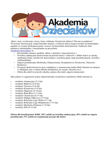 „Bawi, uczy, wychowuje, cieszy, kręci, relaksuje. Kreatywna zabawa? Dla nas to podstawa” Tworzymy innowacyjne, niepowtarzalne miejsce, w którym dzieci mogą rozwijać się harmonijnie, zgodnie ze swoimi predyspozycjami, cieszyć się beztroskim dzieciństwem i budować silne podstawy intelektualne i emocjonalne na przyszłość. Akademia Dzieciaków to: • Kawiarenka (miejsce spotkań, zabaw z dziećmi i smacznej kawy ) • Świetlica edukacyjna dostosowana do potrzeb dzieci i rodziców ( odbiór dzieci ze szkoły, odrabianie lekcji, możliwość skorzystania z szerokiej gamy zajęć pozalekcyjnych, świetlica multimedialna) • Zajęcia pozalekcyjne (Robotyka, Eksperymenty, Komputerowe, Kreatywne, TanecznoRuchowe) • Przyjęcia okolicznościowe przy współpracy z renomowaną marką Mały Inżynier na miejscu w Akademii oraz w domu klienta (animatorzy na wesela, chrzciny etc.). • Oferta dla szkół (wycieczki szkolne, pokazy dla szkół, zajęcia tematyczne) Jako jedyni w Legionowie mamy niepowtarzalne scenariusze urodzinowe Mały Inżynier tj.: • • • • • • • • • • • • urodziny Animacyjne (3-5 lat) urodziny Bajkowe (4-6 lat) urodziny Tęczowe (5-8 lat) urodziny Kosmiczne (5-9 lat) urodziny Magiczne (5-10 lat) urodziny Biżu-Biżu (5-13 lat) urodziny Chemiczne (6-15 lat) urodziny Małego Odkrywcy (7-9 lat) urodziny Robotyka Lego WeDo (5-7 lat) urodziny Robotyka Lego Mindstorms (7-15 lat) urodziny Sherlocka Holmesa (7-10 lat) urodziny SPA (9-15 lat) Oferta dla beneficjentów KDR: 10% zniżki na świetlicę edukacyjną, 10% zniżki na zajęcia pozalekcyjne, 5% zniżki na organizację przyjęć dla dzieci.