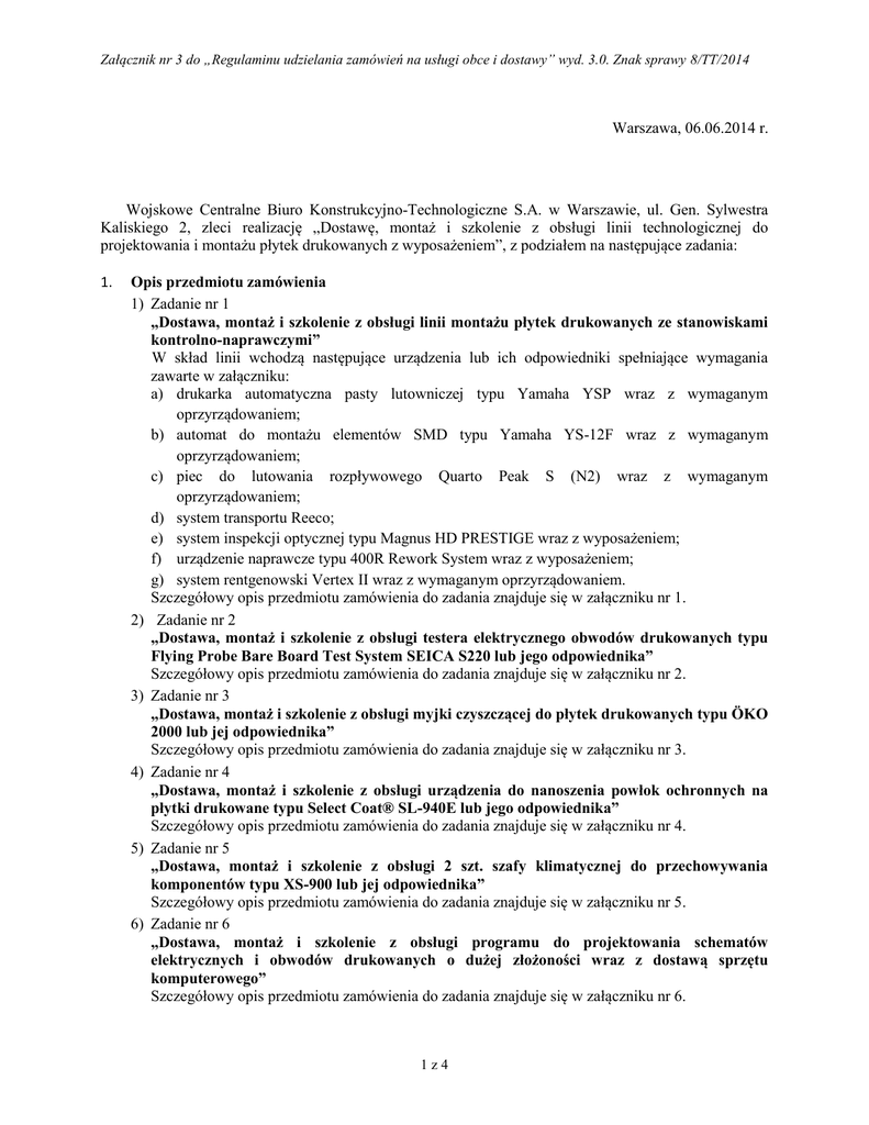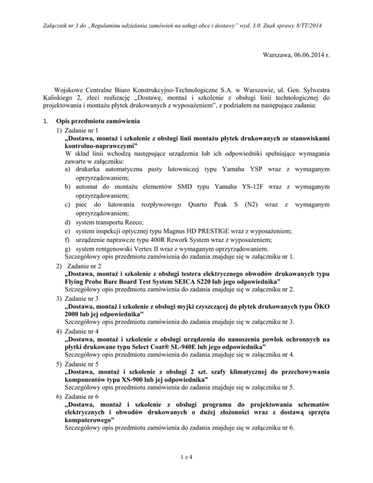 Załącznik nr 3 do „Regulaminu udzielania zamówień na usługi obce i dostawy” wyd. 3.0. Znak sprawy 8/TT/2014 Warszawa, 06.06.2014 r. Wojskowe Centralne Biuro Konstrukcyjno-Technologiczne S.A. w Warszawie, ul. Gen. Sylwestra Kaliskiego 2, zleci realizację „Dostawę, montaż i szkolenie z obsługi linii technologicznej do projektowania i montażu płytek drukowanych z wyposażeniem”, z podziałem na następujące zadania: 1. Opis przedmiotu zamówienia 1) Zadanie nr 1 „Dostawa, montaż i szkolenie z obsługi linii montażu płytek drukowanych ze stanowiskami kontrolno-naprawczymi” W skład linii wchodzą następujące urządzenia lub ich odpowiedniki spełniające wymagania zawarte w załączniku: a) drukarka automatyczna pasty lutowniczej typu Yamaha YSP wraz z wymaganym oprzyrządowaniem; b) automat do montażu elementów SMD typu Yamaha YS-12F wraz z wymaganym oprzyrządowaniem; c) piec do lutowania rozpływowego Quarto Peak S (N2) wraz z wymaganym oprzyrządowaniem; d) system transportu Reeco; e) system inspekcji optycznej typu Magnus HD PRESTIGE wraz z wyposażeniem; f) urządzenie naprawcze typu 400R Rework System wraz z wyposażeniem; g) system rentgenowski Vertex II wraz z wymaganym oprzyrządowaniem. Szczegółowy opis przedmiotu zamówienia do zadania znajduje się w załączniku nr 1. 2) Zadanie nr 2 „Dostawa, montaż i szkolenie z obsługi testera elektrycznego obwodów drukowanych typu Flying Probe Bare Board Test System SEICA S220 lub jego odpowiednika” Szczegółowy opis przedmiotu zamówienia do zadania znajduje się w załączniku nr 2. 3) Zadanie nr 3 „Dostawa, montaż i szkolenie z obsługi myjki czyszczącej do płytek drukowanych typu ÖKO 2000 lub jej odpowiednika” Szczegółowy opis przedmiotu zamówienia do zadania znajduje się w załączniku nr 3. 4) Zadanie nr 4 „Dostawa, montaż i szkolenie z obsługi urządzenia do nanoszenia powłok ochronnych na płytki drukowane typu Select Coat® SL-940E lub jego odpowiednika” Szczegółowy opis przedmiotu zamówienia do zadania znajduje się w załączniku nr 4. 5) Zadanie nr 5 „Dostawa, montaż i szkolenie z obsługi 2 szt. szafy klimatycznej do przechowywania komponentów typu XS-900 lub jej odpowiednika” Szczegółowy opis przedmiotu zamówienia do zadania znajduje się w załączniku nr 5. 6) Zadanie nr 6 „Dostawa, montaż i szkolenie z obsługi programu do projektowania schematów elektrycznych i obwodów drukowanych o dużej złożoności wraz z dostawą sprzętu komputerowego” Szczegółowy opis przedmiotu zamówienia do zadania znajduje się w załączniku nr 6. 1z4 Załącznik nr 3 do „Regulaminu udzielania zamówień na usługi obce i dostawy” wyd. 3.0. Znak sprawy 8/TT/2014 2. Dopuszcza się składanie ofert oddzielnie na każde z poszczególnych zadań. 3. Cena dostawy obejmować będzie: dostarczenie do siedziby WCBKT S.A. 1 szt. linii technologicznej do projektowania i montażu płytek drukowanych z wyposażeniem lub jednego z zadań, wymienionych w pkt 1, instalację, montaż, szkolenie z obsługi i uruchomienie, przeprowadzenie testów sprawdzających poprawność działania (odbiór). Urządzenia powinny być dostarczone w ukompletowaniu pozwalającym na uruchomienie i użytkowanie. 4. Oferty należy składać w terminie do 25.06.2014 r. do godz. 11:00 na „Formularzu ofertowym” dostępnym na stronie internetowej www.wcbkt.pl na adres: Wojskowe Centralne Biuro Konstrukcyjno-Technologiczne S.A. 00-908 Warszawa ul. Gen. Sylwestra Kaliskiego 2 Na wejście na teren Spółki wymagane jest uzyskanie zgody pracownika kancelarii: tel. 22 683 72 14. 5. Dostawca zamieszcza ofertę w zewnętrznej i wewnętrznej kopercie z tym, że: a) zewnętrzna koperta powinna być oznaczona w następujący sposób: „Dostawa, montaż i szkolenie z obsługi linii technologicznej do projektowania i montażu płytek drukowanych z wyposażeniem” lub w przypadku wybrania jednego z zadań – numer i treść zadania „Do rąk własnych Szefa Komisji – nie otwierać przed dniem otwarcia ofert tj. 26.06.2014 r. godz. 11.00”, bez nazwy i pieczątki Dostawcy b) koperta wewnętrzna powinna zawierać ofertę i być zaadresowana na Dostawcę, tak aby można było odesłać ofertę w przypadku jej złożenia po terminie. 6. Oferta musi być sporządzona według wzoru „Formularza ofertowego”, stanowiącego załącznik nr 7 do niniejszego ogłoszenia. 7. Dostawca zapewni sprawdzenie możliwości technicznych urządzenia podczas pokazu zorganizowanego na terenie Polski, w uzgodnionym z Zamawiającym terminie dwóch tygodni od czasu otwarcia ofert. 8. Dostawca musi przedstawić treść oferty odpowiadającą treści niniejszego ogłoszenia oraz „Formularza ofertowego” pod warunkiem wykluczenia z dalszego udziału w prowadzonym postępowaniu. 9. Dostawca ma prawo złożyć tylko jedną ofertę na całe zamówienie lub na jedno zadanie. 10. Oferta ma być napisana w języku polskim, na komputerze lub inną trwałą i czytelną techniką oraz podpisana przez osobę upoważnioną do reprezentowania firmy na zewnątrz i zaciągania zobowiązań w wysokości odpowiadającej cenie oferty. 11. Upoważnienie do podpisania oferty powinno być dołączone do oferty, o ile upoważnienie nie wynika z innych dokumentów dołączonych do oferty. Upoważnienie (pełnomocnictwo) powinno być przedstawione w formie oryginału lub poświadczonej notarialnie kopii. 12. Dokumenty załączone do oferty powinny być przedstawione w formie oryginału lub kserokopii potwierdzonej za zgodność z oryginałem przez Dostawcę (podpisuje osoba upoważniona do podpisywania oferty). 13. Każda zapisana strona oferty oraz załączonych oświadczeń i dokumentów powinna być ponumerowana kolejnymi numerami, a wszystkie kartki oferty należy spiąć w sposób trwały. 14. Wszelkie poprawki lub zmiany w tekście oferty muszą być parafowane własnoręcznie przez osobę podpisującą ofertę. 2z4 Załącznik nr 3 do „Reg