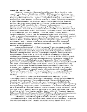 DARIUSZ PRZYBYLSKI Organista i kompozytor. Absolwent Szkoły Muzycznej II st. w Koninie w klasie organów Hanny Buczkowskiej (dyplom w 2003), w 2008 ukończył z wyróżnieniem oraz medalem Magna cum Laude Uniwersytet Muzyczny Fryderyka Chopina w Warszawie (klasa kompozycji Marcina Błażewicza i organów Andrzeja Chorosińskiego). Studiował także kompozycję u Yorka Höllera w Hochschule für Musik w Kolonii, kompozycję elektroniczną u Hansa Ulricha Humperta, instrumentację u Krzysztofa Meyera i organy u Johannesa Gefferta, jako stypendysta programu Socrates/Erasmus. Uzyskał stopień doktora sztuki muzycznej na UMFC oraz ukończył z wyróżnieniem studia podyplomowe (Solistenklasse/Konzertexam) w klasie kompozycji Wolfganga Rihma w Hochschule für Musik Karlsruhe. W ramach stypendium Internationale Ensemble Modern Akademie, odbył również studia na kierunku muzyka współczesna w Hochschule für Musik und Darstellende Kunst Frankfurt am Main, współpracując z członkami zespołu Ensemble Modern. Stypendium Fundacji Deutsche Bank dla kompozytorów operowych pozwoliło mu rozwijać wiedzę na temat współczesnego teatru muzycznego w kilkudziesięciu instytucjach operowych Europy. Od 2008 wykłada w macierzystej uczelni. Nauczał gościnnie w Nowym Jorku, Moskwie, Rzymie, Stambule, Hamburgu; prowadził klasę kompozycji w Keimyung University w Daegu (Korea Płd.). Brał udział w kursach mistrzowskich kompozycji, interpretacji muzyki organowej i improwizacji organowej. Laureat wielu konkursów organowych i kompozytorskich. Jako organista koncertuje w Polsce i za granicą. W jego repertuarze szczególne miejsce zajmuje muzyka nowa, na swoim koncie posiada kilkadziesiąt prawykonań utworów polskich, białoruskich, niemieckich, angielskich, ukraińskich, argentyńskich, chińskich i koreańskich kompozytorów. Realizuje własne projekty organowe, do których zaprasza kompozytorów z całego świata. W 2010 roku ukazała się jego monograficzna płyta, zawierająca utwory orkiestrowe i koncerty Works for Orchestra (DUX); w 2011 odbyła się premiera Organ Odyssey – poematu organowego skomponowanego przez ośmiu twórców z sześciu krajów europejskich, inspirowanego fragmentami z Odysei Homera; 2014 to prawykonanie, zamówionych przez Filharmonię Wrocławską, utworów na organy Hammonda oraz zespół Kwartludium i podwójny album płytowy Passio (DUX) zawierający utwory wokalne Przybylskiego w wykonaniu berlińskiego zespołu Phoenix16 pod dyrekcją Timo Kreusera. Płyta z nagraniem utworu Bogurodzica na organy solo (2003), w wykonaniu Andrzeja Chorosińskiego na organach bazyliki w Licheniu, otrzymała status Podwójnej Platynowej Płyty, zaś płyty 20 lat Conversatorium Organowego w Legnicy (DUX) oraz Młodzi Kompozytorzy w Hołdzie Chopinowi (DUX) zostały nominowane do nagrody Fryderyk. Komponował na zamówienie Deutsche Oper Berlin, Narodowej Orkiestry Symfonicznej Polskiego Radia w Katowicach, Warszawskiej Opery Kameralnej, Orkiestry Akademii Beethovenowskiej, Filharmonii Poznańskiej, Filharmonii Kaliskiej, zespołu Kwartludium, Vokalensemble Phoenix16, Związku Kompozytorów Polskich, Zamku Królewskiego w Warszawie oraz wielu innych festiwali i instytucji muzycznych. Jego utwory wykonywane były w większości polskich filharmonii oraz na wielu festiwalach muzycznych, m. in.: Gaudeamus Muziekweek w Holandii, Voix nouvelles we Francji, Światowych Dniach Muzyki w Szwecji i Słowenii, a także w wielu znaczących salach koncertowych, takich jak Royal Festival Hall, Opera Frankfurt am Main, Katedra w Kolonii, Filharmonia Narodowa, Filharmonia Moskiewska, Filharmonia Mińska. W 2014 roku odbyła się premiera dwóch oper kameralnych Dariusza Przybylskiego zamówionych przez Deutsche Oper Berlin. Pełnił funkcję przewodniczącego Koła Młodych Związku Kompozytorów Polskich. Jest członkiem Związku Kompozytorów Polskich (członek Zarządu), Polskiego Towarzystwa Muzyki Współczesnej (członek Zarządu) oraz ZAiKS (członek zarządu Sekcji muzyki poważnej). W roku 2012 został wybrany na stanowisko prodziekana Wydziału Kompozycji, Dyrygentury i Teorii Muzyki UMFC w Warszawie (kadencja 2012–2016). Jego działalność dydaktyczna to nie tylko prowadzenie zajęć, aktywnie uczestniczy w życiu uczelni, organizując konferencje i warsztaty kompozytorskie – często o zasięgu międzynarodowym.