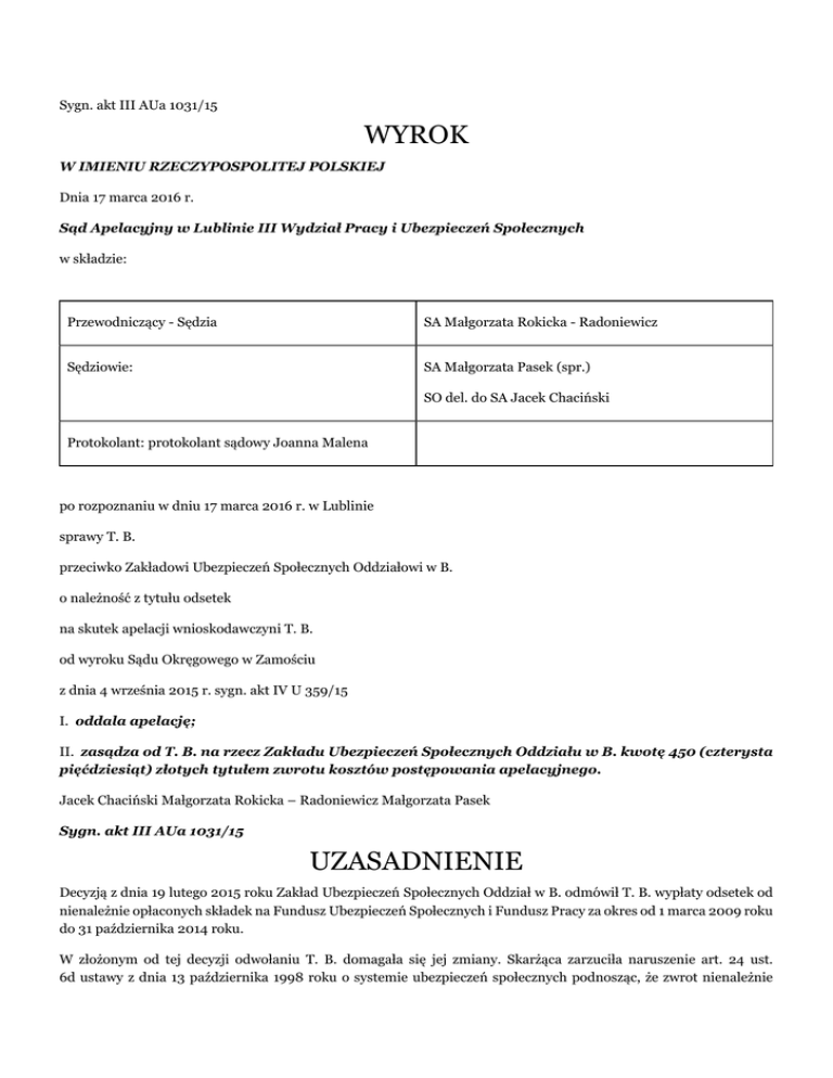 Sygn. akt III AUa 1031/15 WYROK W IMIENIU RZECZYPOSPOLITEJ POLSKIEJ Dnia 17 marca 2016 r. Sąd Apelacyjny w Lublinie III Wydział Pracy i Ubezpieczeń Społecznych w składzie: Przewodniczący - Sędzia SA Małgorzata Rokicka - Radoniewicz Sędziowie: SA Małgorzata Pasek (spr.) SO del. do SA Jacek Chaciński Protokolant: protokolant sądowy Joanna Malena po rozpoznaniu w dniu 17 marca 2016 r. w Lublinie sprawy T. B. przeciwko Zakładowi Ubezpieczeń Społecznych Oddziałowi w B. o należność z tytułu odsetek na skutek apelacji wnioskodawczyni T. B. od wyroku Sądu Okręgowego w Zamościu z dnia 4 września 2015 r. sygn. akt IV U 359/15 I. oddala apelację; II. zasądza od T. B. na rzecz Zakładu Ubezpieczeń Społecznych Oddziału w B. kwotę 450 (czterysta pięćdziesiąt) złotych tytułem zwrotu kosztów postępowania apelacyjnego. Jacek Chaciński Małgorzata Rokicka – Radoniewicz Małgorzata Pasek Sygn. akt III AUa 1031/15 UZASADNIENIE Decyzją z dnia 19 lutego 2015 roku Zakład Ubezpieczeń Społecznych Oddział w B. odmówił T. B. wypłaty odsetek od nienależnie opłaconych składek na Fundusz Ubezpieczeń Społecznych i Fundusz Pracy za okres od 1 marca 2009 roku do 31 października 2014 roku. W złożonym od tej decyzji odwołaniu T. B. domagała się jej zmiany. Skarżąca zarzuciła naruszenie art. 24 ust. 6d ustawy z dnia 13 października 1998 roku o systemie ubezpieczeń społecznych podnosząc, że zwrot nienależnie opłaconych składek w terminie 30 dni od daty złożenia wniosku nie zawsze skutkuje zwolnieniem organu rentowego z obowiązku wypłaty odsetek, co znajduje potwierdzenie w doktrynie i judykaturze. Organ rentowy w odpowiedzi na odwołanie wniósł o jego oddalenie. Wyrokiem z dnia 4 września 2015 roku Sąd Okręgowy w Zamościu oddalił odwołanie, nie zasądził między stronami kosztów procesu. Sąd pierwszej instancji swoje rozstrzygnięcie oparł na poniższych ustaleniach faktycznych oraz ich ocenie prawnej. T. B. od 2000 roku prowadzi działalność gospodarczą - firmę pogrzebową. Od rozpoczęcia tej działalności korzysta z pomocy księgowej z biura rachunkowego, która przygotowuje wymagane dokumenty dotyczące zgłoszeń i rozliczeń w zakresie składek i podatków. W 2009 roku wnioskodawczyni nabyła prawo do renty rodzinnej po zmarłym małżonku. Powyższy fakt nie został jednakże uwzględniony w składanych dokumentach dotyczących ubezpieczeń, co wynikało z braku świadomości, że nabycie prawa do renty rodzinnej może mieć wpływ na podleganie ubezpieczeniom społecznym z tytułu prowadzonej działalności gospodarczej. W 2014 roku organ rentowy, przy rozpoznawaniu wniosku o zasiłek chorobowy stwierdził, że odwołująca - z uwagi na prawo do renty rodzinnej, nie podlega ubezpieczeniom społecznym z tytułu prowadzenia działalności gospodarczej. T. B. terminowo opłacała składki na ubezpieczenia społeczne pozostając w przekonaniu, że są one należne. ZUS nie wzywał jej do zapłaty składek i nie prowadził postępowania egzekucyjnego w celu ich ściągnięcia. W dniu 9 stycznia 2015 r. skarżąca wniosła o zwrot nienależnie opłaconych składek na ubezpieczenia społeczne i na Fundusz Pracy za okres od dnia 1 marca 2009 roku do dnia 31 października 2014 roku wraz z odsetkami wskazując, że złożyła druk (...) o wyrejestrowaniu z ubezpieczeń i dokonała korekty dokumentów rozliczeniowych za wymieniony okres, co umożliwia ustalenie nadpłaty składek. Organ rentowy w dniu 23 stycznia 2015 r. dokonał zwrotu nienależnie opłaconych składek w kwocie 44.823,94 zł, nie znalazł jednakże podstaw do wypłaty odsetek. Ustaleń w sprawie Sąd Okręgowy dokonał na podstawie powołanych dowodów z dokumentów oraz zeznań wnioskodawczyni, które uznał za wiarygodne. Sąd pierwszej instancji zwrócił uwagę, że strony nie zgłaszały wniosków dowodowych, a w świetle orzeczenia Sądu Najwyższego z dnia 17 grudnia 1996 r. w sprawie I CKU 45/96, opubl. OSNC 1997/6-7/76 nie jest rzeczą sądu zarządzenie dochodzeń w celu uzupełnienia lub wyjaśnienia twierdzeń stron i wykrycia środków dowodowych pozwalających na ich udowodnienie ani też sąd nie jest zobowiązany do przeprowadzenia z urzędu dowodów zmierzających do wyjaśnienia okoliczności istotnych dla rozstrzygnięcia sprawy (art. 232 k.p.c.). Obowiązek przedstawienia dowodów spoczywa na stronach (art. 3 k.p.c.), a ciężar udowodnienia faktów mających dla rozstrzygnięcia sprawy istotne znaczenie (art. 227 k.p.c.) spoczywa na stronie, która z faktów tych wywodzi skutki prawne (art. 6 k.c.). Sąd Okręgowy wyjaśnił, że w sprawie niniejszej mają zastosowanie przepisy art. 24 ust. 6a, 6b, 6c, 6d ustawy z dnia 13 października 1998 r. o systemie ubezpieczeń społecznych (Dz. U. z 2015 r., poz. 121 ze zm.) według których: nienależnie opłacone składki podlegają zaliczeniu przez Zakład z urzędu na poczet zaległych lub bieżących składek, a w razie ich braku - na poczet przyszłych składek, chyba że płatnik składek złoży wniosek o zwrot składek (ust. 6a); Zakład zawiadamia płatnika składek o kwocie nienależnie opłaconych składek, które zgodnie z ust. 6a mogą być zwrócone, chyba że nie przekraczają wysokości kosztów upomnienia w postępowaniu egzekucyjnym (ust. 6b); po stwierdzeniu, że składki zostały nienależnie opłacone, płatnik składek może złożyć wniosek o ich zwrot (ust. 6c); nienależnie opłacone składki podlegają zwrotowi w terminie 30 dni od dnia wpływu wniosku, o którym mowa w ust. 6c (ust. 6d). Z treści art. 24 ust. 6c i ust. 6d wynika, że dopiero po stwierdzeniu przez organ rentowy, że składki zostały nienależnie opłacone, płatnik składek może złożyć wniosek o ich zwrot i wtedy składki podlegają zwrotowi w terminie 30 dni do dnia wpływu wniosku. Sąd Okręgowy wskazał, że organ rentowy w grudniu 2014 r. (decyzja z dnia 19 grudnia 2014 r. o umorzeniu postępowania w prz