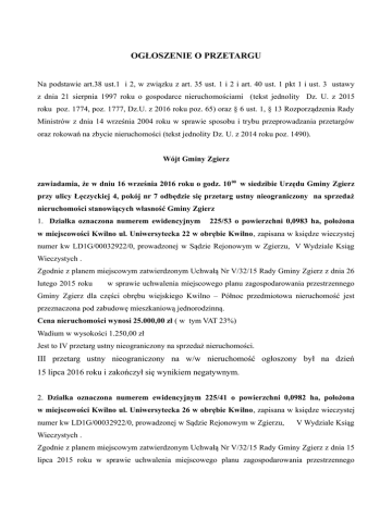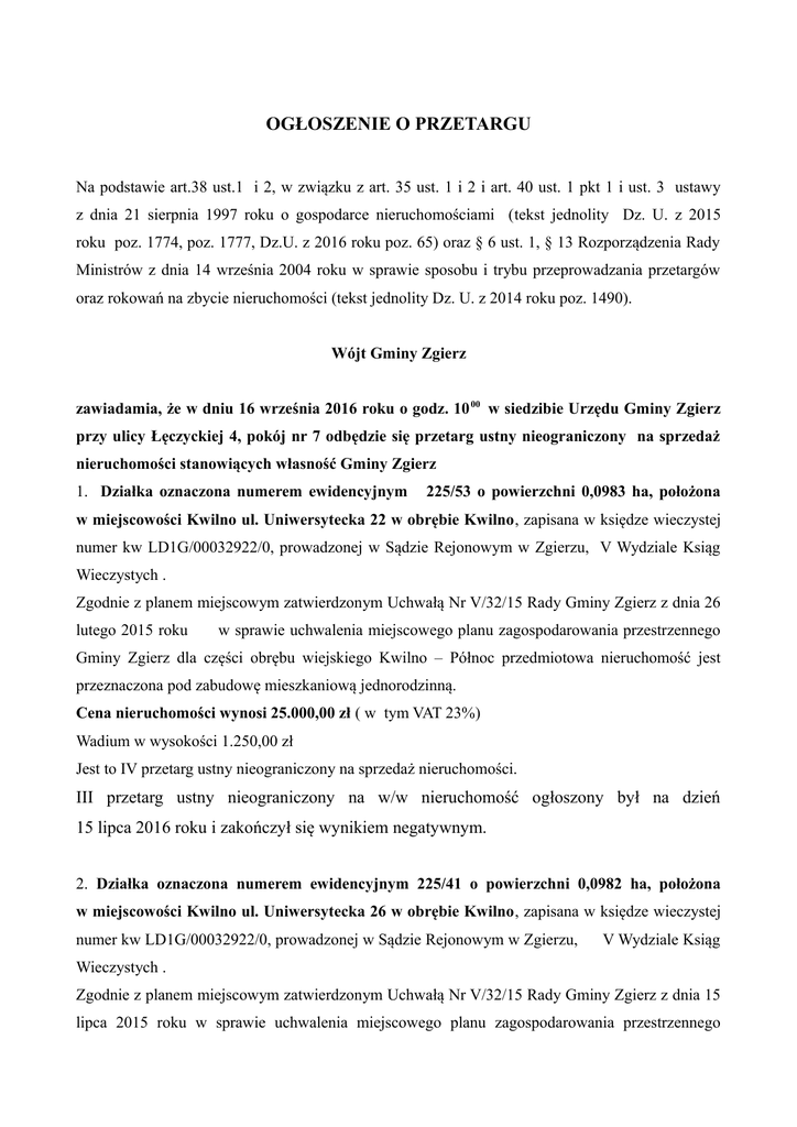OGŁOSZENIE O PRZETARGU Na podstawie art.38 ust.1 i 2, w związku z art. 35 ust. 1 i 2 i art. 40 ust. 1 pkt 1 i ust. 3 ustawy z dnia 21 sierpnia 1997 roku o gospodarce nieruchomościami (tekst jednolity Dz. U. z 2015 roku poz. 1774, poz. 1777, Dz.U. z 2016 roku poz. 65) oraz § 6 ust. 1, § 13 Rozporządzenia Rady Ministrów z dnia 14 września 2004 roku w sprawie sposobu i trybu przeprowadzania przetargów oraz rokowań na zbycie nieruchomości (tekst jednolity Dz. U. z 2014 roku poz. 1490). Wójt Gminy Zgierz zawiadamia, że w dniu 16 września 2016 roku o godz. 10 00 w siedzibie Urzędu Gminy Zgierz przy ulicy Łęczyckiej 4, pokój nr 7 odbędzie się przetarg ustny nieograniczony na sprzedaż nieruchomości stanowiących własność Gminy Zgierz 1. Działka oznaczona numerem ewidencyjnym 225/53 o powierzchni 0,0983 ha, położona w miejscowości Kwilno ul. Uniwersytecka 22 w obrębie Kwilno, zapisana w księdze wieczystej numer kw LD1G/00032922/0, prowadzonej w Sądzie Rejonowym w Zgierzu, V Wydziale Ksiąg Wieczystych . Zgodnie z planem miejscowym zatwierdzonym Uchwałą Nr V/32/15 Rady Gminy Zgierz z dnia 26 lutego 2015 roku w sprawie uchwalenia miejscowego planu zagospodarowania przestrzennego Gminy Zgierz dla części obrębu wiejskiego Kwilno – Północ przedmiotowa nieruchomość jest przeznaczona pod zabudowę mieszkaniową jednorodzinną. Cena nieruchomości wynosi 25.000,00 zł ( w tym VAT 23%) Wadium w wysokości 1.250,00 zł Jest to IV przetarg ustny nieograniczony na sprzedaż nieruchomości. III przetarg ustny nieograniczony na w/w nieruchomość ogłoszony był na dzień 15 lipca 2016 roku i zakończył się wynikiem negatywnym. 2. Działka oznaczona numerem ewidencyjnym 225/41 o powierzchni 0,0982 ha, położona w miejscowości Kwilno ul. Uniwersytecka 26 w obrębie Kwilno, zapisana w księdze wieczystej numer kw LD1G/00032922/0, prowadzonej w Sądzie Rejonowym w Zgierzu, V Wydziale Ksiąg Wieczystych . Zgodnie z planem miejscowym zatwierdzonym Uchwałą Nr V/32/15 Rady Gminy Zgierz z dnia 15 lipca 2015 roku w sprawie uchwalenia miejscowego planu zagospodarowania przestrzennego Gminy Zgierz dla części obrębu wiejskiego Kwilno – Północ przedmiotowa nieruchomość jest przeznaczona pod zabudowę mieszkaniową jednorodzinną. Cena nieruchomości wynosi 25.000,00 zł ( w tym VAT 23%) Wadium w wysokości 1.250,00 zł Jest to IV przetarg ustny nieograniczony na sprzedaż nieruchomości. III przetarg ustny nieograniczony na w/w nieruchomość ogłoszony był na dzień 15 lipca 2016 roku i zakończył się wynikiem negatywnym. 3. Działka oznaczona numerem ewidencyjnym 225/30 o powierzchni 0,1005 ha, położona w miejscowości Kwilno ul. Uniwersytecka 19 w obrębie Kwilno, zapisana w księdze wieczystej numer kw LD1G/00032922/0, prowadzonej w Sądzie Rejonowym w Zgierzu, V Wydziale Ksiąg Wieczystych . Zgodnie z planem miejscowym zatwierdzonym Uchwałą Nr V/32/15 Rady Gminy Zgierz z dnia 26 lutego 2015 roku w sprawie uchwalenia miejscowego planu zagospodarowania przestrzennego Gminy Zgierz dla części obrębu wiejskiego Kwilno – Północ przedmiotowa nieruchomość jest przeznaczona pod zabudowę mieszkaniową jednorodzinną. Cena nieruchomości wynosi 25.000,00 zł ( w tym VAT 23%) Wadium w wysokości 1.250,00 zł Jest to II przetarg ustny nieograniczony na sprzedaż nieruchomości. I przetarg ustny nieograniczony na w/w nieruchomość ogłoszony był na dzień 15 lipca 2016 roku i zakończył się wynikiem negatywnym. 4. Działka oznaczona numerem ewidencyjnym 214/100 o powierzchni 0,1017 ha, położona w miejscowości Kwilno ul. Uniwersytecka 12 w obrębie Kwilno, zapisana w księdze wieczystej numer kw LD1G/00032922/0, prowadzonej w Sądzie Rejonowym w Zgierzu, V Wydziale Ksiąg Wieczystych . Zgodnie z planem miejscowym zatwierdzonym Uchwałą Nr V/32/15 Rady Gminy Zgierz z dnia 26 lutego 2015 roku w sprawie uchwalenia miejscowego planu zagospodarowania przestrzennego Gminy Zgierz dla części obrębu wiejskiego Kwilno – Północ przedmiotowa nieruchomość jest przeznaczona pod zabudowę mieszkaniową jednorodzinną. Cena nieruchomości wynosi 25.000,00 zł ( w tym VAT 23%) Wadium w wysokości 1.250,00 zł Jest to II przetarg ustny nieograniczony na sprzedaż nieruchomości. I przetarg ustny nieograniczony na w/w nieruchomość ogłoszony był na dzień 15 lipca 2016 roku i zakończył się wynikiem negatywnym. 5. Działka oznaczona numerem ewidencyjnym 214/101 o powierzchni 0,0924 ha, położona w miejscowości Kwilno ul. Uniwersytecka 14 w obrębie Kwilno, zapisana w księdze wieczystej numer kw LD1G/00032922/0, prowadzonej w Sądzie Rejonowym w Zgierzu, V Wydziale Ksiąg Wieczystych . Zgodnie z planem miejscowym zatwierdzonym Uchwałą Nr V/32/15 Rady Gminy Zgierz z dnia 26 lutego 2015 roku w sprawie uchwalenia miejscowego planu zagospodarowania przestrzennego Gminy Zgierz dla części obrębu wiejskiego Kwilno – Północ przedmiotowa nieruchomość jest przeznaczona pod zabudowę mieszkaniową jednorodzinną. Cena nieruchomości wynosi 23.000,00 zł ( w tym VAT 23%) Wadium w wysokości 1.150,00 zł Jest to II przetarg ustny nieograniczony na sprzedaż nieruchomości. I przetarg ustny nieograniczony na w/w nieruchomość ogłoszony był na dzień 15 lipca 2016 roku i zakończył się wynikiem negatywnym. Warunki przetargu: Warunkiem przystąpienia do przetargu jest wpłacenie wadium gotówką w punkcie kasowym Banku Spółdzielczego w Urzędzie Gminy Zgierz do dnia 12 września 2016 roku do godz. 1430 . Wadium ulega przepadkowi w razie uchylenia się uczestnika który przetarg wygrał od zawarcia umowy. Koszty aktu notarialnego pokrywa nabywca. W uzasadnionych przypadkach Wójtowi Gminy Zgierz przysługuje prawo odwołania przetargu. Bliższych informacji udziela się w pokoju numer 7 lub pod numerem telefonu (42)7162515 wew. 107 lub 127 Zgierz, dnia 27.07 2016 roku