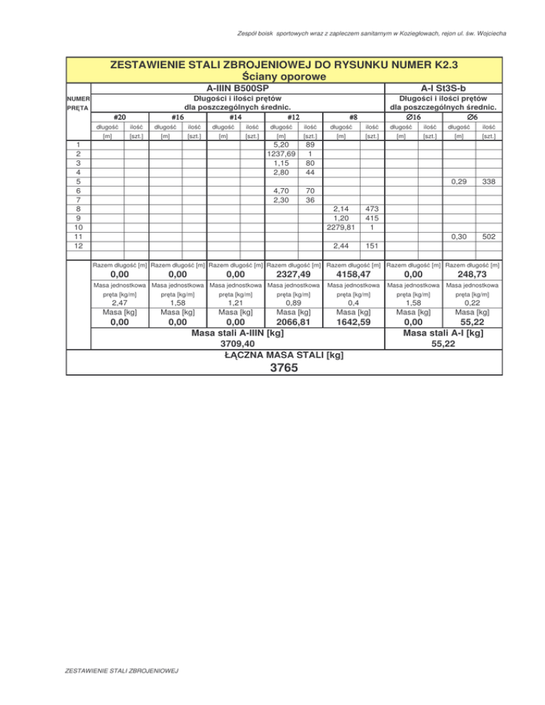 Zespół boisk sportowych wraz z zapleczem sanitarnym w Koziegłowach, rejon ul. w. Wojciecha ZESTAWIENIE STALI ZBROJENIOWEJ DO RYSUNKU NUMER K2.3 ciany oporowe NUMER PR TA #20 długo [m] ilo A-IIIN B500SP A-I St3S-b Długo ci i ilo ci pr tów dla poszczególnych rednic. #16 #14 #12 Długo ci i ilo ci pr tów dla poszczególnych rednic. ∅16 ∅6 długo [szt.] [m] ilo długo [szt.] [m] ilo [szt.] 1 2 3 4 5 6 7 8 9 10 11 12 Razem długo [m] Razem długo [m] Razem długo 0,00 0,00 0,00 #8 długo ilo długo [m] [szt.] 5,20 1237,69 1,15 2,80 89 1 80 44 4,70 2,30 70 36 [m] Razem długo [m] ilo [szt.] 2,14 1,20 2279,81 473 415 1 2,44 151 [m] Razem długo 2327,49 Masa jednostkowa Masa jednostkowa Masa jednostkowa Masa jednostkowa długo [m] ilo długo [szt.] [m] Razem długo ilo [m] [szt.] 0,29 338 0,30 502 [m] Razem długo 4158,47 0,00 248,73 [m] Masa jednostkowa Masa jednostkowa Masa jednostkowa pr ta [kg/m] pr ta [kg/m] pr ta [kg/m] pr ta [kg/m] pr ta [kg/m] pr ta [kg/m] pr ta [kg/m] 2,47 Masa [kg] 1,58 Masa [kg] 1,21 Masa [kg] 0,89 Masa [kg] 0,4 Masa [kg] 1,58 Masa [kg] 0,22 Masa [kg] 0,00 0,00 0,00 2066,81 1642,59 Masa stali A-IIIN [kg] 3709,40 Ł CZNA MASA STALI [kg] 3765 ZESTAWIENIE STALI ZBROJENIOWEJ 0,00 55,22 Masa stali A-I [kg] 55,22