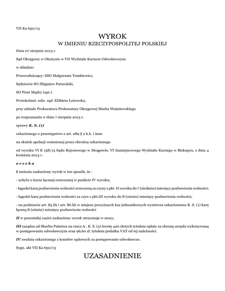 VII Ka 650/13 WYROK W IMIENIU RZECZYPOSPOLITEJ POLSKIEJ Dnia 07 sierpnia 2013 r. Sąd Okręgowy w Olsztynie w VII Wydziale Karnym Odwoławczym w składzie: Przewodniczący: SSO Małgorzata Tomkiewicz, Sędziowie SO Zbigniew Paturalski, SO Piotr Mądry (spr.) Protokolant: sekr. sąd. Elżbieta Łotowska, przy udziale Prokuratora Prokuratury Okręgowej Marka Waśniewskiego po rozpoznaniu w dniu 7 sierpnia 2013 r. sprawy K. S. (1) oskarżonego o przestępstwo z art. 289 § 2 k.k. i inne na skutek apelacji wniesionej przez obrońcę oskarżonego od wyroku VI K 158/13 Sądu Rejonowego w Mrągowie, VI Zamiejscowego Wydziału Karnego w Biskupcu, z dnia 4 kwietnia 2013 r. orzeka I zmienia zaskarżony wyrok w ten sposób, że : - uchyla o karze łącznej orzeczonej w punkcie IV wyroku; - łagodzi karę pozbawienia wolności orzeczoną za czyny z pkt. II wyroku do 7 (siedmiu) miesięcy pozbawienia wolności; - łagodzi karę pozbawienia wolności za czyn z pkt.III wyroku do 8 (ośmiu) miesięcy pozbawienia wolności; - na podstawie art. 85 kk i art. 86 kk w miejsce powyższych kar jednostkowych wymierza oskarżonemu K. S. (1) karę łączną 8 (ośmiu) miesięcy pozbawienia wolności II w pozostałej części zaskarżony wyrok utrzymuje w mocy, III zasądza od Skarbu Państwa na rzecz A.. K. S. (2) kwotę 420 złotych tytułem opłaty za obronę urzędu wykonywaną w postępowaniu odwoławczym oraz 96,60 zł. tytułem podatku VAT od tej należności. IV zwalnia oskarżonego z kosztów sądowych za postępowanie odwoławcze. Sygn. akt VII Ka 650/13 UZASADNIENIE K. S. (1) został oskarżony o to, że: I. w dniu 4 lipca 2012 roku w miejscowości D., Gm. (...)zabrał w celu krótkotrwałego użycia ciągnik rolniczy marki B., nr rej. (...)w celu jego krótkotrwałego użycia, po czym porzucił go w miejscowości B., g,. (...)w stanie uszkodzonym, przy czym łączna wartość uszkodzeń wynosiła 800 zł na szkodę M. C., tj. o przestępstwo z art. 289 § 2 kk, II. w okresie od miesiąca lutego 2012 roku do 4 lipca 2012 roku w miejscowości D., Gm. (...)działając w krótkich odstępach czasu i w wykonaniu z góry powziętego zamiaru co najmniej trzykrotnie kierował ciągnikiem rolniczym marki B.nr rej. (...)pomimo prawomocnie orzeczonego wyrokiem Sądu Rejonowego w Biskupcu, sygn. akt II K 225/07 zakazu prowadzenia wszelkich pojazdów mechanicznych, tj. o przestępstwo z art. 244 kk w zw. z art. 12 kk, III. w dniu 4 lipca 2012 roku w miejscowości D., Gm. (...)kierował ciągnikiem rolniczym marki B., nr rej. (...)znajdując się w stanie nietrzeźwości posiadając co najmniej 0,7 ‰alkoholu we krwi, przy czym czynu tego dopuścił się będąc uprzednio prawomocnie skazanym za prowadzenie pojazdów mechanicznych w stanie nietrzeźwości i pomimo prawomocnie orzeczonego wyrokiem Sądu Rejonowego w Biskupcu, sygn. akt II K 225/07 zakazu prowadzenia wszelkich pojazdów mechanicznych, a nadto dopuścił się w ciągu 5 lat po odbyciu co najmniej 6 miesięcy kary pozbawienia wolności, będąc skazanym za umyślne o przestępstwo podobne, tj. o przestępstwo z art. 178 a § 4 kk w zw. z art. 64 § 1 kk. Sąd Rejonowy w Mrągowie VI Zamiejscowy Wydział Karny z/s w Biskupcu wyrokiem z dnia 4 kwietnia 2013 roku , sygn. akt VI K 158/13: I. ustalając, iż oskarżony dopuścił się popełnienia czynu zarzucanego mu w pkt II i wyczerpującego dyspozycję art. 244 kk w zw. z art. 12 kk na podstawie art. 17 § 1 pkt 3 kpk postępowanie karne przeciwko niemu umorzył, kosztami postępowania w tym zakresie obciążając Skarb Państwa, II. oskarżonego uznał za winnego popełnienia zarzuconego mu w pkt I czynu i za to z mocy art. 289 § 2 kk skazał go i wymierzył mu karę 8 miesięcy pozbawienia wolności, III. oskarżonego uznał za winnego popełnienia czynu zarzuconego mu w pkt III, z tym ustaleniem, iż oskarżony kierował pojazdem mechanicznym w ruchu lądowym na trasie D. B.tj. popełnienia czynu z art. 178 a § 4 kk w zw. z art. 64 § 1 kk i za to z mocy art. 178 § 3 kk w zw. z art. 64 § 11 kk skazał go i wymierza mu karę 1 roku pozbawienia wolności, IV. na podstawie art. 85 kk i art. 86 § 1 kk wymierzone oskarżonemu kary pozbawienia wolności połączył i wymierzył karę łączną 1 roku i 3 miesięcy pozbawienia wolności, V. na podstawie art. 42 § 2 kk orzekł wobec oskarżonego środek karny w postaci zakazu prowadzenia wszelkich pojazdów mechanicznych na okres 3 lat, VI. zasądził od Skarbu Państwa na rzecz adw. K. S. (2) kwotę 540 zł tytułem wynagrodzenia obronę z urzędu, w tym kwotę 180 z ł tytułem wynagrodzenia za obronę w postępowaniu przygotowawczym oraz kwotę 124,20 zł tytułem podatku VAT od wynagrodzenia za obronę z urzędu, w tym kwotę 41,40 zł tytułem podatku VAT od wynagrodzenia za obronę w postępowaniu przygotowawczym, VII. na podstawie art., 624 § 1 kpk zwolnił oskarżonego od kosztów sądowych. Apelację od powyższego wyroku złożył obrońca oskarżonego, zaskarżając wyrok w całości na korzyść oskarżonego. Zapadłemu orzeczeniu zarzucił rażącą niewspółmierność kary poprzez wymierzenie oskarżonemu za czyn z art. 289§ 2 kk kary 8 miesięcy pozbawienia wolności za s za czyn z art. 178 a § 4 kk w zw. z art. 64 § 1 kk kary 1 roku pozbawienia wolności i co za tym idzie kary łącznej w wymiarze 1 roku i 3 miesięcy pozbawienia wolności poprzez: - pominięcie, tego, że kary wymierzone są nieadekwatne do stopnia winy i stopnia społecznej szkodliwości czynu przypisanego oskarżonemu w szczególności, jeżeli weźmie się pod uwagę okoliczności łagodzące tj. przyznanie się oskarżonemu w całości do popełniania zarzuconych mu czynów, jego wyraźną skruchę i przeproszenie osób pokrzywdzonych oraz naprawienie wyrządzonej im szkody w całości, - orzeczenie powyższej kary pozbawienia wolności bez warunkowego zawieszenia jej wykonania, pomimo istnienia przesłanek z art. 69 § 1 kk albowiem w realiach sprawy biorąc 