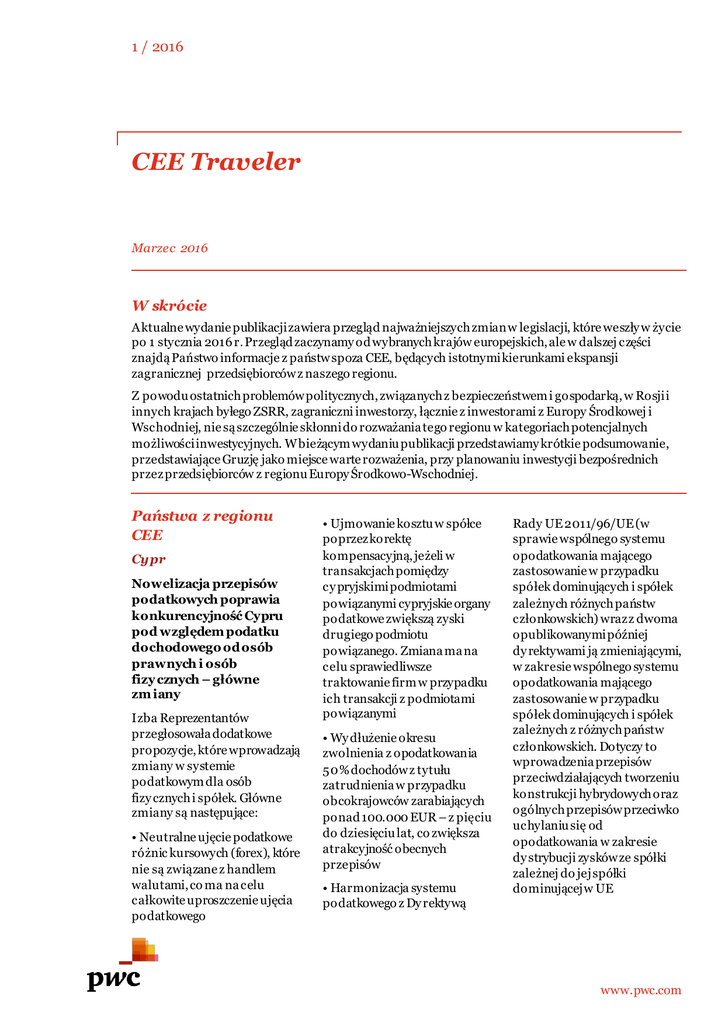 1 / 2016 CEE Traveler Marzec 2016 W skrócie Aktualne wydanie publikacji zawiera przegląd najważniejszych zmian w legislacji, które weszły w życie po 1 stycznia 2016 r. Przegląd zaczynamy od wybranych krajów europejskich, ale w dalszej części znajdą Państwo informacje z państw spoza CEE, będących istotnymi kierunkami ekspansji zagranicznej przedsiębiorców z naszego regionu. Z powodu ostatnich problemów politycznych, związanych z bezpieczeństwem i gospodarką, w Rosji i innych krajach byłego ZSRR, zagraniczni inwestorzy, łącznie z inwestorami z Europy Środkowej i Wschodniej, nie są szczególnie skłonni do rozważania tego regionu w kategoriach potencjalnych możliwości inwestycyjnych. W bieżącym wydaniu publikacji przedstawiamy krótkie podsumowanie, przedstawiające Gruzję jako miejsce warte rozważenia, przy planowaniu inwestycji bezpośrednich przez przedsiębiorców z regionu Europy Środkowo-Wschodniej. Państwa z regionu CEE Cypr Nowelizacja przepisów podatkowych poprawia konkurencyjność Cypru pod względem podatku dochodowego od osób prawnych i osób fizy cznych – główne zm iany Izba Reprezentantów przegłosowała dodatkowe propozycje, które wprowadzają zmiany w systemie podatkowym dla osób fizy cznych i spółek. Główne zmiany są następujące: • Neutralne ujęcie podatkowe różnic kursowych (forex), które nie są związane z handlem walutami, co ma na celu całkowite uproszczenie ujęcia podatkowego • Ujmowanie kosztu w spółce poprzez korektę kompensacyjną, jeżeli w transakcjach pomiędzy cy pryjskimi podmiotami powiązanymi cypryjskie organy podatkowe zwiększą zyski drugiego podmiotu powiązanego. Zmiana ma na celu sprawiedliwsze traktowanie firm w przypadku ich transakcji z podmiotami powiązanymi • Wy dłużenie okresu zwolnienia z opodatkowania 50% dochodów z tytułu zatrudnienia w przypadku obcokrajowców zarabiających ponad 100.000 EUR – z pięciu do dziesięciu lat, co zwiększa atrakcyjność obecnych przepisów • Harmonizacja systemu podatkowego z Dy rektywą Rady UE 2011/96/UE (w sprawie wspólnego systemu opodatkowania mającego zastosowanie w przypadku spółek dominujących i spółek zależnych różnych państw członkowskich) wraz z dwoma opublikowanymi później dy rektywami ją zmieniającymi, w zakresie wspólnego systemu opodatkowania mającego zastosowanie w przypadku spółek dominujących i spółek zależnych z różnych państw członkowskich. Dotyczy to wprowadzenia przepisów przeciwdziałających tworzeniu konstrukcji hybrydowych oraz ogólnych przepisów przeciwko uchylaniu się od opodatkowania w zakresie dy strybucji zysków ze spółki zależnej do jej spółki dominującej w UE www.pwc.com CEE Traveler 1/2016 Z wy jątkiem zastosowania przepisów dotyczących harmonizacji z Dy rektywą Rady UE 2011/96/UE, które wchodzą w życie z dniem 1 sty cznia 2016 r., pozostałe przepisy obowiązują od 1 sty cznia 2015 r. Ministerstwo Finansów ogłasza planowane zmiany do cypryjskiego systemu opodatkowania własności intelektualnej zgodnie z Działaniem nr 5 OECD w zakresie BEPS z m aksymalnymi okresami przejściowymi W dniu 30 grudnia 2015 r. Ministerstwo Finansów ogłosiło, że będzie działało na rzecz zmian w obecnym sy stemie podatkowym w zakresie własności intelektualnej na Cyprze w celu wprowadzenia nowego sy stemu podatkowego od 1 lipca 2016 r. Nowy system podatkowy w zakresie własności intelektualnej będzie w pełni dostosowany do wniosków z Raportu OECD na temat Działania nr 5 w zakresie BEPS opublikowanego w październiku 2015r. W ogłoszeniu Ministerstwa Finansów zawarto stwierdzenie, że planowane są maksymalne możliwe okresy ustaleń przejściowych. Dlatego przewiduje się, że własność intelektualna korzystająca z obecnych rozwiązań w cy pryjskim systemie podatkowym do 30 czerwca 2016 r. będzie mogła uzyskiwać aktualne korzyści przez kolejne 5 lat, tj. do 30 czerwca 2021 r. O wiele krótszy okres przejściowy, do 31 grudnia 2016 r., przewidywany jest w przypadku własności intelektualnej, która zostanie nabyta, bezpośrednio bądź pośrednio, od podmiotów powiązanych w dowolnym momencie w ciągu pierwszych sześciu miesięcy 2016 r., chyba że w momencie nabycia własność intelektualna już korzystała z aktualnych przepisów. Zgodnie z nowymi przepisami podatkowymi dotyczącymi własności intelektualnej do ich stosowania będzie kwalifikowała się węższa grupa aktywów stanowiących własność intelektualną niż według obecnych przepisów. Obecnie obowiązujące na Cy prze przepisy prowadzą do konkurencyjnej efektywnej stopy podatkowej 2,5% (lub mniej) w przypadku kwalifikujących się przychodów uzyskanych z szerokiej gamy kwalifikujących się aktywów. Chociaż nie ma o ty m mowy w obwieszczeniu Ministerstwa Finansów, przewiduje się, że planowany nowy system podatkowy na Cy prze utrzyma korzyść w postaci konkurencyjnej efektywnej stopy podatku dochodowego od osób prawnych w wysokości 2,5% (lub mniej), ale tylko część przychodów będzie kwalifikowała się do jej stosowania. Przewiduje się, że kwalifikująca się część będzie odzwierciedlała nakłady na prace badawcze i rozwojowe realizowane przez samego właściciela własności intelektualnej (lub w ramach outsourcingu do podmiotów niepowiązanych), a nie całkowite nakłady na prace badawcze i rozwojowe niezbędne do przeprowadzenia rozwoju danego składnika aktywów. Czechy Zm iany w procedurze samonaliczania podatku VAT Spółki zajmujące się obrotem energią elektryczną i gazem będą obecnie płaciły podatek V AT od zakupionych towarów w ramach procedury samonaliczania podatku VAT. Przepisy te będą również obowiązywały w odniesieniu do świadectw pochodzenia dla energii produkowanej ze źródeł odnawialnych. Nowe przepisy, obowiązujące od 1 lutego 2016 r., przewidują możliwość zawarcia pisemnej umowy pomiędzy sprzedającym a kupującym w s