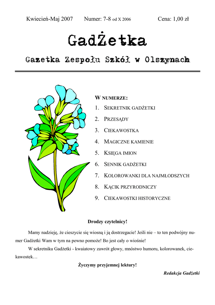 Kwiecień-Maj 2007 Numer: 7-8 od X 2006 Cena: 1,00 zł W NUMERZE: 1. SEKRETNIK GADŻETKI 2. PRZESĄDY 3. CIEKAWOSTKA 4. MAGICZNE KAMIENIE 5. KSIĘGA IMION 6. SENNIK GADŻETKI 7. KOLOROWANKI DLA NAJMŁODSZYCH 8. KĄCIK PRZYRODNICZY 9. CIEKAWOSTKI HISTORYCZNE Drodzy czytelnicy! Mamy nadzieję, że cieszycie się wiosną i ją dostrzegacie! Jeśli nie – to ten podwójny numer Gadżetki Wam w tym na pewno pomoże! Bo jest cały o wiośnie! W sekretniku Gadżetki - kwaiatowy zawrót głowy, mnóstwo humoru, kolorowanek, ciekawostek… Życzymy przyjemnej lektury! Redakcja Gadżetki 1. SEKRETNIK GADŻETKI Kwiaty - nie kwiaty Czy wiesz, że... kuły. Mniam! Niektórzy dodają też kwiatków mniszka lekarskiego do sałatek. Bergamonta to nie kwiat, jak myślą niektórzy, ale jeden z gatunków gorzkiej pomarańczy. Ze skórki niewielkich owoców tego drzewa cytrusowego wyciska się aromatyczny olejek, dodawany do perfum. Czy wiesz, że... Nie tylko owady zapylają kwiaty. Tę samą funkcję spełnia najmniejszy ptak świata - koliber, który żyje w Ameryce Północnej i Południowej. Spijając nektar z kwiatów, zwisa przy nich, wykonując ok. 200 uderzeń skrzydeł na sekundę. Czy wiesz, że... Tylko z róży damasceńskiej otrzymuje się esencje kwiatową dodawaną do perfum. Na jeden gram esencji potrzeba 2 tysięcy płatków, a na 1 kg ok. 5 ton. Czy wiesz, że.. Holenderskie tulipany uznaje się za symbol Holandii, ale naprawdę pochodzą z Turcji. W Europie pojawiły się w XVI w. Nie ma zupełnie czarnych tulipanów, ale niektóre odmiany są bardzo ciemne, dlatego tak się o nich mówi. UWAGA: 1 kg kosztuje ok. 3,5 tys. dolarów. Czy wiesz, że... Kwiaty można jeść. Przykładem takich smacznych kwiatków są kalafiory i bro- Wiosna na talerzu... Jeśli czujecie się zmęczeni, brakuje wam energii, czas na kiełki! Możecie je kupić w sklepie, ale jeszcze lepiej wyhodować na kuchennym parapecie. Najzdrowsze są te ze słonecznika, rzeżuchy oraz rzodkiewki. Dodawajcie je do kanapek, sałatek. Efekty??? - Murowane!!! 2 2. PRZESĄDY domowników. Dlatego do dziś najczęściej przybija się ją w okolicach drzwi wejściowych. Podkowa - podobno podkowa przynosi szczęście. W dawnych czasach wierzono w magiczną moc żelaza i przypisywano symbolikę liczbie gwoździ, którymi przybijano podkowę do końskich kopyt. Stała się ona symbolem ochrony domu i 3. CIEKAWOSTKA ko Ci nieliczni, których mieszkanie było wyposażone w sieć elektryczną. Historia żelazka - już w VII wieku Chińczycy do prasowania jedwabiu stosowali rondle z rozpalonym węglem drzewnym. W wieku XVIII do użycia weszło żelazko rozgrzewane na ogniu. Natomiast elektryczne wynalazł w 1882 roku Henry Seeley. Mogli z niego korzystać tyl- 3 4. MAGICZNE KAMIENIE: Podobno mają niesamowite właściwości, dlatego warto na giełdzie minerałów zaopatrzyć się w choć malutki odłamek. Kwarc różowy - pomaga rozpędzić lęki i troski, zmniejsza zazdrość i agresję, podobno intensyfikuje miłość do siebie i świata. Rubin - wzmacnia poczucie bezpieczeństwa, odwagę oraz życiową energię. Granat - zapewnia radość i pogodę ducha. 5. KSIĘGA IMION Joanna - Imię to jest alternatywną formą imienia Anita oraz żeńskiej formy imienia Jan. Oznacza „łaska Boga”. Charakter: To ekstrawertyczki, uzewnętrzniające swe reakcje i łatwo przystosowujące się do otoczenia. Są zarazem obiektywne - dzięki logice, i subiektywne dzięki uczuciowości. Ta dwoistość ich osobowości nieraz zaskakuje, nawet w dzieciństwie. Odczuwają silną potrzebę dawania czegoś z siebie bądź to bliźnim, bądź sprawie narodowej czy religijnej. Posiadają wrodzony zmysł dyplomatyczny, którym posługują się w każdej 4 sytuacji. Mają doskonałą pamięć i dużą ciekawość świata. Joanny lubią wolność, przez co są niestałe w uczuciach. Aleksandra - Żeński odpowiednik greckiego imienia Aleksander. Popularnym zdrobnieniem tego imienia jest Ola, a na Zachodzie używana jest skrócona forma Sandra, która coraz częściej jest także nadawana w Polsce. Charakter: Osoba sprawiedliwa i obdarzona darem mówienia prawdy, co w życiu sprawia jej wiele kłopotów. Charakter marzycielski, nerwowy i skłonny do przesady. Ponieważ jest typem towarzyskim, a zarazem posiadającym uzdolnienia kierownicze, ma często konflikty z otoczeniem. Posiada piękne i szczytne idee, których nie realizuje - w skutek braku inicjatywy i postanowień. Agnieszka - Imię nadawane od IV wieku n.e.. Wywodzi się z greckiego słowa hagnos oznaczającego „czysty”, „święty”, „bez zmazy”. Charakter: Osoba wrażliwa, spokojna z dużym poczuciem odpowiedzialności, obdarzona wielkimi ideałami. Cechuje ją odwaga i niezależność w działaniu. Nie umie narzucić drugim swojej woli. Jest zawsze dobrą uczennicą. Anna - Imię występujące w Starym i Nowym Testamencie, popularne w wielu krajach. Hebrajskie: channah - łaska, wdzięk. Charakter: Osoba niezwykle oddana współmałżonkowi, dzieciom i całemu do5 mowi. Nie przecenia towarzystwa, lecz także nie stroni od znajomości. Wrażliwa na uroki krajobrazu i piękno wnętrz domowych. Lubi spokój, zgodę i harmonię we własnym środowisku. Jest bardzo umuzykalniona. Potrafi postępować jak dyplomata, choć zdarza się, że swoim naiwnym zachowaniem wszystko burzy. Posiada umiejętności naśladowcze. Ada - Jedno z najstarszych imion niemieckich występujące także w Polsce. Nawiązanie do imienia Adelajdy, żony Ottona Wielkiego (zmarłej w 999 r.). Charakter: Osoba delikatna, kulturalna, powabna, lubiąca piękne otoczenie i przyrodę. Bardzo łaknie wiedzy, gromadzi książki naukowe, a zwłaszcza filozoficzne. Stała w trwaniu przy swoim zdaniu. Posiada subtelne usposobienie i miły wygląd. Jest odważna i wrażliwa na społeczne zjawiska ludzkiego życia. Bartosz - Imię powstało na gruncie polskim jako skrócona forma imienia Bartłomiej. Imię jednego z apostołów w 