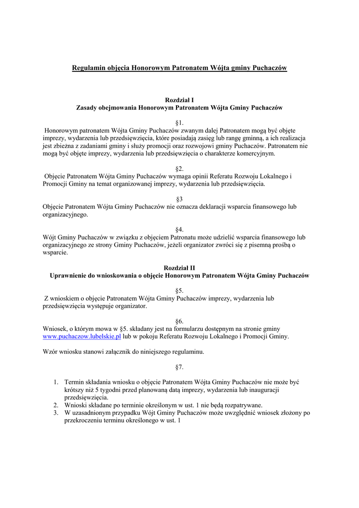 Regulamin objęcia Honorowym Patronatem Wójta gminy Puchaczów