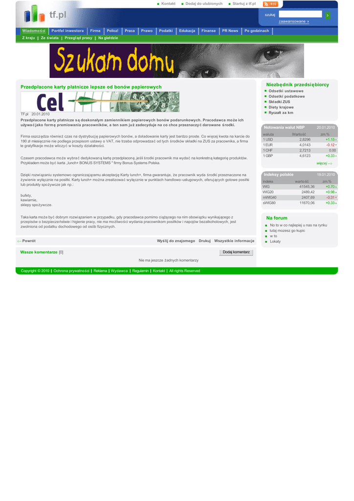 Kontakt Dodaj do ulubionych Startuj z tf.pl tf.pl szukaj zaawansowane » Wiadomo ści Z kraju Portfel inwestora Ze świata Firma Przegl ąd prasy Policz! Praca Prawo Podatki Edukacja Finanse PR News Po godzinach Na giełdzie Niezbędnik przedsiębiorcy Przedpłacone karty płatnicze lepsze od bonów papierowych Odsetki ustawowe Odsetki podatkowe Składki ZUS Diety krajowe Ryczałt za km TF.pl 20.01.2010 Przedpłacone karty płatnicze s ą doskonałym zamiennikiem papierowych bonów podarunkowych. Pracodawca mo że ich używa ć jako form ę premiowania pracowników, a ten sam ju ż zadecyduje na co chce przeznaczy ć darowane środki. Firma oszczędza równie ż czas na dystrybucj ę papierowych bonów, a doładowanie karty jest bardzo proste. Co wi ęcej kwota na karcie do 190 zł miesięcznie nie podlega przepisom ustawy o VAT, nie trzeba odprowadzać od tych środków składki na ZUS za pracownika, a firma te gratyfikacje może wliczy ć w koszty działalności. Czasem pracodawca może wybra ć dedykowaną kartę przedpłaconę, jeśli środki pracownik ma wydać na konkretną kategorię produktów. Przykładem może być karta „lunch+ BONUS SYSTEMS " firmy Bonus Systems Polska. Notowania walut NBP waluta 1 USD 1 EUR 1 CHF 1 GBP Wartość 2,8296 4,0143 2,7213 4,6123 20.01.2010 zm.% +1.15 -0.12 0.00 +0.33 więcej Dzięki rozwiązaniu systemowo ograniczającemu akceptację Karty lunch+, firma gwarantuje, że pracownik wyda środki przeznaczone na żywienie wyłącznie na posiłki. Karty lunch+ można zrealizować wyłącznie w punktach handlowo-usługowych, oferuj ących gotowe posiłki lub produkty spożywcze jak np.: bufety, kawiarnie, sklepy spożywcze. Indeksy polskie indeks WIG WIG20 mWIG40 sWIG80 19.01.2010 warto ść 41545,36 2489,42 2407,69 11670,06 zm.% +0.70 +0.98 -0.31 +0.33 Taka karta może być dobrym rozwiązaniem w przypadku, gdy pracodawca pomimo ciążącego na nim obowiązku wynikającego z przepisów o bezpiecze ństwie i higienie pracy, nie ma możliwości wydania pracownikom posiłków i napojów bezalkoholowych, jest zwolniona od podatku dochodowego od osób fizycznych. Powrót Wyślij do znajomego Drukuj Dodaj komentarz Wasze komentarze [0] Nie ma jeszcze żadnych komentarzy Copyright © 2010 Ochrona prywatności Wszystkie informacje Reklama Wydawca Regulamin Kontakt All rights Reserved Na forum No to w co najlepiej u nas na rynku tutaj mozesz go kupic w to Lokaty