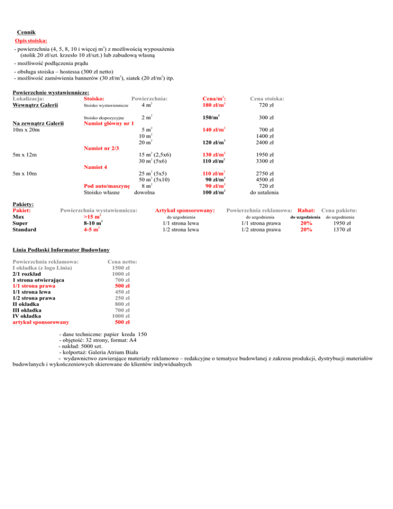 Cennik Opis stoiska: - powierzchnia (4, 5, 8, 10 i więcej m2) z możliwością wyposażenia (stolik 20 zł/szt. krzesło 10 zł/szt.) lub zabudową własną - możliwość podłączenia prądu - obsługa stoiska – hostessa (300 zł netto) - możliwość zamówienia bannerów (30 zł/m2), siatek (20 zł/m2) itp. Powierzchnie wystawiennicze: Lokalizacja: Powierzchnia: Stoisko: Wewnątrz Galerii Stoisko wystawiennicze 4 m2 Stoisko ekspozycyjne Na zewnątrz Galerii 10m x 20m 2 m2 Cena/m2: 180 zł/m2 150/m2 Cena stoiska: 720 zł 300 zł Namiot główny nr 1 5 m2 10 m2 20 m2 120 zł/m2 700 zł 1400 zł 2400 zł 15 m2 (2,5x6) 30 m2 (5x6) 130 zł/m2 110 zł/m2 1950 zł 3300 zł 25 m2 (5x5) 50 m2 (5x10) Pod auto/maszynę 8 m2 Stoisko własne dowolna 110 zł/m2 90 zł/m2 90 zł/m2 100 zł/m2 2750 zł 4500 zł 720 zł do ustalenia 140 zł/m2 Namiot nr 2/3 5m x 12m Namiot 4 5m x 10m Pakiety: Pakiet: Max Super Standard Powierzchnia wystawiennicza: >15 m2 8-10 m2 4-5 m2 Artykuł sponsorowany: Powierzchnia reklamowa: Rabat: do uzgodnienia do uzgodnienia do uzgodnienia 1/1 strona lewa 1/2 strona lewa 1/1 strona prawa 1/2 strona prawa 20% 20% Cena pakietu: do uzgodnienia 1950 zł 1370 zł Linia Podlaski Informator Budowlany Powierzchnia reklamowa: I okładka (z logo Linia) 2/1 rozkład 1 strona otwierająca 1/1 strona prawa 1/1 strona lewa 1/2 strona prawa II okładka III okładka IV okładka artykuł sponsorowany Cena netto: 1500 zł 1000 zł 700 zł 500 zł 450 zł 250 zł 800 zł 700 zł 1000 zł 500 zł - dane techniczne: papier kreda 150 - objętość: 32 strony, format: A4 - nakład: 5000 szt. - kolportaż: Galeria Atrium Biała - wydawnictwo zawierające materiały reklamowo – redakcyjne o tematyce budowlanej z zakresu produkcji, dystrybucji materiałów budowlanych i wykończeniowych skierowane do klientów indywidualnych