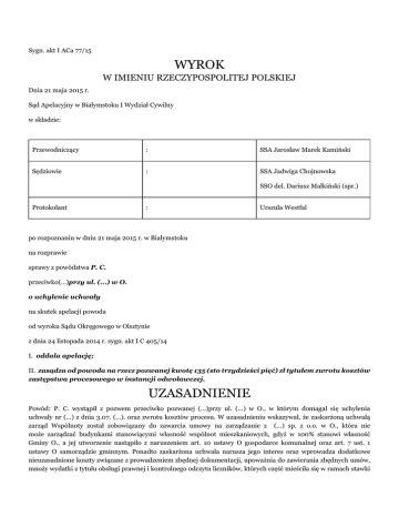 Sygn. akt I ACa 77/15 WYROK W IMIENIU RZECZYPOSPOLITEJ POLSKIEJ Dnia 21 maja 2015 r. Sąd Apelacyjny w Białymstoku I Wydział Cywilny w składzie: Przewodniczący : SSA Jarosław Marek Kamiński Sędziowie : SSA Jadwiga Chojnowska SSO del. Dariusz Małkiński (spr.) Protokolant : Urszula Westfal po rozpoznaniu w dniu 21 maja 2015 r. w Białymstoku na rozprawie sprawy z powództwa P. C. przeciwko(...)przy ul. (...) w O. o uchylenie uchwały na skutek apelacji powoda od wyroku Sądu Okręgowego w Olsztynie z dnia 24 listopada 2014 r. sygn. akt I C 405/14 I. oddala apelację; II. zasądza od powoda na rzecz pozwanej kwotę 135 (sto trzydzieści pięć) zł tytułem zwrotu kosztów zastępstwa procesowego w instancji odwoławczej. UZASADNIENIE Powód: P. C. wystąpił z pozwem przeciwko pozwanej (...)przy ul. (...) w O., w którym domagał się uchylenia uchwały nr (...) z dnia 3.07. (...). oraz zwrotu kosztów procesu. W uzasadnieniu wskazywał, że zaskarżoną uchwałą zarząd Wspólnoty został zobowiązany do zawarcia umowy na zarządzanie z (...) sp. z o.o. w O., która nie może zarządzać budynkami stanowiącymi własność wspólnot mieszkaniowych, gdyż w 100% stanowi własność Gminy O., a jej utworzenie nastąpiło z naruszeniem art. 10 ustawy O gospodarce komunalnej oraz art. 7 ust. 1 ustawy O samorządzie gminnym. Ponadto zaskarżona uchwała narusza jego interes oraz wprowadza dodatkowe nieuzasadnione koszty związane z prowadzeniem zbędnej dokumentacji, upoważnia do zawierania zbędnych umów, mnoży wydatki z tytułu obsługi prawnej i kontrolnego odczytu liczników, których część mieściła się w ramach stawki za zarządzanie dotychczasowego zarządcy. Na rozprawie w dniu 24 listopada 2014 r. zwrócił również uwagę, że uchwała ta nie upoważnia do określenia wysokości wynagrodzenia zarządcy, co narusza zasady prawidłowego zarządu nieruchomością i interesy współwłaścicieli, pozostawiając te kwestie poza ich kontrolą. Pozwana (...) przy ul. (...) w O. wniosła o oddalenie powództwa i zwrot kosztów procesu. Podniosła, że zaskarżona uchwała została podjęta prawidłowo i uzyskała wymaganą większość. Wskazała, że przyczyny powołania Spółki były zasadne, a jej utworzenie nie naruszało przepisów obowiązującego prawa, skoro została wpisana do Krajowego Rejestru Sądowego. Sąd Okręgowy w Olsztynie wyrokiem z dnia 24 listopada 2014 r. oddalił powództwo i zasądził od powoda na rzecz pozwanej kwotę 180 zł tytułem zwrotu kosztów procesu. Powyższy wyrok został wydany na podstawie następujących ustaleń faktycznych: Powód jest członkiem pozwanej Wspólnoty, liczącej więcej niż 7 lokali. Uchwałą nr(...) z dnia 3 lipca (...)., podjętą na zebraniu Wspólnoty większością ponad połowy głosów, liczonych według wysokości udziałów, współwłaściciele postanowili zobowiązać zarząd do zawarcia umowy o zarządzanie z (...) w O., tj. Zakładem (...) sp. z o.o. w O., której udziały w całości należą do Gminy O.. W ramach zakresu działalności tej Spółki mieści się zarządzanie nieruchomościami. W dniu 9 lipca 2014 r. zarząd pozwanej podpisał umowę z w/w podmiotem powierzając jej z dniem 1 października 2014 r. zarządzanie nieruchomością wspólną oraz zlecając m.in. zapewnienie dostaw energii, wody, gazu, odprowadzania ścieków i wywozu nieczystości, prowadzenie księgi finansowej, za wynagrodzeniem w wysokości 0,40 zł za metr kwadratowy powierzchni użytkowej wykupionej przez właścicieli. W ramach wydatków związanych z utrzymaniem nieruchomości wspólnej ujęto m.in. obsługę prawną i kontrolne odczyty podliczników. Poprzedni zarządca wykonywanie tych czynności ujmował w ramach obowiązków objętych wynagrodzeniem za zarządzanie, którego stawka wynosiła 0,56 zł za metr kwadratowy. Oceniając zgromadzony w sprawie materiał dowodowy, Sąd Okręgowy uznał, że powództwo nie zasługuje na uwzględnienie. Powołując się na art. 25 ust. 1 i 1a ustawy z dnia 24.06.1994 r. O własności lokali (tekst jedn. Dz. U. z 2000 r. Nr 80, poz. 903 ze zm. - dalej u.w.l.) wskazał, że właściciel lokalu może zaskarżyć uchwałę do sądu z powodu jej niezgodności z przepisami prawa lub z umową właścicieli lokali albo jeśli narusza ona zasady prawidłowego zarządzania nieruchomością wspólną lub w inny sposób narusza jego interesy. W niniejszej sprawie bezspornym było, że zaskarżona uchwała uzyskała wymaganą bezwzględną większość głosów liczonych według wysokości udziałów. Bez znaczenia była podnoszona w pozwie okoliczność, że część osób głosowała w oparciu o pełnomocnictwa, skoro ustawa O własności lokali nie wyłącza takiej możliwości. Dlatego też Sąd pominął złożony dopiero na rozprawie wniosek o przedstawienie przez pozwaną oryginałów pełnomocnictw, jako spóźniony i nie mający znaczenia dla rozstrzygnięcia sprawy. W niniejszej sprawie sporna była zatem kwestia zgodności z prawem zobowiązania zarządu pozwanej do zawarcia umowy na zarządzanie nieruchomością ze spółką (...) w O. a także potencjalnego naruszenia tym usprawiedliwionego interesu powoda, jako jednego z właścicieli lokali położonych w budynku Wspólnoty. W ocenie Sądu powoływane w pozwie przepisy art. 10 ustawy z dnia 20.12.1996 r. O gospodarce komunalnej (Dz. U. z 2011 r., nr 45, poz. 236 – dalej u.g.k.) oraz art. 7 ust. 1 i art. 9. ust. 2 ustawy z dnia 8.03.1990 r. o samorządzie gminnym (t. jedn. Dz. U. z 2013 r., poz. 594 – dalej u.s.g.) dotyczą zakresu zadań gminy o charakterze użyteczności publicznej (art. 7 u.s.g.), możliwości prowadzenia przez gminy działalności gospodarczej wykraczającej poza te zadania (art. 9 u.s.g.) i przesłanek tworzenia spółek prawa handlowego (art. 10 u.g.k.) a zatem nie odnoszą się do zaskarżonej uchwały, która de facto jedynie zobowiązuje zarząd Wspólnoty do zawarcia umowy o zarządzanie (a