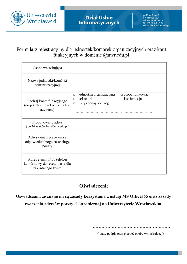 Formularz rejestracyjny dla jednostek/komórek organizacyjnych oraz kont funkcyjnych w domenie @uwr.edu.pl Osoba wnioskująca Nazwa jednostki/komórki administracyjnej Rodzaj konta funkcyjnego (do jakich celów konto ma być używane) □ jednostka organizacyjna □ sekretariat □ inny (podaj poniżej) □ osoba funkcyjna □ konferencja ……………………………………………………… Proponowany adres ( do 20 znaków bez @uwr.edu.pl ) Adres e-mail pracownika odpowiedzialnego za obsługę poczty Adres e-mail i/lub telefon komórkowy do resetu hasła dla zakładanego konta Oświadczenie Oświadczam, że znane mi są zasady korzystania z usługi MS Office365 oraz zasady tworzenia adresów poczty elektronicznej na Uniwersytecie Wrocławskim. ……………………………………………… ( data, podpis oraz pieczęć osoby wnioskującej)