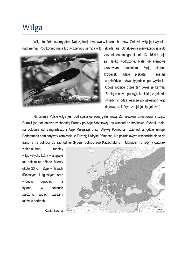 Wilga Wilga to żółto-czarny ptak. Najczęściej przebywa w koronach drzew. Gniazdo wilgi jest wysoko nad ziemią. Pod koniec maja lub w czerwcu samica wilgi składa jaja. Od złożenia pierwszego jaja do złożenia ostatniego mija ok. 13 - 15 dni. Jaja są lekko wydłużone, białe lub kremowe z różowym odcieniem. kropeczki. Małe w gnieździe Mają pisklęta ciemne zostają dwa tygodnie po wykluciu. Oboje rodzice przez ten okres je karmią. Robią to nawet po wyjściu piskląt z gniazda (wtedy chodzą jeszcze po gałęziach tego drzewa, na którym znajduje się gniazdo). Na terenie Polski wilga jest pod ścisłą ochroną gatunkową. Zamieszkuje umiarkowaną część Eurazji (od południowo-zachodniej Europy po Azję Środkową i na wschód od środkowej Syberii, Indie, na południe od Bangladeszu i Azję Mniejszą) oraz Afrykę Północną i Zachodnią, gdzie zimuje. Podgatunek nominatywny zamieszkuje Eurazję i Afrykę Północną. Na południowym wschodzie sięga do Iranu, a na północy do zachodniej Syberii, północnego Kazachstanu i Mongolii. To jedyny gatunek z ciepłolubnej rodziny wilgowatych, który występuje tak daleko na północ. Mierzy około 23 cm. Żyje w lasach liściastych i iglastych oraz w dużych ogrodach, łąkach, w na dolinach rzecznych, sadach i czasami także w parkach. Kasia Bachta