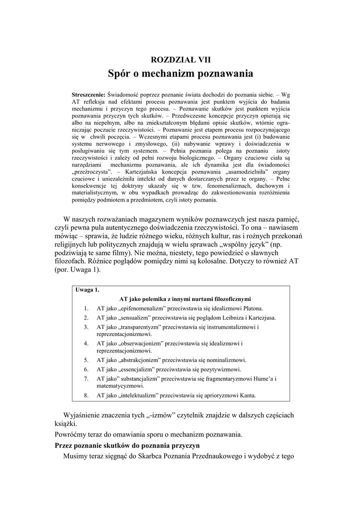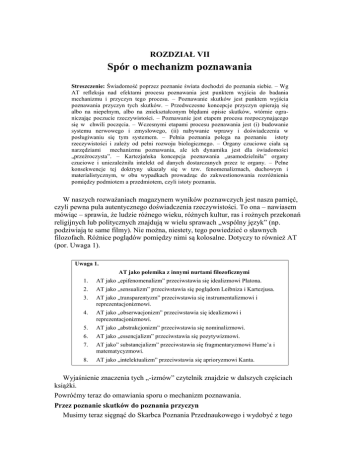 ROZDZIAŁ VII Spór o mechanizm poznawania Streszczenie: Świadomość poprzez poznanie świata dochodzi do poznania siebie. – Wg AT refleksja nad efektami procesu poznawania jest punktem wyjścia do badania mechanizmu i przyczyn tego procesu. – Poznawanie skutków jest punktem wyjścia poznawania przyczyn tych skutków. – Przedwczesne koncepcje przyczyn opierają się albo na niepełnym, albo na zniekształconym błędami opisie skutków, wtórnie ograniczając poczucie rzeczywistości. – Poznawanie jest etapem procesu rozpoczynającego się w chwili poczęcia. – Wczesnymi etapami procesu poznawania jest (i) budowanie systemu nerwowego i zmysłowego, (ii) nabywanie wprawy i doświadczenia w posługiwaniu się tym systemem. – Pełnia poznania polega na poznaniu istoty rzeczywistości i zależy od pełni rozwoju biologicznego. – Organy czuciowe ciała są narzędziami mechanizmu poznawania, ale ich dynamika jest dla świadomości „przeźroczysta”. – Kartezjańska koncepcja poznawania „usamodzielniła” organy czuciowe i uniezależniła intelekt od danych dostarczanych przez te organy. – Pełne konsekwencje tej doktryny ukazały się w tzw. fenomenalizmach, duchowym i materialistycznym, w obu wypadkach prowadząc do zakwestionowania rozróżnienia pomiędzy podmiotem a przedmiotem, czyli istoty poznania. W naszych rozważaniach magazynem wyników poznawczych jest nasza pamięć, czyli pewna pula autentycznego doświadczenia rzeczywistości. To ona – nawiasem mówiąc – sprawia, że ludzie różnego wieku, różnych kultur, ras i rożnych przekonań religijnych lub politycznych znajdują w wielu sprawach „wspólny język” (np. podziwiają te same filmy). Nie można, niestety, tego powiedzieć o sławnych filozofach. Różnice poglądów pomiędzy nimi są kolosalne. Dotyczy to również AT (por. Uwaga 1). Uwaga 1. AT jako polemika z innymi nurtami filozoficznymi 1. AT jako „epifenomenalizm” przeciwstawia się idealizmowi Platona. 2. AT jako „sensualizm” przeciwstawia się poglądom Leibniza i Kartezjusa. 3. AT jako „transparentyzm” przeciwstawia się instrumentalizmowi i reprezentacjonizmowi. 4. AT jako „obserwacjonizm” przeciwstawia się idealizmowi i reprezentacjonizmowi. 5. AT jako „abstrakcjonizm” przeciwstawia się nominalizmowi. 6. AT jako „essencjalizm” przeciwstawia się pozytywizmowi. 7. AT jako” substancjalizm” przeciwstawia się fragmentaryzmowi Hume’a i matematycyzmowi. 8. AT jako „intelektualizm” przeciwstawia się aprioryzmowi Kanta. Wyjaśnienie znaczenia tych „-izmów” czytelnik znajdzie w dalszych częściach książki. Powróćmy teraz do omawiania sporu o mechanizm poznawania. Przez poznanie skutków do poznania przyczyn Musimy teraz sięgnąć do Skarbca Poznania Przednaukowego i wydobyć z tego Skarbca oczywistą dla dziecka prawdę, że łatwiej poznać skutki niż przyczyny. Łatwiej poznać, że drzewo zostało złamane, niż poznać przyczynę tego złamania – czy była to wichura, czy działalność człowieka, szympansa, czy żubra. Łatwiej poznać, że ulica jest mokra, niż poznać przyczynę tego faktu – deszcz, polewaczka … itp. Chociaż myśląc i „coś kombinując” widzę to, co mi do głowy przychodzi”, nie za bardzo rozumiem, dlaczego taki a nie inny jest tok moich myśli. Wielu uczonych nagle zdało sobie sprawę z tego, że jasno rozumieją coś, co dotychczas było dla nich niejasne. Ale który potrafiłby precyzyjnie, krok za krokiem zdać sobie sprawę z tego, jakim cudem rzecz się wyjaśniła? Klasycznym tego przykładem jest odkrycie przez niemieckiego chemika Friedricha Augusta Kekulé von Stradonitz (1829-1896) pierścieniowej struktury benzenu. Przez ok. 40 lat uczeni nie mogli wyjaśnić chemicznej natury związku, który składał się z sześciu atomów węgla, ale miał właściwości bardzo nietypowe. Kekulému (1865), po długim okresie głowienia się nad tym problemem, którejś nocy przyśnił się wąż, który połykał swój ogon. Uczony obudził się i nagle zrozumiał, że te sześć atomów benzenu tworzy zamknięty pierścień z naprzemiennymi pojedynczymi i podwójnymi wiązaniami węgiel-węgiel. Sądzę, że do końca świata nikt precyzyjnie nie zrekonstruuje procesu, który doprowadził do tego odkrycia. Sam uczony tak opisywał swoje odkrycie (cyt. za: Andrzej Wróblewski. Taniec atomów. „Wiedza i Życie”, s. 65, sierpień 2009): „Pewnego letniego dnia powracałem ostatnim omnibusem przez puste w tym czasie ulice tego zwykle ożywionego miasta [Londynu]. Zatonąłem w marzeniach i przed moimi oczami zaczęły krążyć atomy. Zawsze widziałem te małe twory w ruchu. Teraz widziałem, jak dwa mniejsze łączą się ze sobą w pary, jak większe otaczają dwa mniejsze, a jeszcze większe utrzymywały to wszystko w zawrotnym tańcu. Widziałem, jak większe atomy tworzyły łańcuch, wciągając mniejsze, ale tylko na końcach łańcucha (...). Tak powstała teoria strukturowa.” I kolejny opis snu: „Odwróciłem krzesło do kominka i pogrążyłem się w półśnie. Znowu atomy harcowały przed moimi oczami. Tym razem mniejsze grupy trzymały się skromnie z tyłu. Moje duchowe oko, wyostrzone przez powtarzające się podobne wizje, rozróżniło teraz większe twory o różnorodnym kształcie. Długie szeregi, kilkakrotnie ściśle ze sobą złączone, wszystko w ruchu, wijące się wężowato i skręcające się. Patrzę, co się stało? Jeden z węży chwycił swój własny ogon i szyderczo kręcił się przed moimi oczami. Obudziłem się jak rażony piorunem i resztę nocy spędziłem na rozpracowywaniu wniosków z tej hipotezy.” Powody tej dziwnej, choć oczywiście prawdziwej zasady Pierwszeństwa Poznania Skutków, są bardzo skomplikowane. Jednym z powodów jest fakt, że przyczyny są znacznie bardziej złożone niż skutki. Na przykład wyniki działania jakiegoś wydawnictwa obserwujemy w księgarniach i bibliotekach b