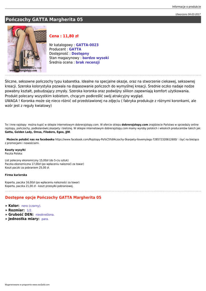 Informacje o produkcie Utworzono 04-03-2017 Pończochy GATTA Margherita 05 Cena : 11,80 zł Nr katalogowy : GATTA-0023 Producent : GATTA Dostępność : Dostępny Stan magazynowy : bardzo wysoki Średnia ocena : brak recenzji Śliczne, seksowne pończochy typu kabaretka. Idealne na specjalne okazje, oraz na stworzenie ciekawej, seksownej kreacji. Szeroka kolorystyka pozwala na dopasowanie pończoch do wymyślnej kreacji. Średnie oczko nadaje nodze powabny kształt, pobudzający zmysły. Szeroka koronka oraz podwójny silikon zapewniają komfort użytkowania. Produkt polecany wszystkim kobietom, chcącym podkreślić swój atrakcyjny wygląd. UWAGA ! Koronka może się nieco różnić od przedstawionej na zdjęciu ( fabryka produkuje z różnymi koronkami, ale wzór jest z reguły kwiatowy) Te i inne rajstopy można kupić w sklepie internetowym dobrerajstopy.com. W ofercie sklepu dobrerajstopy.com znajdziecie Państwo w sprzedaży online rajstopy, pończochy, podkolanówki,skarpety i bieliznę. W sklepie internetowym dobrerajstopy.com mamy wyroby polskich i włoskich producentów takich jak: Gatta, Golden Lady, Omsa, Filodoro, Egeo, JJW. Możecie polubić nas na facebooku https://www.facebook.com/Rajstopy-Po%C5%84czochy-Skarpety-Ilovemylegs-728572320612600/ i być na bieżąco z promocjami i nowościami. Koszty wysyłki Poczta Polska: List polecony ekonomiczny 15,00zł (do 5-ciu sztuk) Paczka ekonomiczna 17,00zł (po wpłaceniu naleznoći za towar) Koszt paczki za pobraniem 25,00 zł. Firma kurierska Koperta, paczka 16,00zł (po wpłaceniu nalezności za towar) Koperta, paczka 21,00 zł - koszt przesyłki pobraniowej. Dostępne opcje Pończochy GATTA Margherita 05 » » » » Kolor: nero (czarny). Rozmiar: 1/2. Grubość DEN: nieokreślona. Jednostka miary: para. Wygenerowano w programie www.oscGold.com