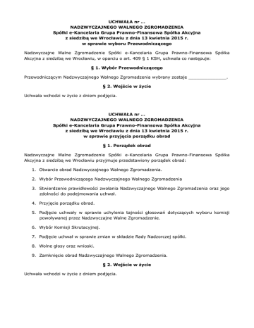 UCHWAŁA nr … NADZWYCZAJNEGO WALNEGO ZGROMADZENIA Spółki e-Kancelaria Grupa Prawno-Finansowa Spółka Akcyjna z siedzibą we Wrocławiu z dnia 13 kwietnia 2015 r. w sprawie wyboru Przewodniczącego Nadzwyczajne Walne Zgromadzenie Spółki e-Kancelaria Grupa Prawno-Finansowa Spółka Akcyjna z siedzibą we Wrocławiu, w oparciu o art. 409 § 1 KSH, uchwala co następuje: § 1. Wybór Przewodniczącego Przewodniczącym Nadzwyczajnego Walnego Zgromadzenia wybrany zostaje ______________. § 2. Wejście w życie Uchwała wchodzi w życie z dniem podjęcia. UCHWAŁA nr … NADZWYCZAJNEGO WALNEGO ZGROMADZENIA Spółki e-Kancelaria Grupa Prawno-Finansowa Spółka Akcyjna z siedzibą we Wrocławiu z dnia 13 kwietnia 2015 r. w sprawie przyjęcia porządku obrad § 1. Porządek obrad Nadzwyczajne Walne Zgromadzenie Spółki e-Kancelaria Grupa Prawno-Finansowa Spółka Akcyjna z siedzibą we Wrocławiu przyjmuje przedstawiony porządek obrad: 1. Otwarcie obrad Nadzwyczajnego Walnego Zgromadzenia. 2. Wybór Przewodniczącego Nadzwyczajnego Walnego Zgromadzenia 3. Stwierdzenie prawidłowości zwołania Nadzwyczajnego Walnego Zgromadzenia oraz jego zdolności do podejmowania uchwał. 4. Przyjęcie porządku obrad. 5. Podjęcie uchwały w sprawie uchylenia tajności głosowań dotyczących wyboru komisji powoływanej przez Nadzwyczajne Walne Zgromadzenie. 6. Wybór Komisji Skrutacyjnej. 7. Podjęcie uchwał w sprawie zmian w składzie Rady Nadzorczej spółki. 8. Wolne głosy oraz wnioski. 9. Zamknięcie obrad Nadzwyczajnego Walnego Zgromadzenia. § 2. Wejście w życie Uchwała wchodzi w życie z dniem podjęcia. UCHWAŁA nr … NADZWYCZAJNEGO WALNEGO ZGROMADZENIA Spółki e-Kancelaria Grupa Prawno-Finansowa Spółka Akcyjna z siedzibą we Wrocławiu z dnia 13 kwietnia 2015 r. w sprawie uchylenia tajności głosowań dotyczących wyboru komisji powoływanej przez nadzwyczajne Walne Zgromadzenie Nadzwyczajne Walne Zgromadzenie, w oparciu o art. 420 § 3 KSH, uchwala co następuje: § 1. Uchylenie tajności Komisji Uchyla się dla potrzeb niniejszego Nadzwyczajnego Walnego Zgromadzenia tajność głosowań dotyczących powołania Komisji Skrutacyjnej. § 2. Wejście w życie Uchwała wchodzi w życie z dniem podjęcia. UCHWAŁA nr … NADZWYCZAJNEGO WALNEGO ZGROMADZENIA Spółki e-Kancelaria Grupa Prawno-Finansowa Spółka Akcyjna z siedzibą we Wrocławiu z dnia 13 kwietnia 2015 r. w sprawie powołania Komisji Skrutacyjnej Nadzwyczajne Walne Zgromadzenie, uchwala co następuje: § 1. Wybór Komisji Skrutacyjnej Powołuje się dla potrzeb niniejszego Nadzwyczajnego Walnego Zgromadzenia Komisję Skrutacyjną w składzie: - ____________________, - ____________________, - ____________________. § 2. Wejście w życie Uchwała wchodzi w życie z dniem podjęcia. UCHWAŁA nr … NADZWYCZAJNEGO WALNEGO ZGROMADZENIA Spółki e-Kancelaria Grupa Prawno-Finansowa Spółka Akcyjna z siedzibą we Wrocławiu z dnia 13 kwietnia 2015r. w sprawie odwołania członka Rady Nadzorczej spółki §1 Działając na podstawie art. 385 § 1 Kodeksu Spółek Handlowych oraz § 20 pkt 2 Statutu Spółki Nadzwyczajne Walne Zgromadzenie Spółki e-Kancelaria Grupa Prawno-Finansowa Spółka Akcyjna z siedzibą we Wrocławiu uchwala co następuje: „Nadzwyczajne Walne Zgromadzenie spółki odwołuje Pana/Panią ………………………………..z funkcji członka Rady Nadzorczej Spółki”. § 2. Wejście w życie Uchwała wchodzi w życie z dniem podjęcia. UCHWAŁA nr … NADZWYCZAJNEGO WALNEGO ZGROMADZENIA Spółki e-Kancelaria Grupa Prawno-Finansowa Spółka Akcyjna z siedzibą we Wrocławiu z dnia 13 kwietnia 2015 r. w sprawie powołania członka Rady Nadzorczej spółki §1 Działając na podstawie art. 385 § 1 Kodeksu Spółek Handlowych oraz § 20 pkt 2 Statutu Spółki Nadzwyczajne Walne Zgromadzenie Spółki e-Kancelaria Grupa Prawno-Finansowa Spółka Akcyjna z siedzibą we Wrocławiu uchwala co następuje: „Nadzwyczajne Walne Zgromadzenie spółki powołuje Pana/Panią………………..na funkcję członka Rady Nadzorczej Spółki”. § 2. Wejście w życie Uchwała wchodzi w życie z dniem podjęcia. UCHWAŁA nr … NADZWYCZAJNEGO WALNEGO ZGROMADZENIA Spółki e-Kancelaria Grupa Prawno-Finansowa Spółka Akcyjna z siedzibą we Wrocławiu z dnia 13 kwietnia 2015r. w sprawie powołania członka Rady Nadzorczej spółki §1 Działając na podstawie art. 385 § 1 Kodeksu Spółek Handlowych oraz § 20 pkt 2 Statutu Spółki Nadzwyczajne Walne Zgromadzenie Spółki e-Kancelaria Grupa Prawno-Finansowa Spółka Akcyjna z siedzibą we Wrocławiu uchwala co następuje: „Nadzwyczajne Walne Zgromadzenie spółki powołuje Pana/Panią………………..na funkcję członka Rady Nadzorczej Spółki”. § 2. Wejście w życie Uchwała wchodzi w życie z dniem podjęcia.