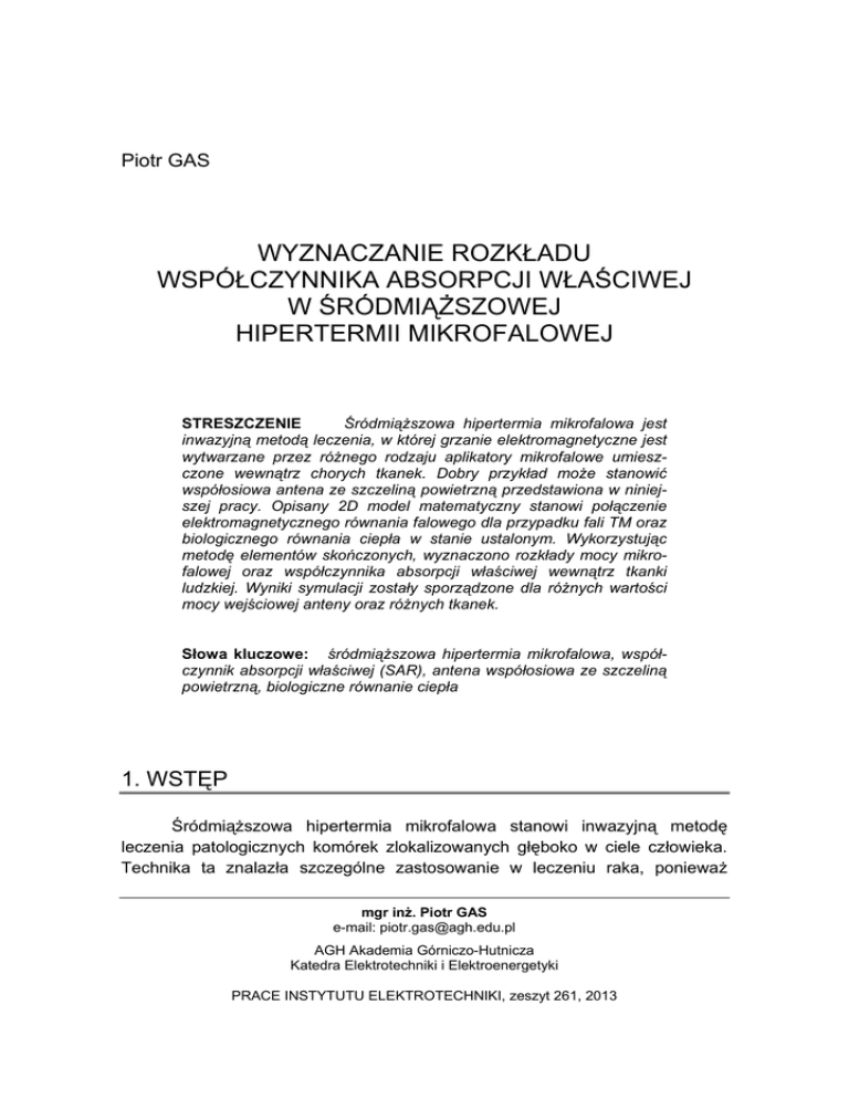 Piotr GAS WYZNACZANIE ROZKŁADU WSPÓŁCZYNNIKA ABSORPCJI WŁAŚCIWEJ W ŚRÓDMIĄŻSZOWEJ HIPERTERMII MIKROFALOWEJ STRESZCZENIE Śródmiąższowa hipertermia mikrofalowa jest inwazyjną metodą leczenia, w której grzanie elektromagnetyczne jest wytwarzane przez różnego rodzaju aplikatory mikrofalowe umieszczone wewnątrz chorych tkanek. Dobry przykład może stanowić współosiowa antena ze szczeliną powietrzną przedstawiona w niniejszej pracy. Opisany 2D model matematyczny stanowi połączenie elektromagnetycznego równania falowego dla przypadku fali TM oraz biologicznego równania ciepła w stanie ustalonym. Wykorzystując metodę elementów skończonych, wyznaczono rozkłady mocy mikrofalowej oraz współczynnika absorpcji właściwej wewnątrz tkanki ludzkiej. Wyniki symulacji zostały sporządzone dla różnych wartości mocy wejściowej anteny oraz różnych tkanek. Słowa kluczowe: śródmiąższowa hipertermia mikrofalowa, współczynnik absorpcji właściwej (SAR), antena współosiowa ze szczeliną powietrzną, biologiczne równanie ciepła 1. WSTĘP Śródmiąższowa hipertermia mikrofalowa stanowi inwazyjną metodę leczenia patologicznych komórek zlokalizowanych głęboko w ciele człowieka. Technika ta znalazła szczególne zastosowanie w leczeniu raka, ponieważ mgr inż. Piotr GAS e-mail: [email protected] AGH Akademia Górniczo-Hutnicza Katedra Elektrotechniki i Elektroenergetyki PRACE INSTYTUTU ELEKTROTECHNIKI, zeszyt 261, 2013 16 P. Gas umożliwia grzanie guzów, minimalnie wpływając na otaczające je zdrowe tkanki [9]. Zwykle w miejsce chorobowych tkanek wbijane są elektrody igłowe, wytwarzające pola o wysokiej częstotliwości, anteny mikrofalowe, przetworniki ultradźwiękowe, przewodniki światłowodowe, jak również wstrzykiwane są nano-cząsteczki lub ciecze ferromagnetyczne. Przeprowadzone badania wykazały, że wysoka temperatura z zakresu 40-46°C może doprowadzić do martwicy komórek znajdujących się w odległości 1-2 cm od źródła ciepła [7]. Opisana technika jest odpowiednia do leczenia guzów o średnicy nieprzekraczającej 5 cm [1]. Co więcej, śródmiąższowa hipertermia mikrofalowa osiągnęła pozytywne wyniki kliniczne w połączeniu z radioterapią i chemioterapią [9]. Metoda ta obecnie zyskuje nowe pola zastosowań, np. w leczeniu guzów wątroby, piersi, nerek, kości i płuc [7], dlatego też tkanki te uwzględniono w symulacji przedstawionej w niniejszej pracy. W celu określenia maksymalnych dopuszczalnych skutków ekspozycji na pola elektromagnetyczne wysokich częstotliwości (100 kHz-10 GHz) występujących wewnątrz organizmów żywych, Międzynarodowa Komisja ds. Ochrony przed Promieniowaniem Niejonizującym (ICNIRP) wprowadziła pojęcie współczynnika absorpcji właściwej (SAR), który określa ilość energii elektromagnetycznej pochłoniętej przez jednostkową masę ciała [8]. Istnieje wiele badań dotyczących wykorzystania hipertermii w leczeniu raka, co dowodzi, że aspekt ten jest wciąż ważny i konieczne są dalsze badania w tym zakresie [4, 5, 6]. Obecnie, uczeni poszukują nowych technik, które uczynią hipertermię prostszą, bezpieczniejszą, bardziej efektywną i powszechnie dostępną metodą leczenia raka. Obiecujące wydają się próby wykorzystania nanotechnologii w leczeniu ciepłem, a w szczególności hipertermii cieczy magnetycznej (ang. magnetic fluid hyperthermia), która w ostatnim czasie znajduje się w fazie intensywnych badań i z którą wiąże się duże nadzieje [12]. Mówiąc o hipertermii nie można zapomnieć o jej kontekście historycznym. Istotne fakty z historii hipertermii oraz ich związki ze współczesną medycyną zostały opisane w [3]. 2. PODSTAWOWE RÓWNANIA I OPIS MODELU W modelu przedstawionym na rysunku 1 przyjęto, że antena współosiowa składa się z wewnętrznego przewodnika, dielektryka, zewnętrznego przewodnika i plastikowej osłony, która pełni funkcje ochronną dla pozostałych elementów anteny. Ze względu na symetrię osiową, w modelu są używane współrzędne walcowe r, φ, z, a szczelina powietrzna ma wymiar d. 17 Wyznaczanie rozkładu współczynnika absorpcji właściwej w śródmiąższowej hipertermii… oś symetrii obszar obliczeniowy wewnętrzny przewodnik dielektryk r4 plastikowa osłona r1 r3 r2 zewnętrzny przewodnik tkanka d szczelina powietrzna Rys. 1. Przekrój poprzeczny przez antenę współosiową ze szczeliną powietrzną (po lewej) oraz schemat poglądowy modelu obliczeniowego (po prawej) Wyprowadzenie podstawowych zależności rozpocznijmy od równań Maxwella w dziedzinie częstotliwości zdefiniowanych jako: H J j D (1) E j B (2) gdzie E i H są odpowiednio zespolonymi wektorami natężenia pola elektrycznego i magnetycznego, ω stanowi pulsację pola elektromagnetycznego. Dodatkowo, D i B są odpowiednio zespolonymi wektorami indukcji elektrycznej i magnetycznej, a J jest zespolonym wektorem gęstości prądu. Uwzględniając prawo Ohma w postaci różniczkowej oraz zależności materiałowe dla ośrodków jednorodnych, liniowych i izotropowych, powyższe równania przyjmują następującą postać: H j 0 r j E 0 (3) E j0 r H (4) gdzie ε0 i μ0 stanowią odpowiednio przenikalność elektryczną i magnetyczną próżni, εr i μr są względną przenikalnością elektryczną i magnetyczną danego ośrodka, a σ jest przewodnością elektryczną danego ośrodka. Następnie, działając operatorem rotacji na obie strony równania (3) oraz po podstawieniu zależności (4) do tak otrzymanego równania, można wyprowadzić następujące równanie wektorowe opisujące rozkład pola magnetycznego w badanym obszarze: 18 P. Gas 1 r H 0 0 r 2 H 0 (5) gdzie εr jest zespoloną względną przenikalnością elektryczną danego ośrodka zdefiniowaną jako r r j 0 (6) W przedstawionym modelu wykorzystano fale TM (ang. transverse magnetic), zatem nie występują żadne zmiany pola elektrycznego w kierunku osi φ. Natężenie pola m