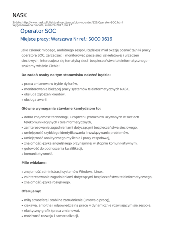 NASK Źródło: http://www.nask.pl/pl/aktualnosci/praca/pion-nc-cyber/126,Operator-SOC.html Wygenerowano: Sobota, 4 marca 2017, 04:17 Operator SOC Miejsce pracy: Warszawa Nr ref.: SOCO 0616 Jako członek młodego, ambitnego zespołu będziesz miał okazję poznać tajniki pracy operatora SOC, zarządzać i monitorować pracę sieci szkieletowej i urządzeń sieciowych. Interesujesz się tematyką sieci i bezpieczeństwa teleinformatycznego – szukamy właśnie Ciebie! Do zadań osoby na tym stanowisku należeć będzie: ● praca zmianowa w trybie dyżurów, ● monitorowanie bieżącej pracy systemów teleinformatycznych NASK, ● obsługa zgłoszeń klientów, ● obsługa awarii. Główne wymagania stawiane kandydatom to: ● dobra znajomość technologii, urządzeń i protokołów używanych w sieciach telekomunikacyjnych i teleinformatycznych, ● zainteresowanie zagadnieniami dotyczącymi bezpieczeństwa sieciowego, ● umiejętność szybkiego identyfikowania i rozwiązywania problemów, ● umiejętność analitycznego myślenia i pracy zespołowej, ● znajomość języka angielskiego przynajmniej w stopniu komunikatywnym, ● gotowość do podnoszenia kwalifikacji, ● komunikatywność. Mile widziane: ● znajomość administracji systemów Windows, Linux, ● zainteresowanie zagadnieniami dotyczącymi bezpieczeństwa teleinformatycznego, ● znajomość języka rosyjskiego. Oferujemy: ● miłą atmosferę i stabilne zatrudnienie (umowa o pracę), ● ciekawą, ambitną i odpowiedzialną pracę w dynamicznie rozwijającym się zespole, ● elastyczny grafik (praca zmianowa), ● możliwość rozwoju i samorealizacji, ● dostęp do najnowszych technologii, ● ciekawą ścieżkę kariery, możliwość awansu w strukturze NCCyber, ● pakiet socjalny (opieka medyczna, MultiSport). Jeśli chcesz dołączyć do naszego zespołu, wyślij CV oraz list motywacyjny na adres mailowy [email protected]. W tytule maila wpisz numer referencyjny stanowiska: SOCO 0616. Dokumenty opatrz klauzulą: „Wyrażam zgodę na przetwarzanie danych osobowych zawartych w mojej ofercie pracy dla potrzeb niezbędnych do realizacji procesu rekrutacji (zgodnie z Ustawą z dn. 29.08.1997 r. o Ochronie Danych Osobowych, Dz. U. Nr 133 poz. 883 z późn. zm.)”. W przypadku pozytywnej weryfikacji nadesłanej aplikacji, niezwłocznie się z Tobą skontaktujemy. Powodzenia!