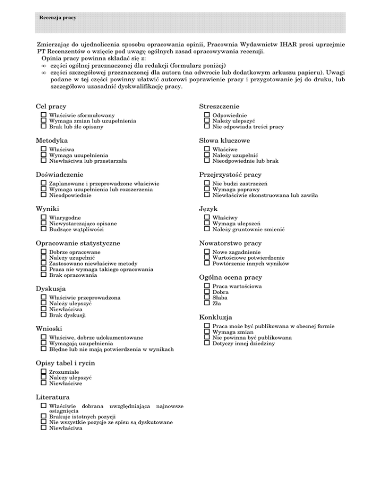 Recenzja pracy Zmierzając do ujednolicenia sposobu opracowania opinii, Pracownia Wydawnictw IHAR prosi uprzejmie PT Recenzentów o wzięcie pod uwagę ogólnych zasad opracowywania recenzji. Opinia pracy powinna składać się z: • części ogólnej przeznaczonej dla redakcji (formularz poniżej) • części szczegółowej przeznaczonej dla autora (na odwrocie lub dodatkowym arkuszu papieru). Uwagi podane w tej części powinny ułatwić autorowi poprawienie pracy i przygotowanie jej do druku, lub szczegółowo uzasadnić dyskwalifikację pracy. Cel pracy Właściwie sformułowany Wymaga zmian lub uzupełnienia Brak lub źle opisany Metodyka Właściwa Wymaga uzupełnienia Niewłaściwa lub przestarzała Doświadczenie Zaplanowane i przeprowadzone właściwie Wymaga uzupełnienia lub rozszerzenia Nieodpowiednie Wyniki Wiarygodne Niewystarczająco opisane Budzące wątpliwości Opracowanie statystyczne Dobrze opracowane Należy uzupełnić Zastosowano niewłaściwe metody Praca nie wymaga takiego opracowania Brak opracowania Dyskusja Właściwie przeprowadzona Należy ulepszyć Niewłaściwa Brak dyskusji Wnioski Właściwe, dobrze udokumentowane Wymagają uzupełnienia Błędne lub nie mają potwierdzenia w wynikach Opisy tabel i rycin Zrozumiałe Należy ulepszyć Niewłaściwe Literatura Właściwie dobrana uwzględniająca najnowsze osiągnięcia Brakuje istotnych pozycji Nie wszystkie pozycje ze spisu są dyskutowane Niewłaściwa Streszczenie Odpowiednie Należy ulepszyć Nie odpowiada treści pracy Słowa kluczowe Właściwe Należy uzupełnić Nieodpowiednie lub brak Przejrzystość pracy Nie budzi zastrzeżeń Wymaga poprawy Niewłaściwie skonstruowana lub zawiła Język Właściwy Wymaga ulepszeń Należy gruntownie zmienić Nowatorstwo pracy Nowe zagadnienie Wartościowe potwierdzenie Powtórzenie innych wyników Ogólna ocena pracy Praca wartościowa Dobra Słaba Zła Konkluzja Praca może być publikowana w obecnej formie Wymaga zmian Nie powinna być publikowana Dotyczy innej dziedziny