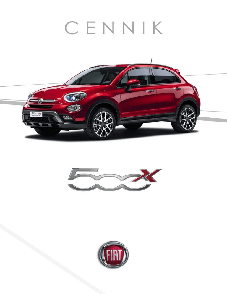 CENNIK Fi a t 5 0 0 X M Y 1 7 ROK PRODUKCJI 2017 SILNIKI BENZYNOWE 1.6 E-Torq 110 KM FWD POP POP STAR LOUNGE CROSS CROSS PLUS 56 700 65 300 73 300 69 300 77 300 66 300 74 300 70 300 78 300 1.4 Multiair 140 KM FWD – 74 300 82 300 78 300 86 300 75 300 83 300 79 300 87 300 1.4 Multiair 140 KM DDCT FWD – 80 800 88 800 84 800 92 800 81 800 89 800 85 800 93 800 1.4 Multiair 170 KM AT9 AWD – – – – 101 800 1.3 MultiJet 95 KM FWD – 73 300 81 300 74 300 82 300 – – 1.6 MultiJet 120 KM FWD – 77 300 85 300 81 300 78 300 86 300 82 300 – 1.6 MultiJet 120 DDCT KM FWD – 83 800 91 800 87 800 84 800 92 800 88 800 2.0 MultiJet 140 KM AWD – – – – 96 300 2.0 MultiJet 140 KM AT9 AWD – – – – 106 300 102 800 SILNIKI DIESL A Wszystkie samochody osobowe marki Fiat (z wyłączeniem Sedici) sprzedane od 1.01.2012 i zakupione w punktach sprzedaży dealerów Fiata w Polsce, posiadają 2-letnią gwarancję bez limitu kilometrów. W całym okresie ważności tej gwarancji Klient otrzymuje usługę ASSISTANCE 24h, ważną na terenie całej Europy. Podane informacje na temat gwarancji pojazdu nie stanowią udzielenia kupującemu gwarancji, w szczególności w rozumieniu art. 13 Ustawy z dnia 27 lipca 2002 r. o szczególnych warunkach sprzedaży konsumenckiej oraz o zmianie Kodeksu cywilnego. Gwarancja zostanie udzielona przy sprzedaży pojazdu, a jej warunki zostaną określone w dokumencie gwarancyjnym. Fiat zastrzega sobie prawo do wprowadzenia w dowolnym momencie zmian w modelach opisanych w niniejszym cenniku z powodów natury technicznej lub handlowej. Szczegóły w salonie sprzedaży. Cennik zawiera ceny detaliczne w złotych z VAT. Ceny zawierają podatek akcyzowy. Ceny mogą ulec zmianom bez uprzedniego zawiadomienia w przypadku zmian cen przez producenta, zmian podatkowych, przepisów celnych lub innych przyczyn. Wyposażenie seryjne i dodatkowe poszczególnych modeli może ulegać zmianom w zależności od potrzeb poszczególnych rynków i wymogów prawnych. Dane w niniejszym cenniku mają charakter orientacyjny i nie stanowią oferty w rozumieniu Kodeksu Cywilnego. – 97 300 107 300 PAKIETY WYDŁUŻONEJ GWARANCJI MAXIMUM CARE Paleta usług przygotowanych pod kątem Twojego samochodu, zapewniająca, że wszystkie naprawy serwisowe są wykonywane u Dealerów i w Autoryzowanych Stacjach Obsługi marki FIAT w Europie, przez wysoko kwalifikowanych i odpowiednio wyspecjalizowanych techników, z zastosowaniem oryginalnych części zamiennych. Maximum Care jest to najbardziej kompleksowy program Mopar® Vehicle Protection. Zapewnia zabezpieczenie Twojego samochodu przed usterkami komponentów mechanicznych i elektrycznych w zakresie określonym umową, umożliwiając wybór okresu trwania gwarancji w zależności od Twoich potrzeb i preferencji. Do wyboru jest kilka wariantów zależnych od czasu i granicznego przebiegu, które przewidują wydłużenie gwarancji posiadanego pojazdu o: • + 1 rok i do 45 000 lub do 90 000 lub do 120 000 km (opcja – 3 lata gwarancji), • + 2 lata i do 60 000 lub do 120 000 km lub do 160 000 km (opcja – 4 lata gwarancji), • + 3 lata i do 75 000 lub do 150 000 km lub do 200 000 km (opcja – 5 lat gwarancji). LIMIT KILOMETRÓW WARIANT do 3 lat silnik benzynowy do 3 lat silnik Diesla 45 000 90 000 120 000 690 zł 990 zł 1 090 zł 990 zł 1 790 zł 1 990 zł do 4 lat silnik benzynowy do 4 lat Fi a t 5 0 0 X M Y 1 7 silnik Diesla 60 000 75 000 150 000 160 000 1 490 zł 1 890 zł 2 090 zł 2 490 zł 3 690 zł 3 990 zł do 5 lat silnik benzynowy do 5 lat silnik Diesla 200 000 2 490 zł 3 290 zł 3 490 zł 3 990 zł 5 990 zł 6 590 zł PAKIETY SERWISOWE EASY CARE Pakiety zapewniają obsługę serwisową pojazdu zgodnie z zaleceniami producenta, w wybranym wariancie czasowym z określonym limitem przebiegu. Pakiet obejmuje wskazane jako obowiązkowe w harmonogramie serwisowym podanym w Instrukcji Obsługi, wszystkie czynności, kontrole i wymiany w zakresie przeglądów i obsług okresowych oraz części, oleje i płyny eksploatacyjne konieczne do tych wymian. Z pakietu można korzystać w dowolnym Autoryzowanym Serwisie FIAT w Polsce, a profesjonalna obsługa i wysoka jakość napraw, także poza pakietowych, gwarantują utrzymanie pojazdu w prawidłowym, wysokim stanie technicznym i spokojną jego eksploatację w długim okresie. Do wyboru są poniższe warianty pakietu EASY CARE, zależne od okresu i granicznego przebiegu pojazdu (co nastąpi pierwsze): • do 3 lat i do 45 000 lub do 90 000 km lub do 120 000 km, • do 4 lat i do 60 000 lub do 120 000 km lub do 160 000 km, • do 5 lat i do 75 000 lub do 150 000 km lub do 200 000 km. LIMIT KILOMETRÓW WARIANT do 3 lat silnik benzynowy do 3 lat silnik Diesla 90 000 120 000 2 390 zł 45 000 5 880 zł 8 090 zł 2 190 zł 2 990 zł 5 330 zł do 4 lat silnik benzynowy do 4 lat silnik Diesla 60 000 75 000 150 000 160 000 3 830 zł 8 090 zł 9 740 zł 2 940 zł 5 330 zł 6 440 zł do 5 lat silnik benzynowy do 5 lat silnik Diesla 4 290 zł 9 580 zł 3 390 zł 5 580 zł 200 000 7 960 zł FINANSOWANIE KREDYT ROK BEZ RAT ROK/0 • WPŁATA WŁASNA - 50% • JEDNORAZOWA SPŁATA KREDYTU PO 12 MIESIĄCACH LEASING NOWY • NISKIE RATY LEASINGOWE • BRAK ZAŚWIADCZEŃ ZUS I US ORAZ DOKUMENTÓW REJESTROWYCH • SPŁATA W KOLEJNYCH 84 MIESIĘCZNYCH RATACH SPECJALNE OFERTY LEASINGOWE KREDYT Z RATAMI ROCZNYMI 3x33, 4x25, 5x20 • MINIMALNA WPŁATA WŁASNA - 20% • PIERWSZY CZYNSZ 0% • ATRAKCYJNY CAŁKOWITY KOSZT LEASINGU LUB 3x33 4x25 5x20 LEASING NOWY LEASING • NISKI CAŁKOWITY KOSZT LEASINGU • OKRES KREDYTU 24-48 MIESIĘCY • WARUNKI LEASINGU SZYTE NA MIARĘ • RATY PŁATNE CO 12 MIESIĘCY • ELASTYCZNA WYSOKOŚĆ WYKUPU SAMOCHODU - Z GWARANCJĄ WYKUPU PRZEZ WYBRANYCH DEALERÓW • BRAK ZAŚWIADCZEŃ ZUS I US ORAZ DOKUMENTÓW REJESTROWYCH MIÓD MALINA KREDYT MIÓD-MALINA UBEZPIECZENIA • NAJLEPSZY PRODUKT FINANSOWY ROKU 2015 (TYTUŁ NADANY PRZEZ CENTRALNE BIURO CERTYFIKACJI KRAJOWEJ SP. Z O.O.) • U