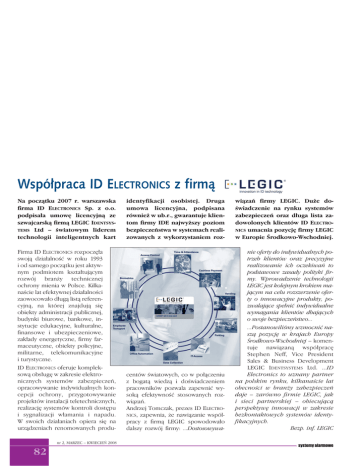 Współpraca ID ELECTRONICS z firmą Na początku 2007 r. warszawska firma ID ELECTRONICS Sp. z o.o. podpisała umowę licencyjną ze szwajcarską firmą LEGIC IDENTSYSTEMS Ltd – światowym liderem technologii inteligentnych kart Firma ID ELECTRONICS rozpoczęła swoją działalność w roku 1993 i od samego początku jest aktywnym podmiotem kształtującym rozwój branży technicznej ochrony mienia w Polsce. Kilkanaście lat efektywnej działalności zaowocowało długą listą referencyjną, na której znajdują się obiekty administracji publicznej, budynki biurowe, bankowe, instytucje edukacyjne, kulturalne, finansowe i ubezpieczeniowe, zakłady energetyczne, firmy farmaceutyczne, obiekty policyjne, militarne, telekomunikacyjne i turystyczne. ID ELECTRONICS oferuje kompleksową obsługę w zakresie elektronicznych systemów zabezpieczeń, opracowywanie indywidualnych koncepcji ochrony, przygotowywanie projektów instalacji teletechnicznych, realizację systemów kontroli dostępu i sygnalizacji włamania i napadu. W swoich działaniach opiera się na urządzeniach renomowanych produnr 2, MARZEC – KWIECIEŃ 2008 82 identyfikacji osobistej. Druga umowa licencyjna, podpisana również w ub.r., gwarantuje klientom firmy IDE najwyższy poziom bezpieczeństwa w systemach realizowanych z wykorzystaniem roz- wiązań firmy LEGIC. Duże doświadczenie na rynku systemów zabezpieczeń oraz długa lista zadowolonych klientów ID ELECTRONICS umacnia pozycję firmy LEGIC w Europie Środkowo-Wschodniej. centów światowych, co w połączeniu z bogatą wiedzą i doświadczeniem pracowników pozwala zapewnić wysoką efektywność stosowanych rozwiązań. Andrzej Tomczak, prezes ID ELECTRONICS, zapewnia, że nawiązanie współpracy z firmą LEGIC spowodowało dalszy rozwój firmy: ...Dostosowywa- nie oferty do indywidualnych potrzeb klientów oraz precyzyjne realizowanie ich oczekiwań to podstawowe zasady polityki firmy. Wprowadzenie technologii LEGIC jest kolejnym krokiem mającym na celu rozszerzenie oferty o innowacyjne produkty, pozwalające spełnić indywidualne wymagania klientów dbających o swoje bezpieczeństwo... ...Postanowiliśmy wzmocnić naszą pozycję w krajach Europy Środkowo-Wschodniej – komentuje nawiązaną współpracę Stephen Neff, Vice President Sales & Business Development LEGIC IDENTSYSTEMS Ltd. ...ID Electronics to uznany partner na polskim rynku, kilkanaście lat obecności w branży zabezpieczeń daje – zarówno firmie LEGIC, jak i sieci partnerskiej – obiecującą perspektywę innowacji w zakresie bezkontaktowych systemów identyfikacyjnych. Bezp. inf. LEGIC